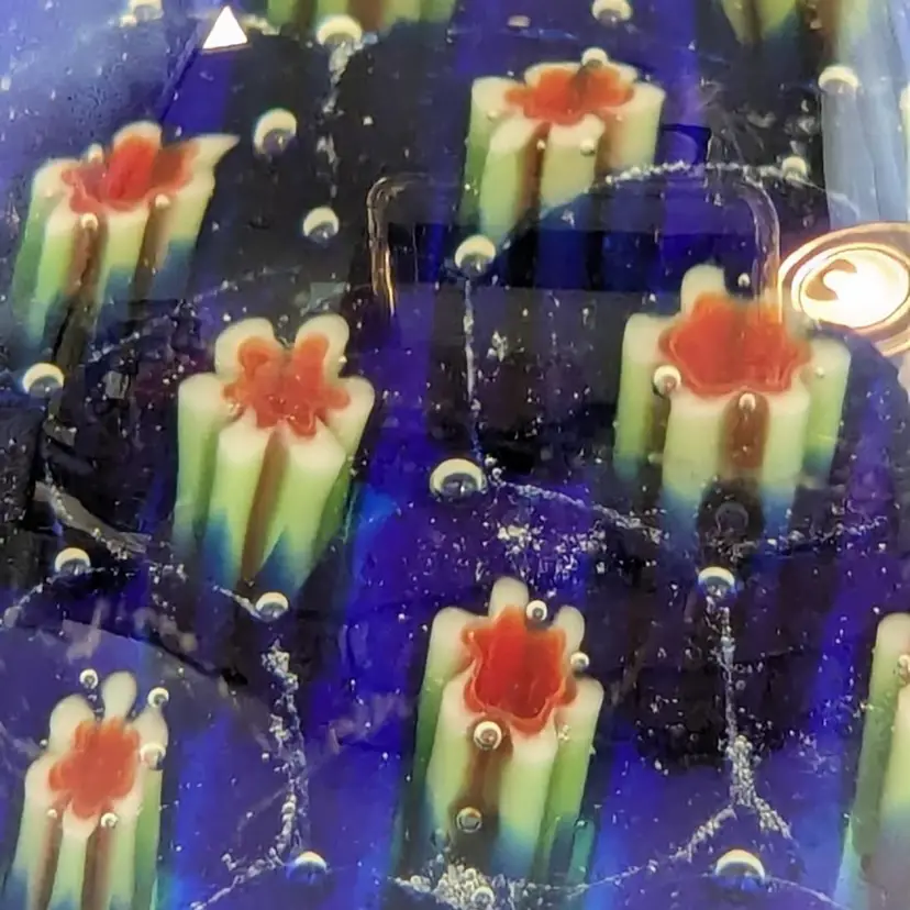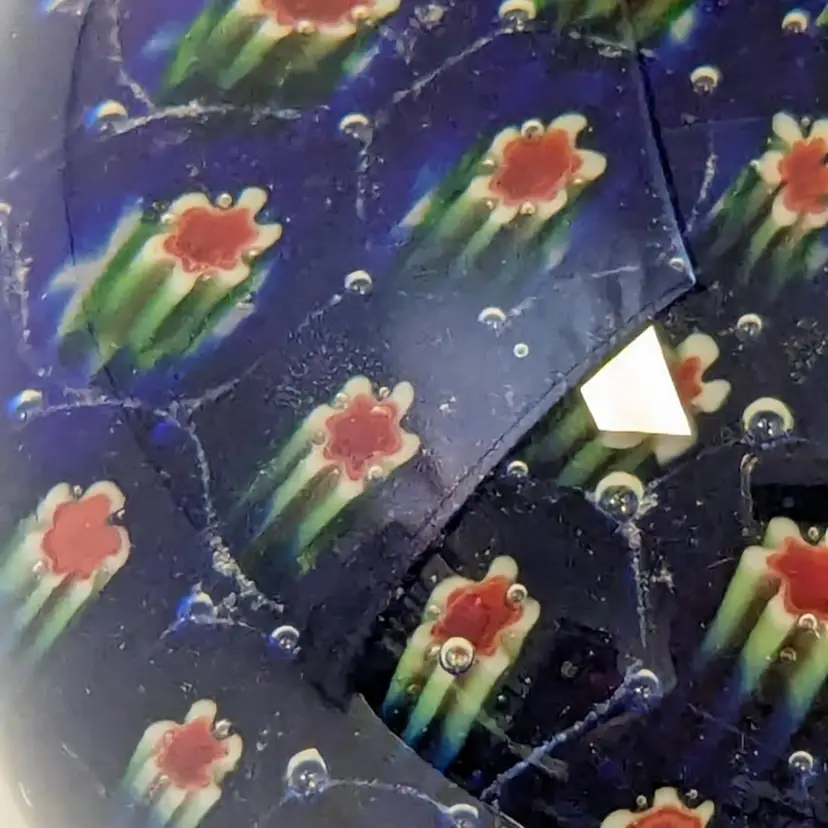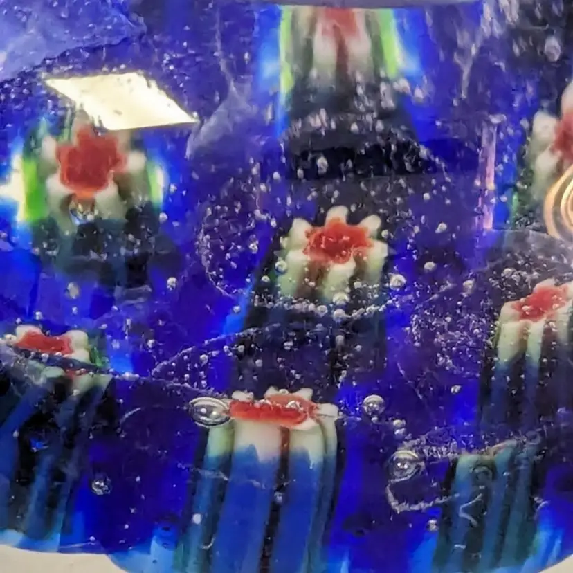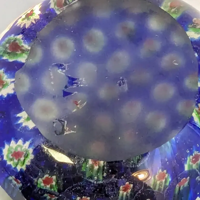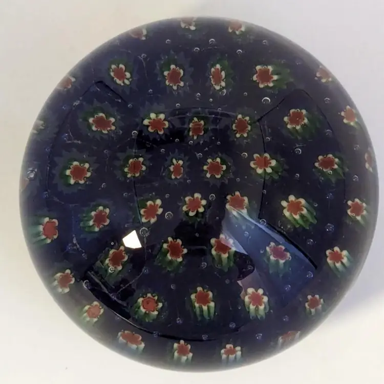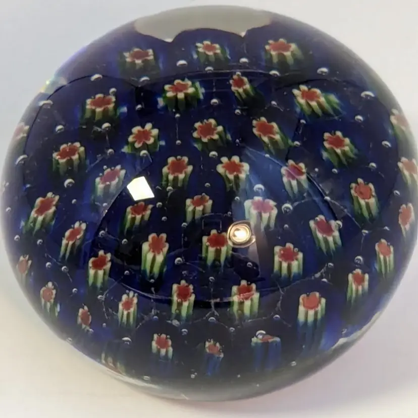 Beautiful blue paperweight with red, white and green flowers. Good condition. Measures 3" in diameter.