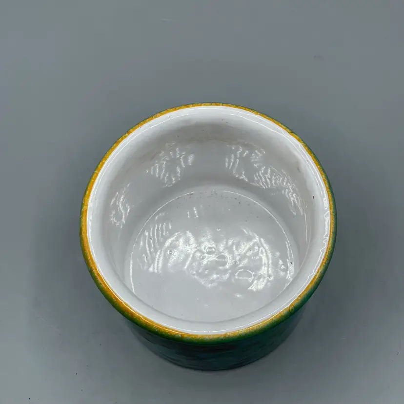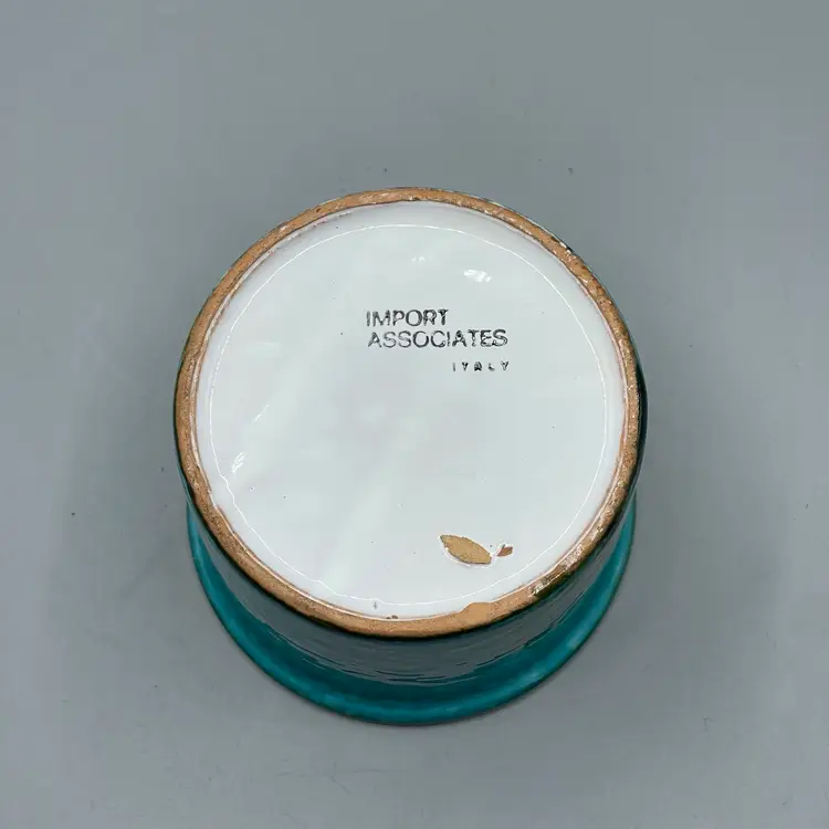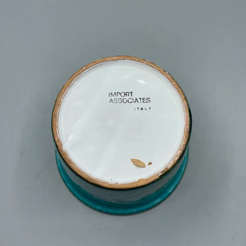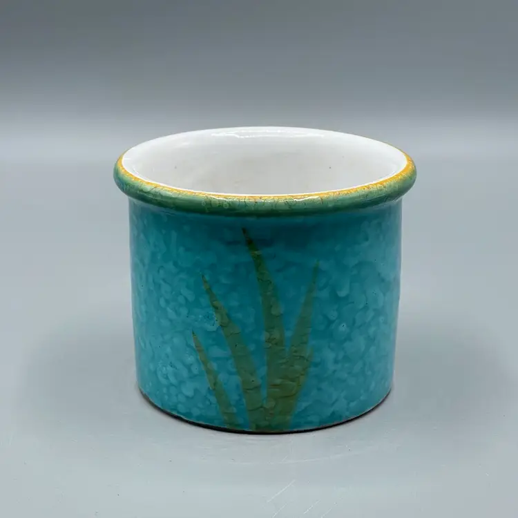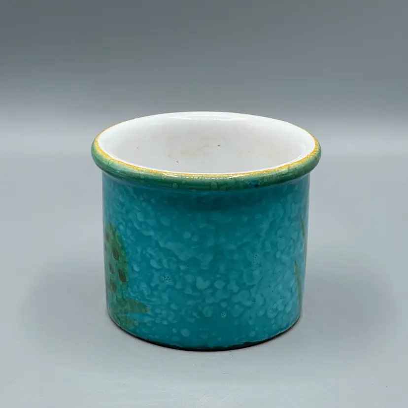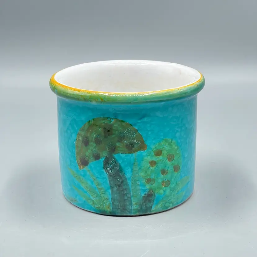 This charming little mushroom decorated Italian pottery crock has dozens of uses. In the kitchen, as a planter, on your desk, or on a shelf. The vibrant blue glaze with the white interior makes this a great pop of color in any room. There are no chips or cracks and it stands at 3-1/4 inches tall and 4 inches in diameter.