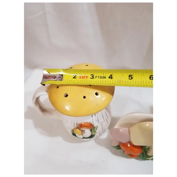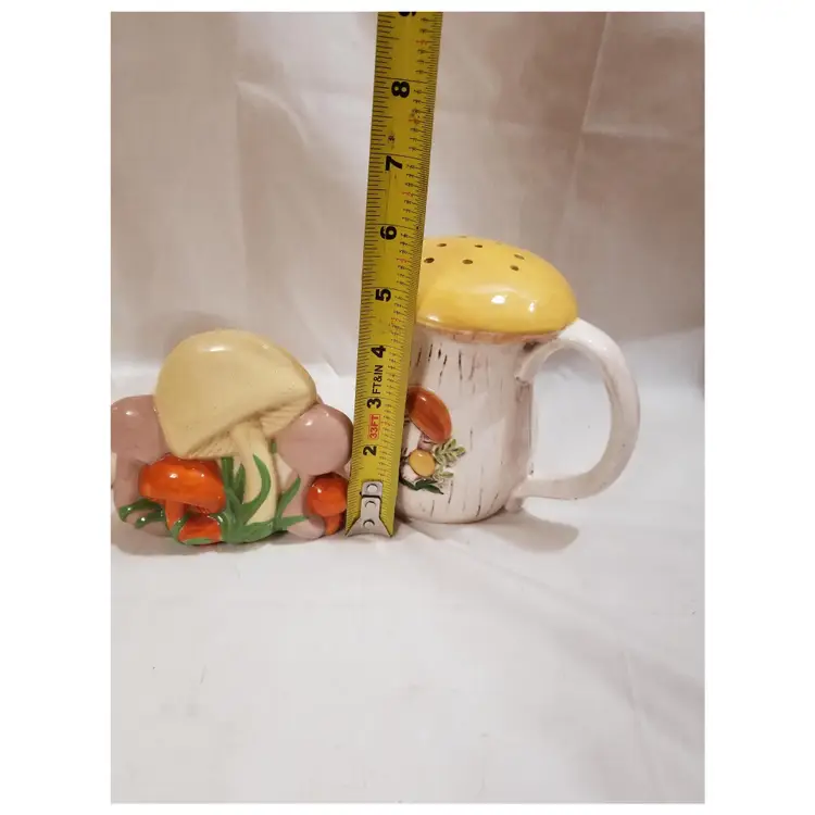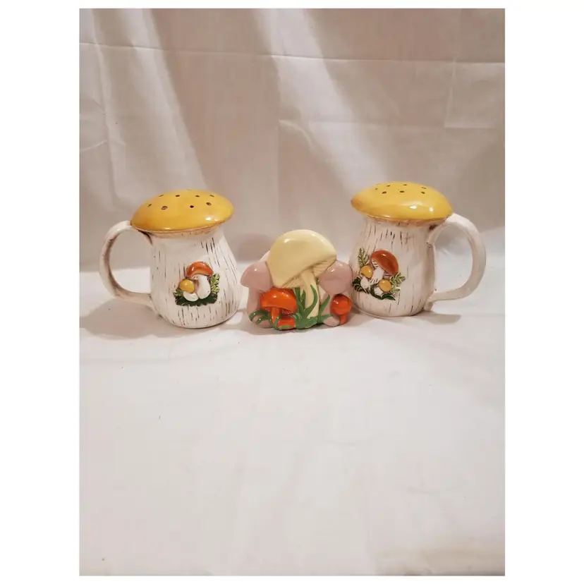 Very cute mushie kitchen set in great condition. The salt and pepper shakers are jumbo size. They are almost 6 inches tall and 4 inches across the cap. The napkin holder is 4.5 inches tall. They appear to be from the Arnel's mold.