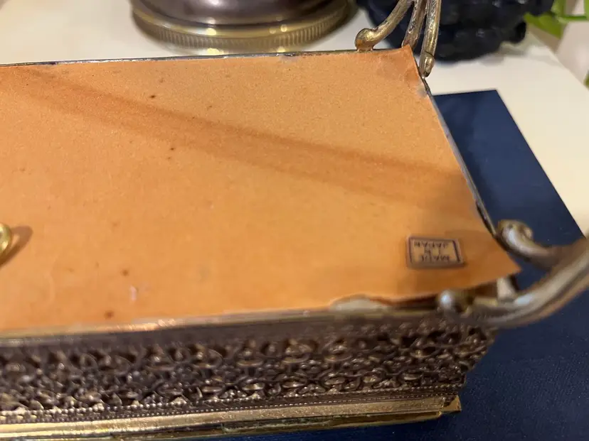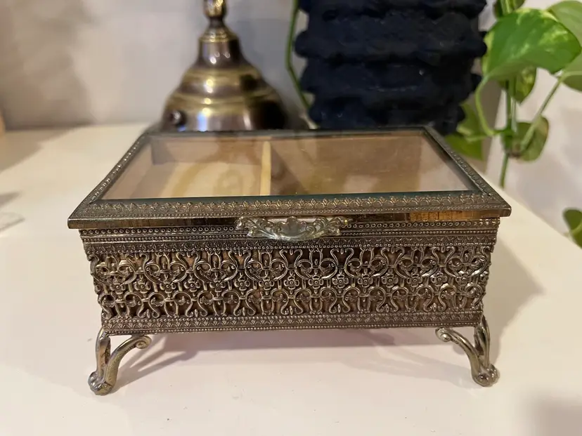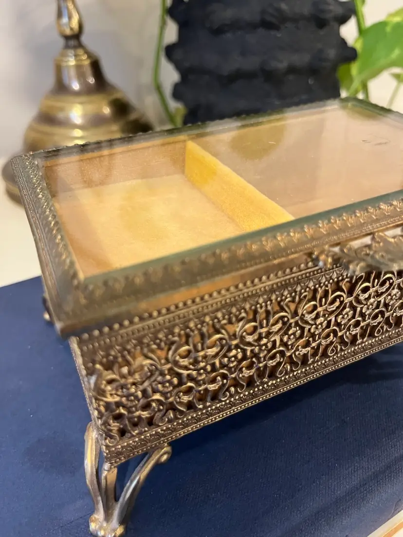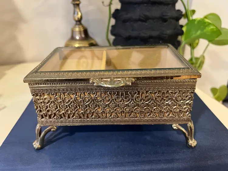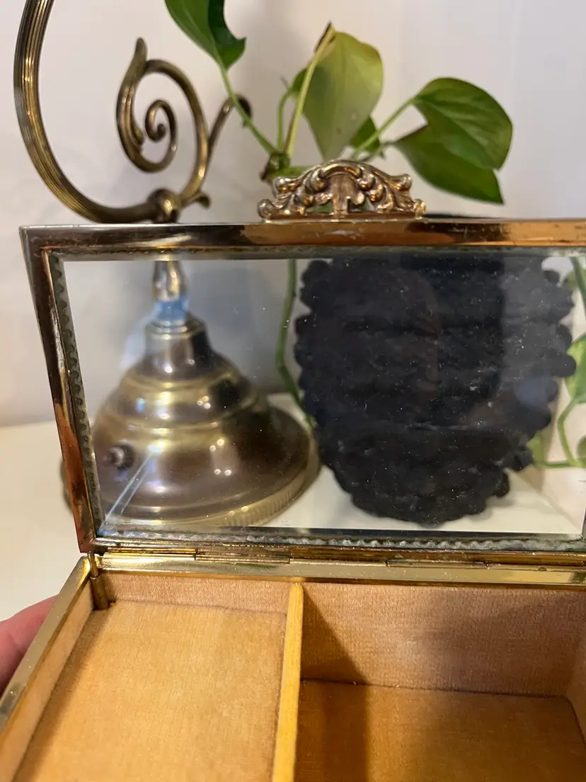 Vintage Gold Tone Hollywood Regency Music Jewelry Box with Beveled Glass
