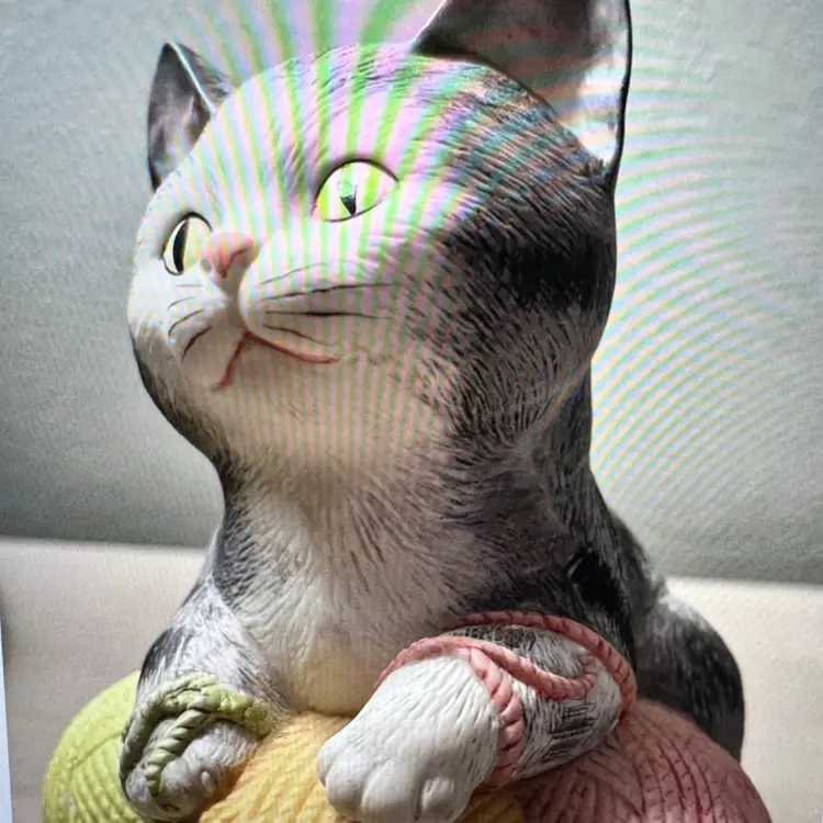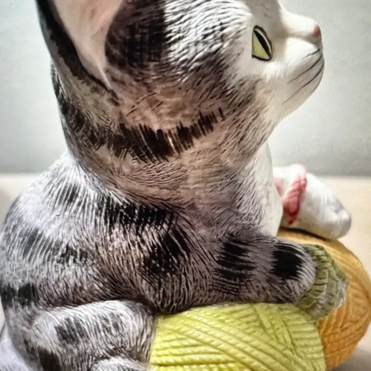 Vintage music box features an adorable cat & balls of yarn, playing the tune "You Light Up My Life". Made by Mann in 1982, made in Japan, this handcrafted piece is sure to add charm to any collection. The intricate details and quality craftsmanship make it a unique and treasured item. The music box was manufactured in Japan and is perfect for any music box collector or cat lover. It is in excellent working condition and would make a great addition to any home decor. No chips or cracks. Measures 5x4x4.5. Weighs 1lb.