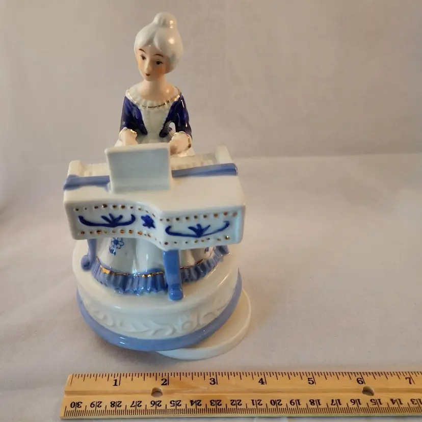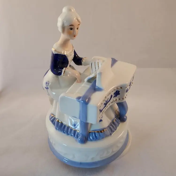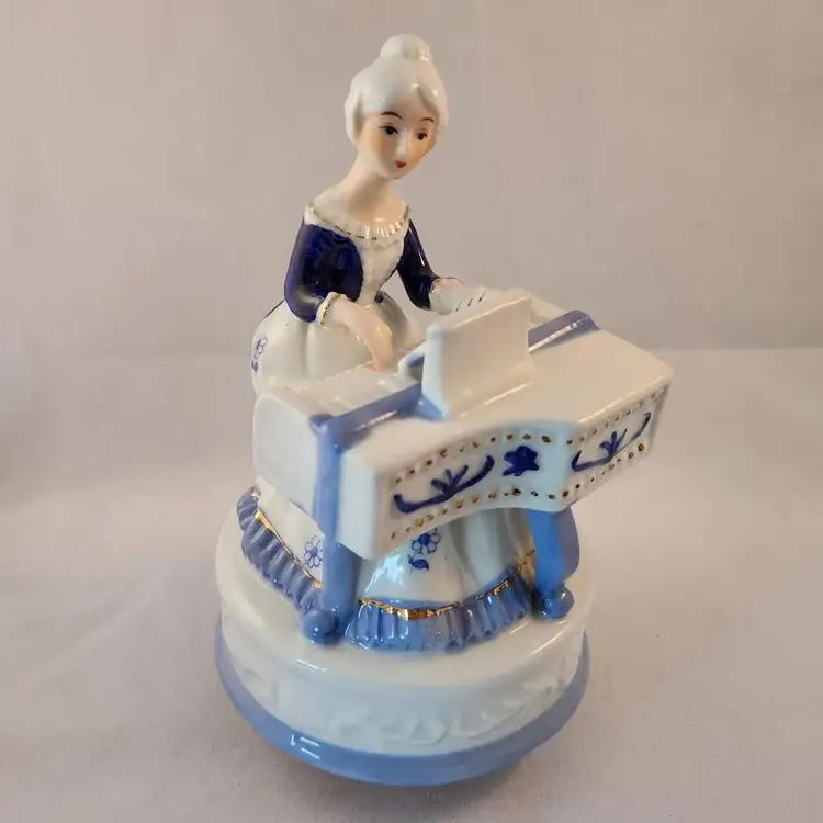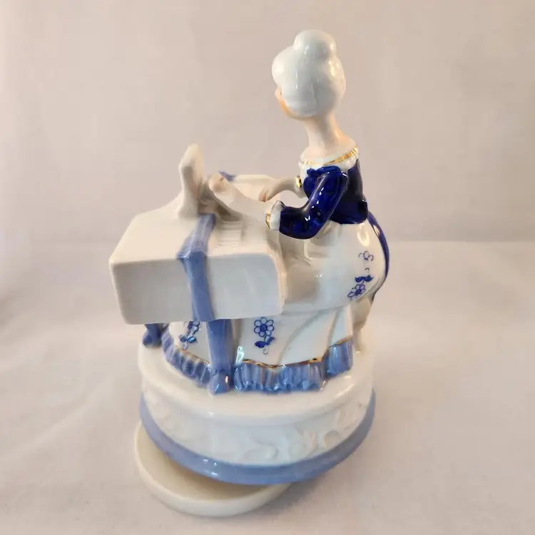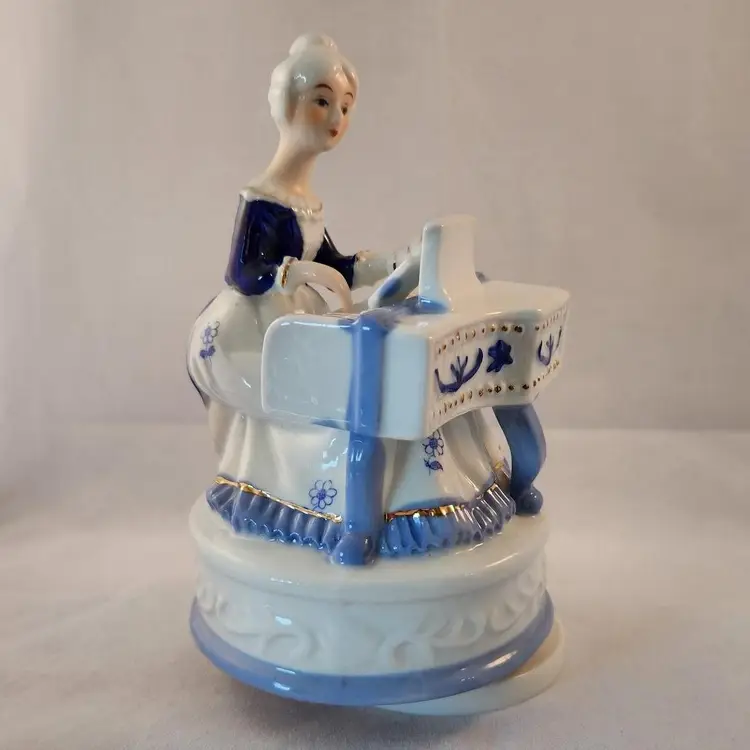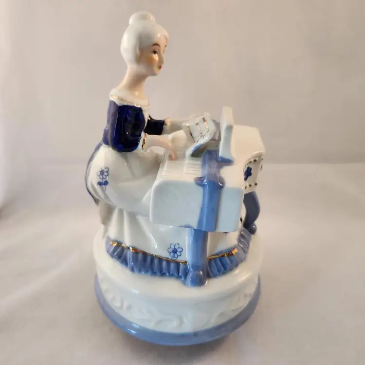 Beautiful lady playing a piano that spins. It works and is in good, used condition other than the glue has come loose from the base (see pictures).