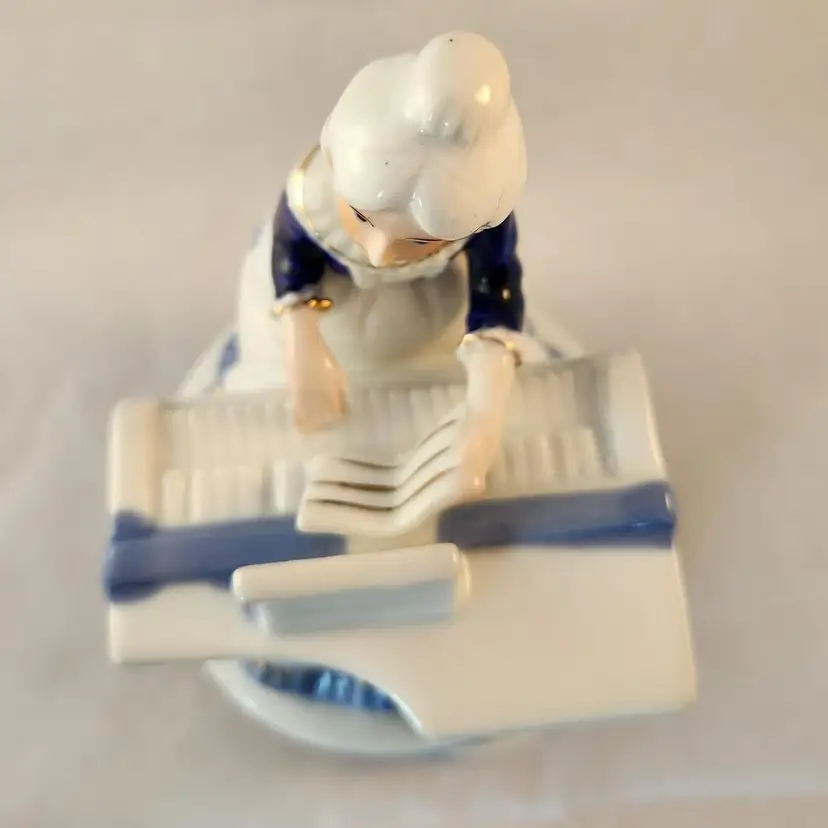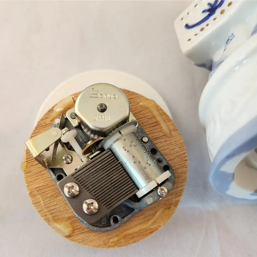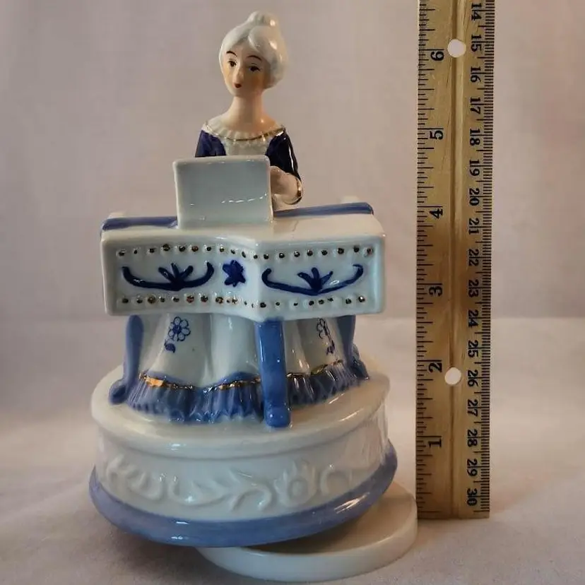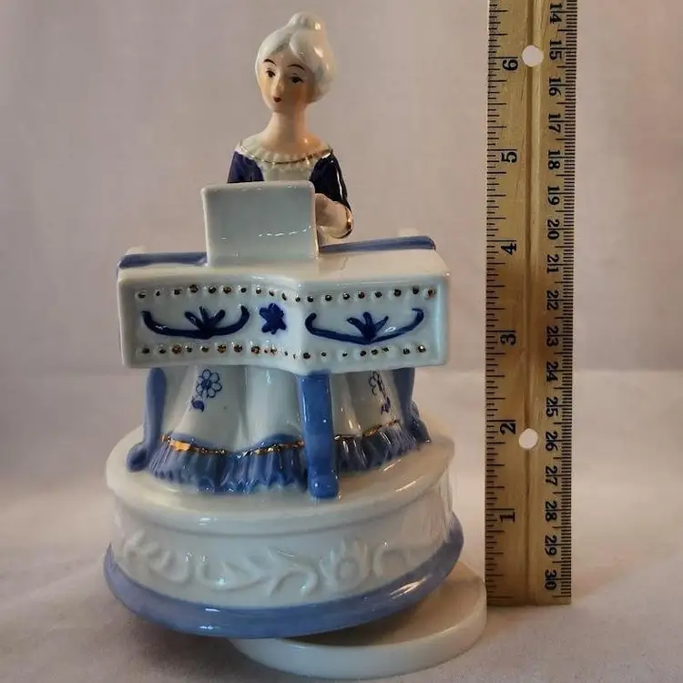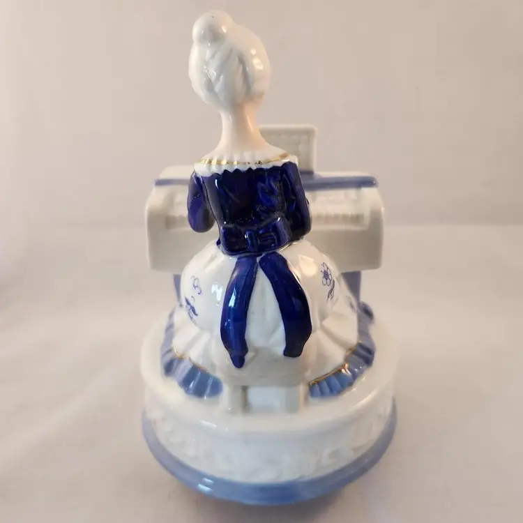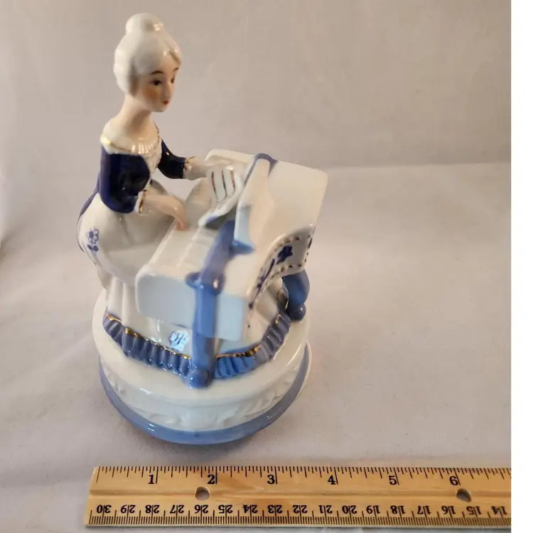 Beautiful lady playing a piano that spins. It works and is in good, used condition other than the glue has come loose from the base (see pictures).