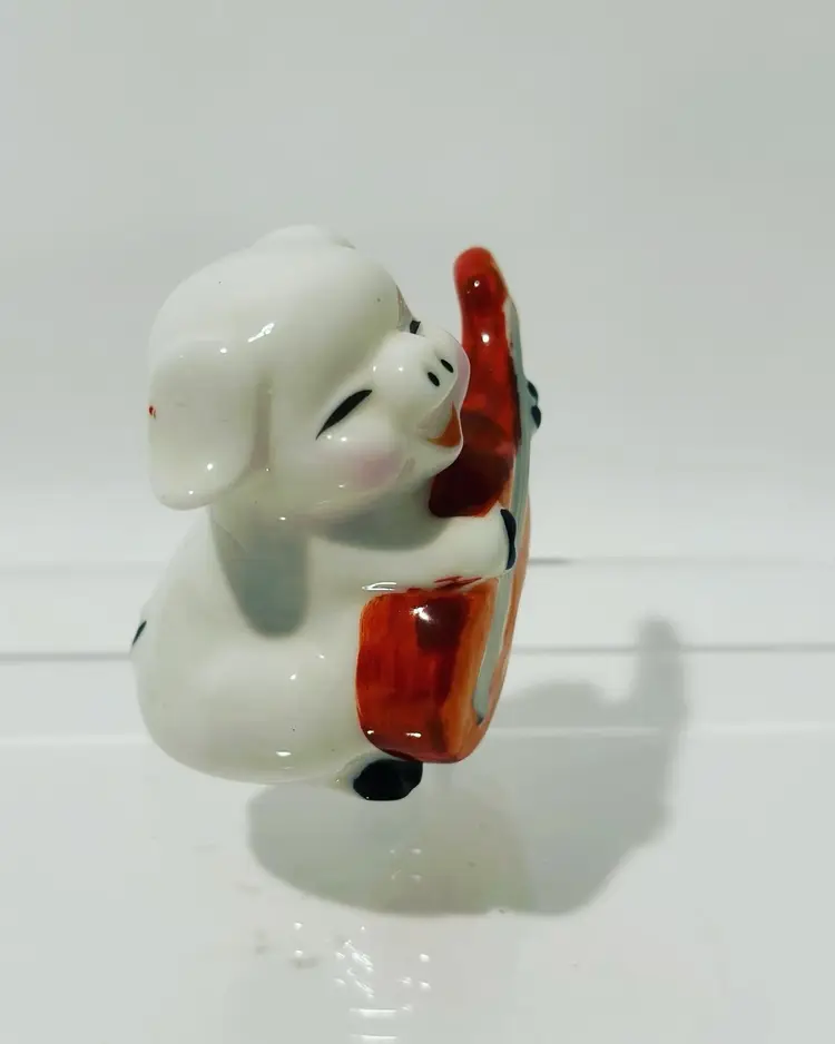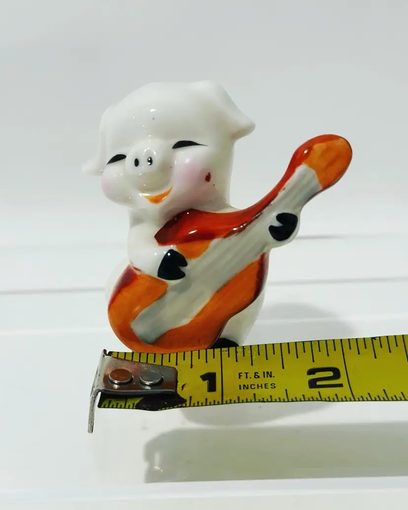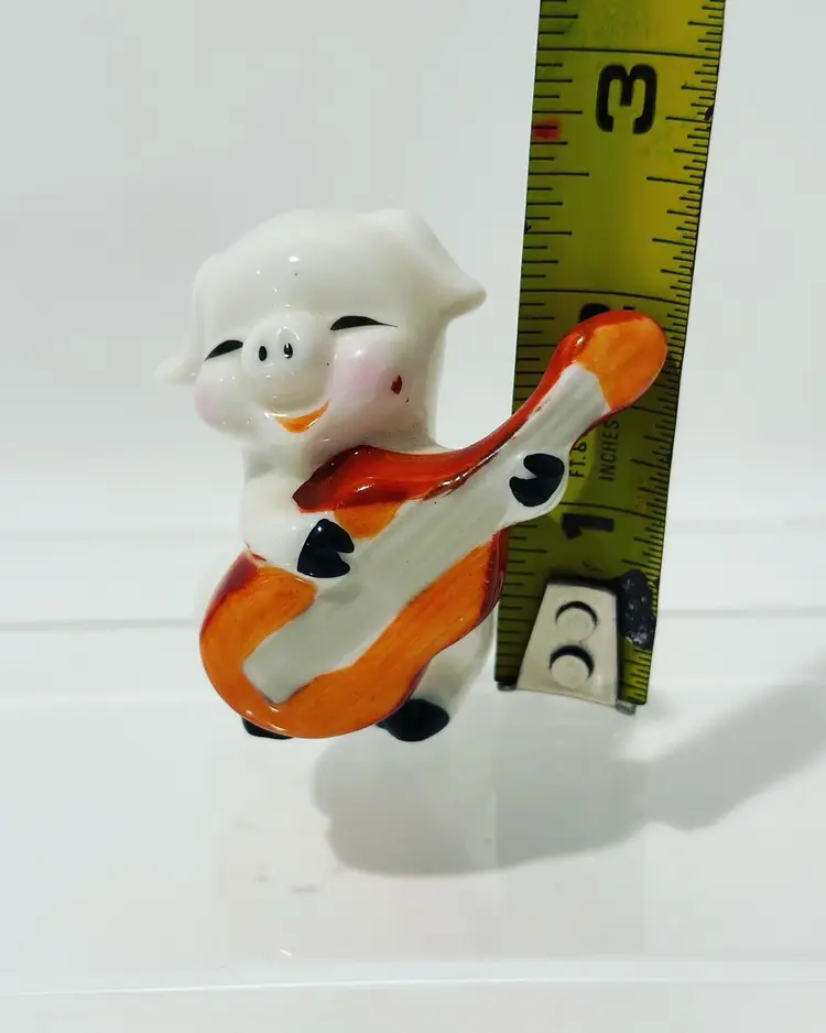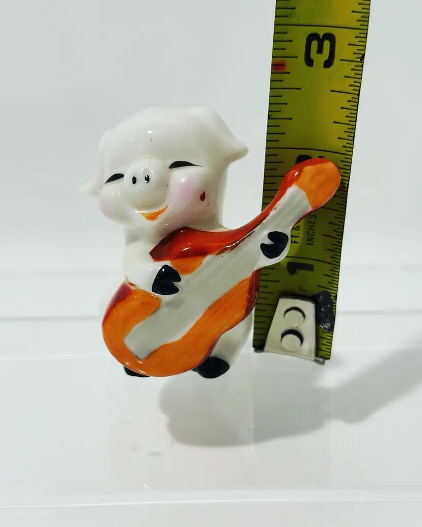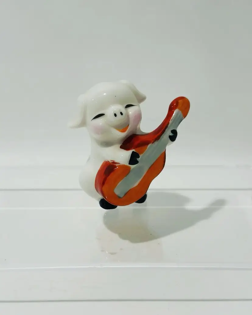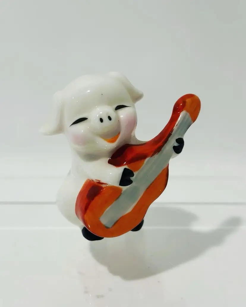 This vintage musical pig figurine is a unique addition to any collection. Made of bone china, this hand-painted figurine depicts a pig playing either a cello or guitar. The piece is from Taiwan and has been classified as a vintage pig figurine. It is perfect for collectors of animal figurines or those with a love for music.