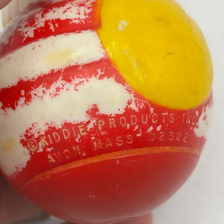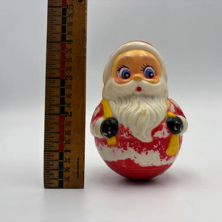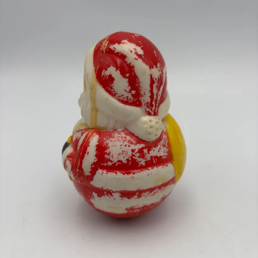 Features: vintage Santa Claus roly-poly (tumbler) toy made by Kiddie Enterprises, Inc. of Avon, Massachusetts