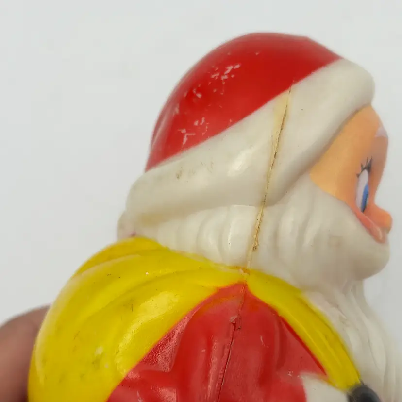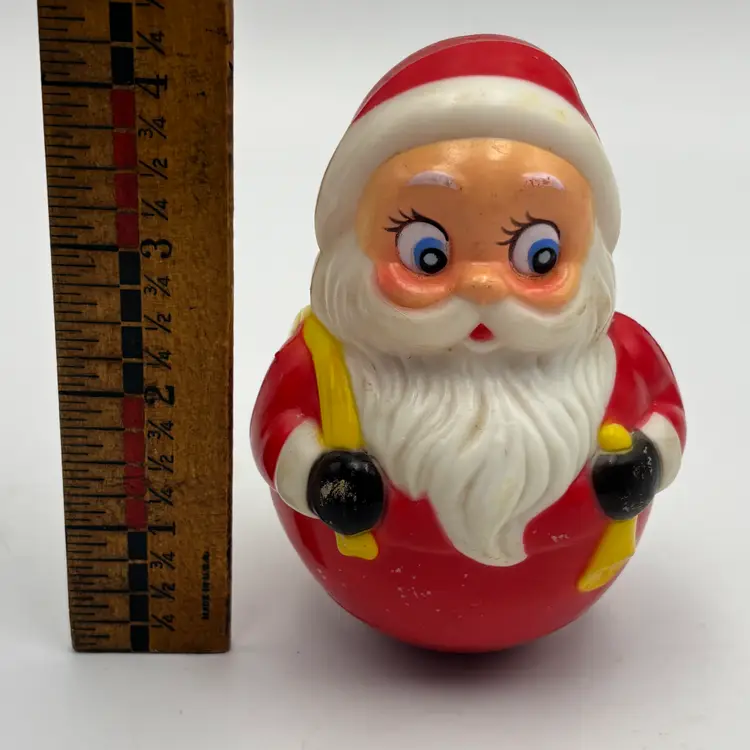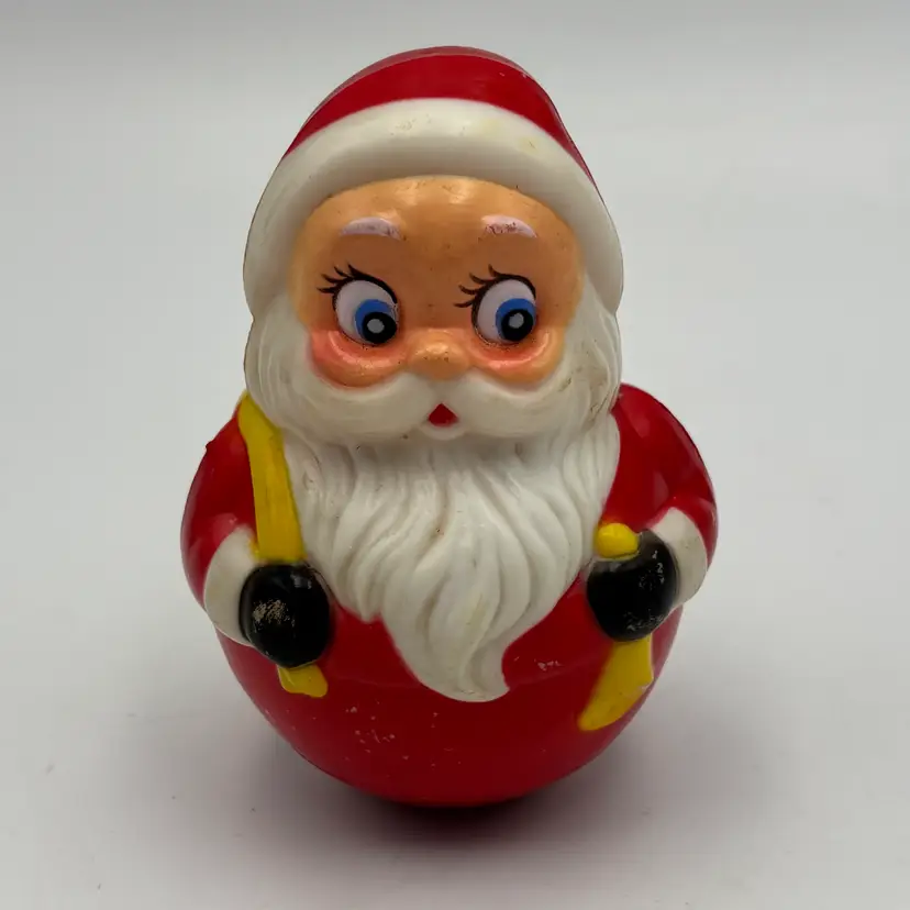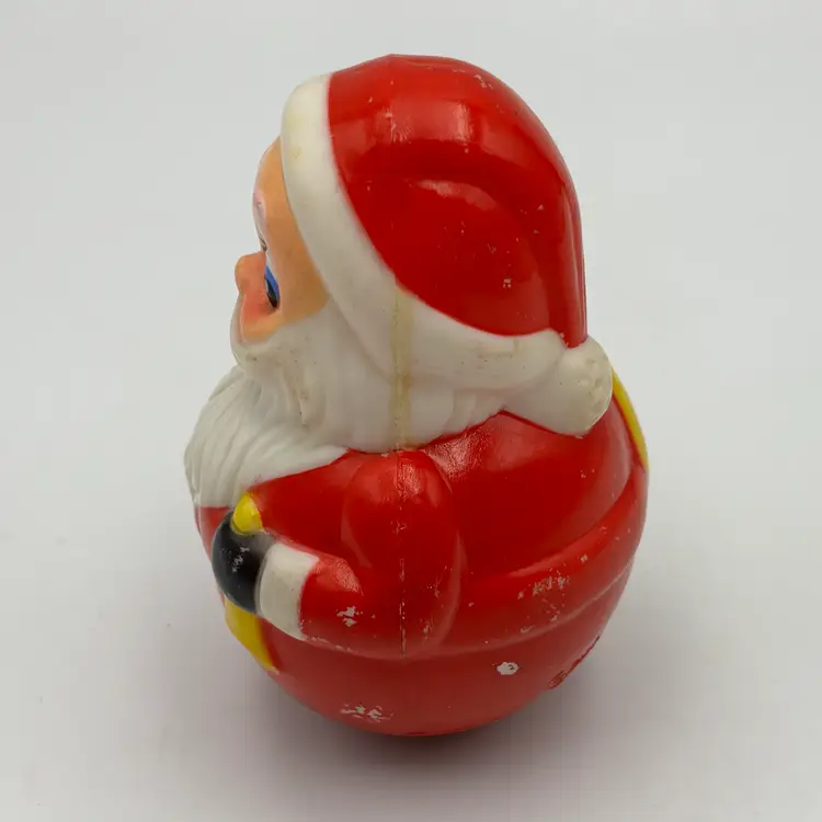 Features: vintage Santa Claus roly-poly (tumbler) toy made by Kiddie Enterprises, Inc. of Avon, Massachusetts