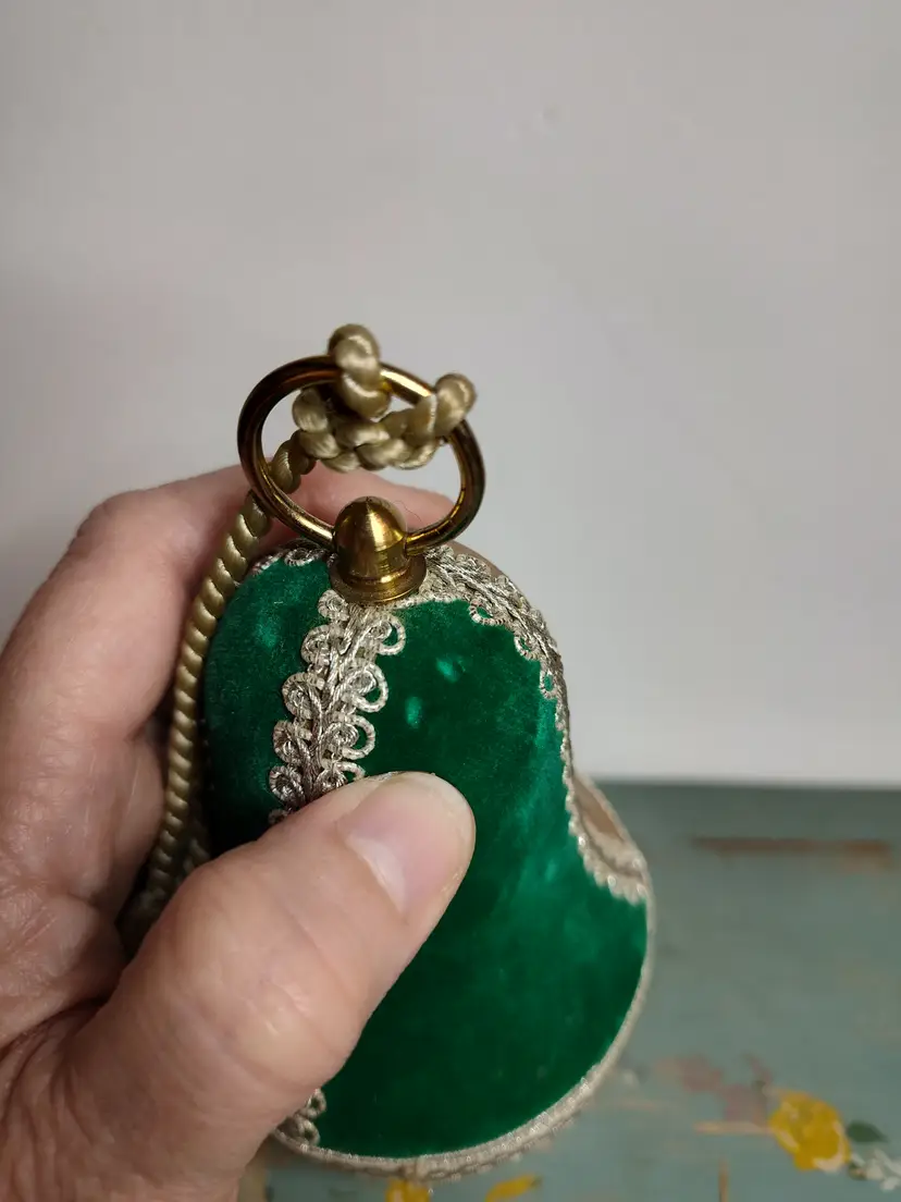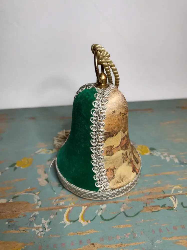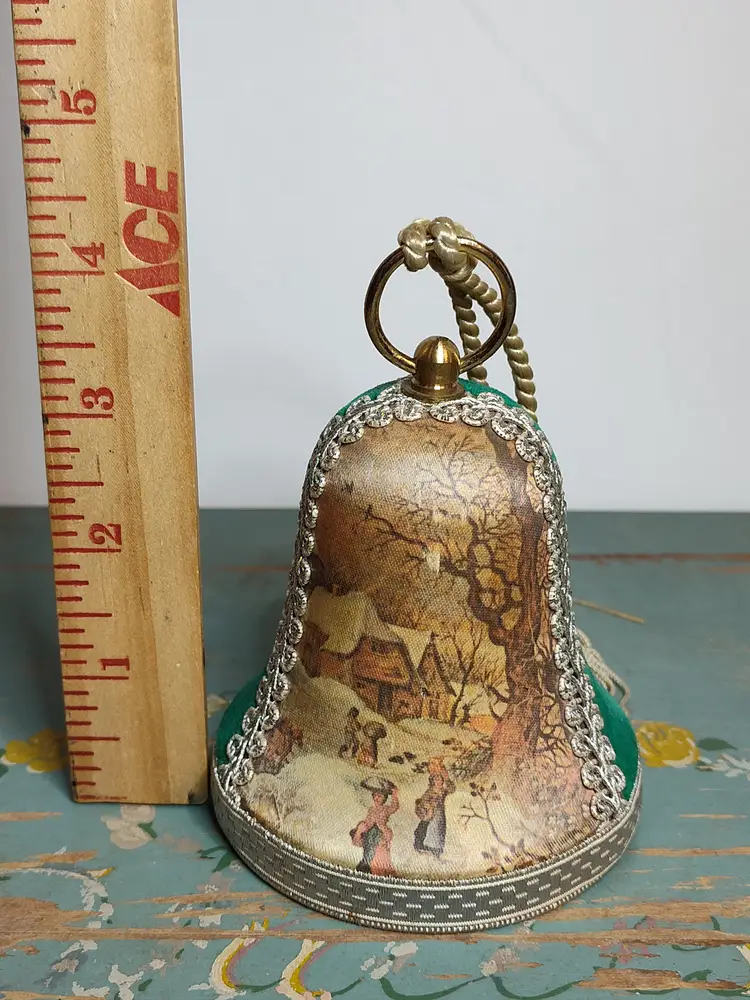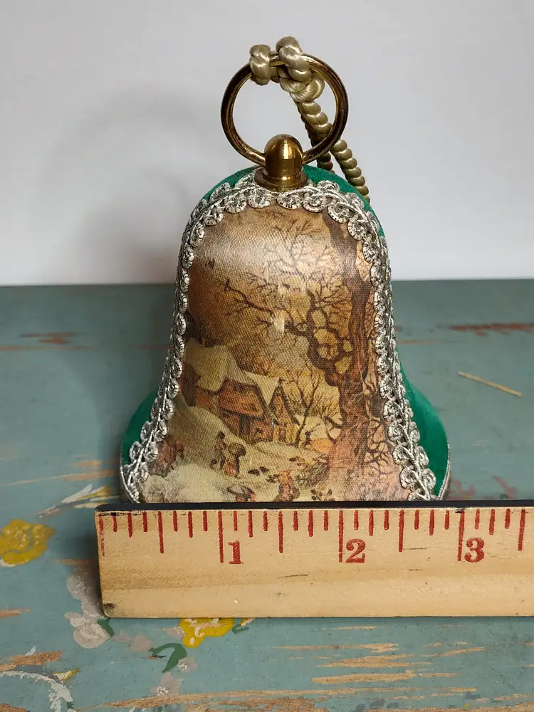 Vintage West Germany green velvet musical ornament with winter scene with gold tassel.