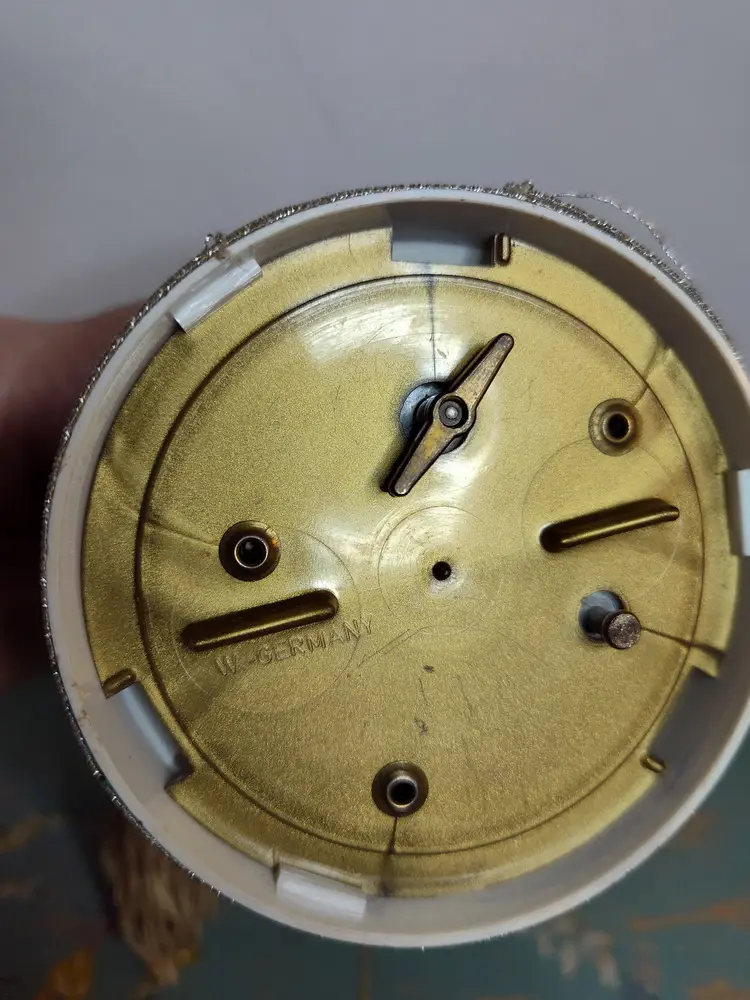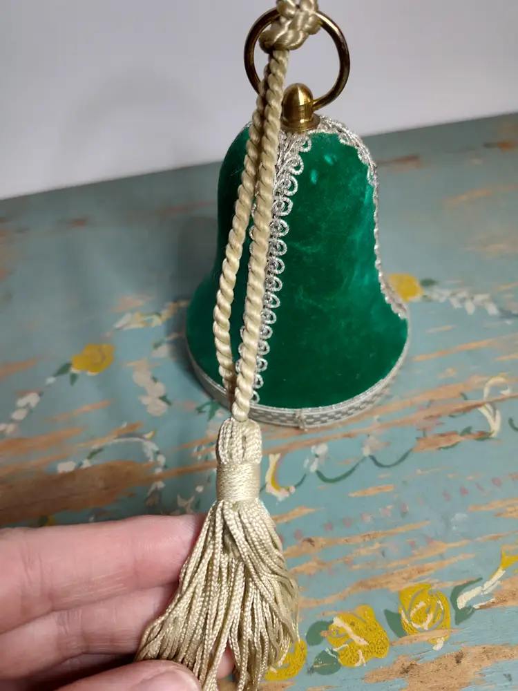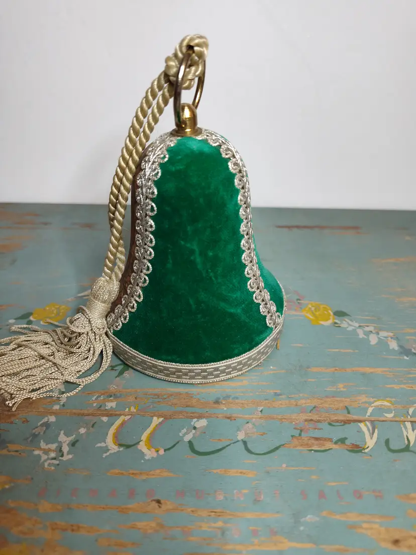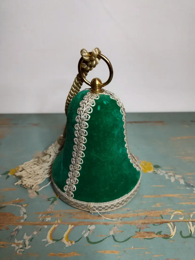 Vintage West Germany green velvet musical ornament with winter scene with gold tassel.
