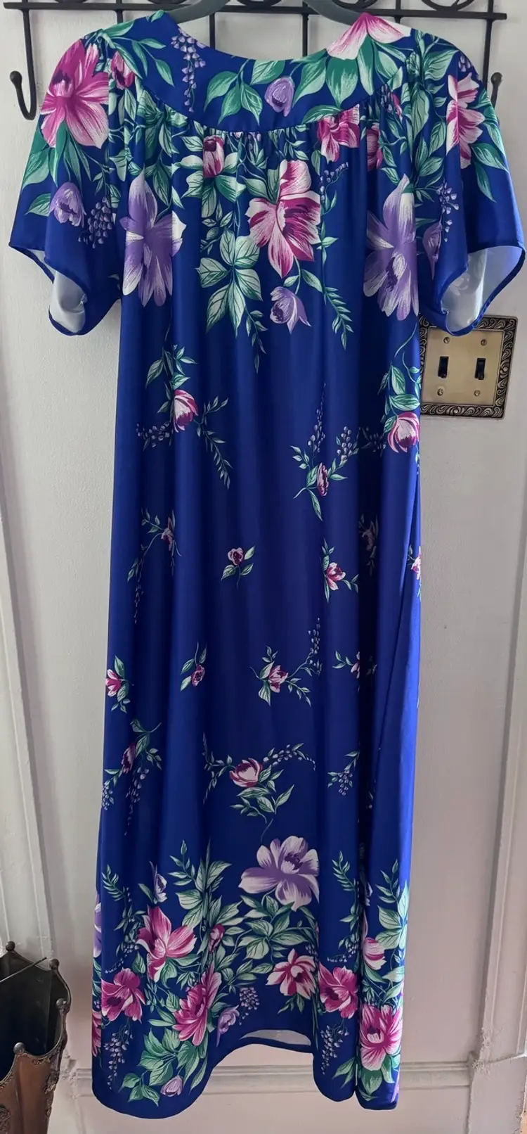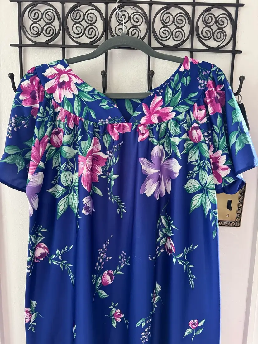 Vintage MuuMuu style Floral HawaiianNight Gown Night Dress Would be a cute swim coverup too! Size large on tag, no brand tag. 26.5” P2P 57” long Excellent vintage condition