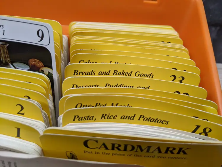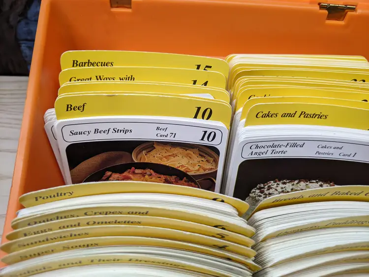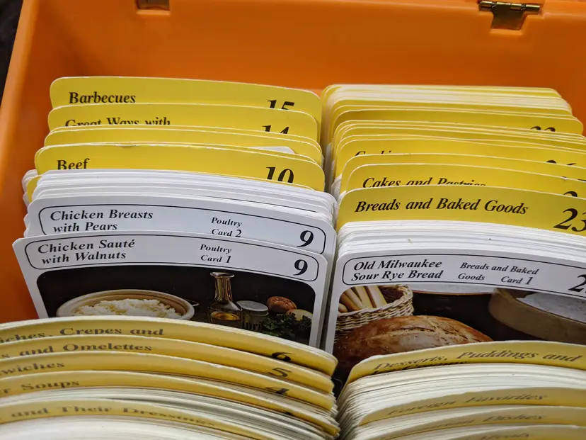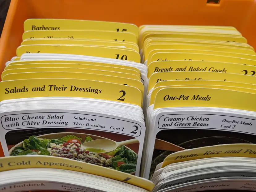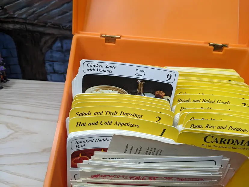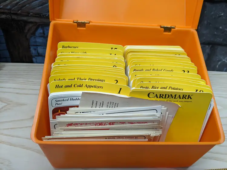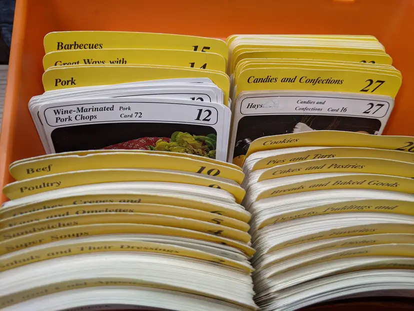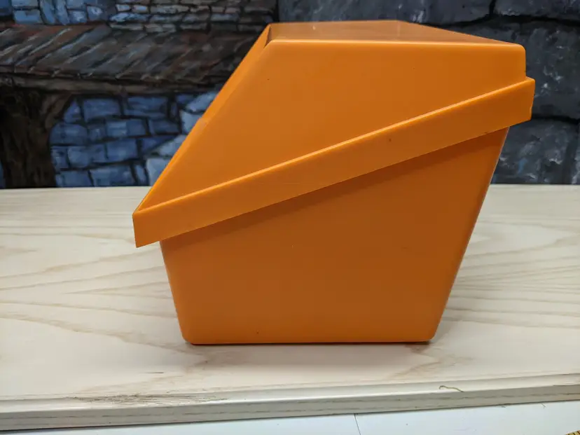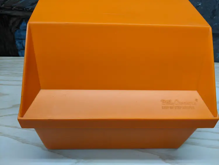 Vintage My Great Recipes 1970s orange Large plastic Box with Index Cards and 600+ Recipes. The Box Large is it measures 10"x9"x7.5" and heavy. Very good condition Clean with no damage.no chips or cracks no weird smells. Please check the photos for details. Comes from a smoke free home. We do have pets.