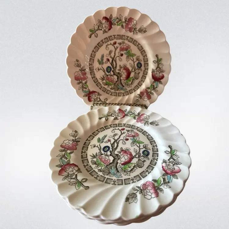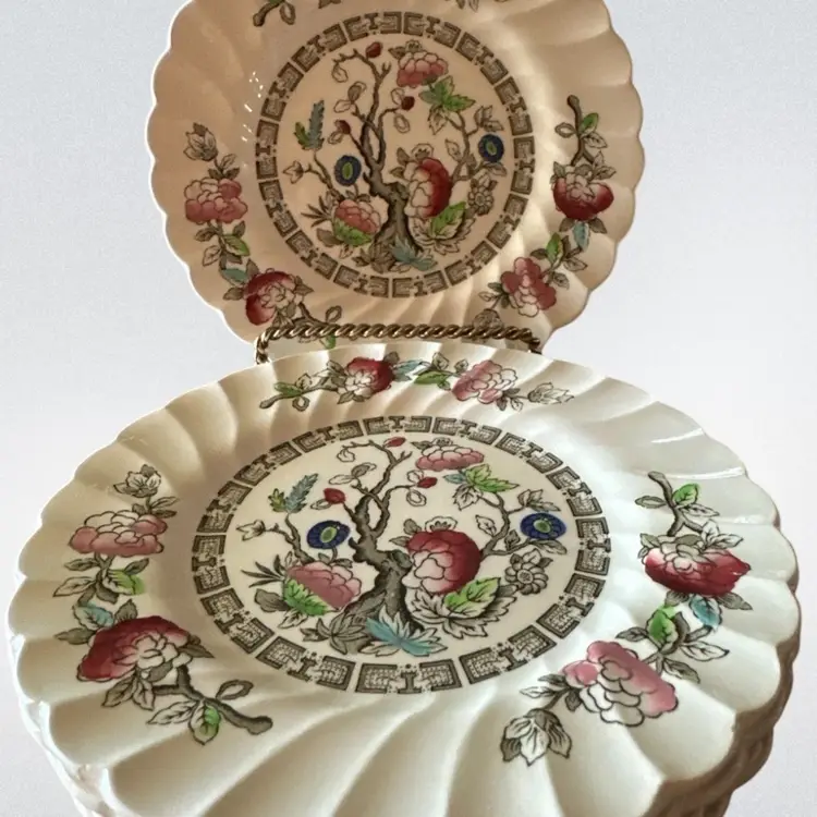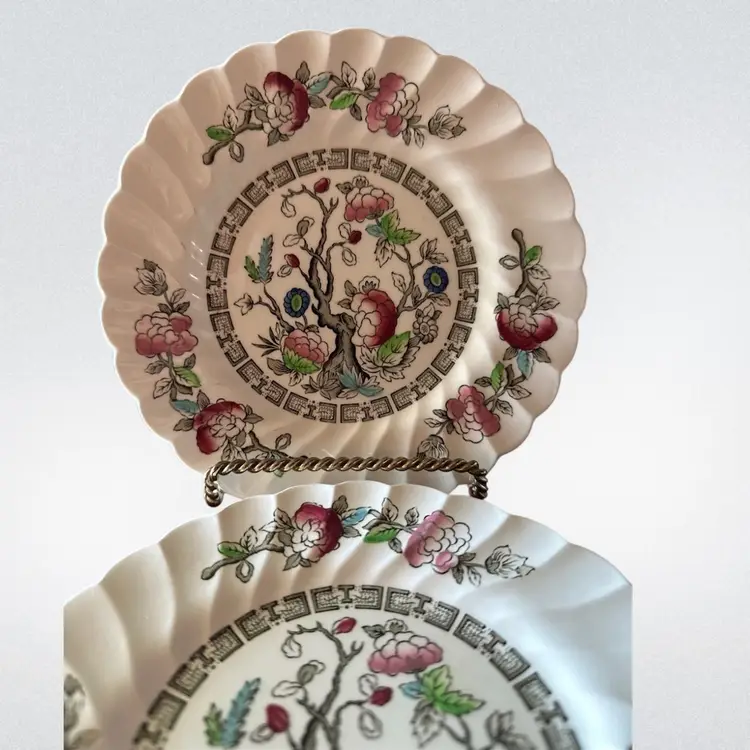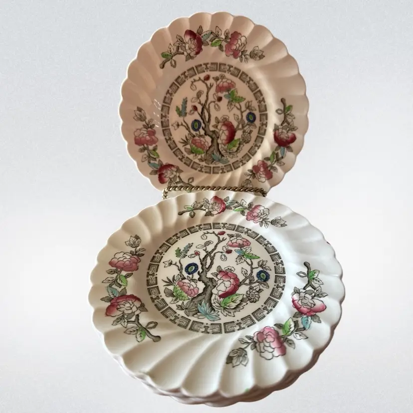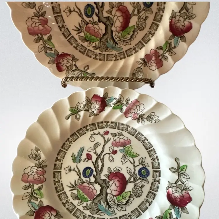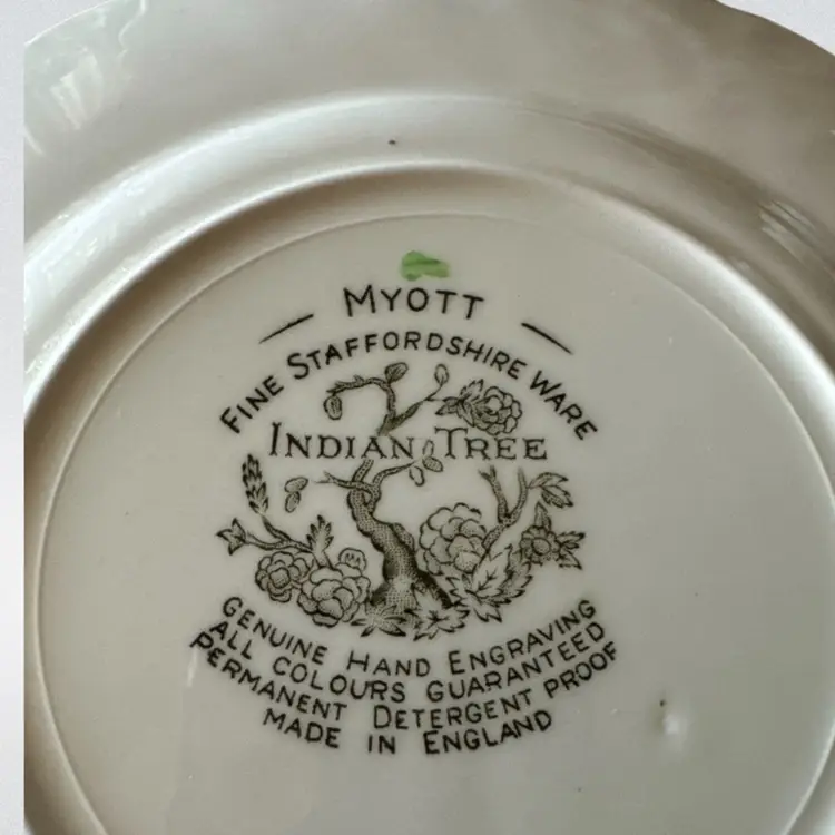 This set of 5 vintage Myott Staffordshire Indian Tree bread and butter plates is a charming addition to any table setting. Made in England, these round plates feature a classic cream color with a glossy finish, showcasing the intricate Indian Tree pattern. Crafted from porcelain and ceramic, these plates have a diameter of 6.25" and are perfect for all occasions. The hand wash only care instructions ensure that these original pieces are preserved for years to come, making them a timeless treasure from the esteemed Myott brand. No chips, cracks, crazing or scratches. Appear never used!