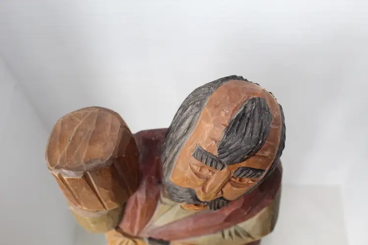 This vintage 12" hand-carved Linden wood hand painted sculpture from the Myslenice region of Poland. It features a unique figurine of a peasant with a barrel and stein, showcasing traditional Polish folk art. Crafted with care and attention to detail, this piece is a collectible item that reflects the rich cultural heritage of the region. The intricate design and craftsmanship make it a standout piece for collectors interested in European cultures and ethnicities. Made by hand in Myslenice, this sculpture is a testament to the artistry and skill of Polish artisans.