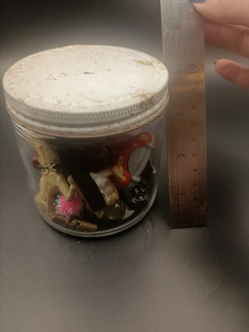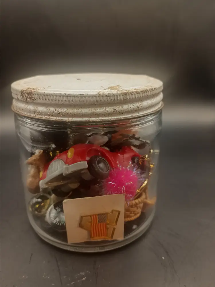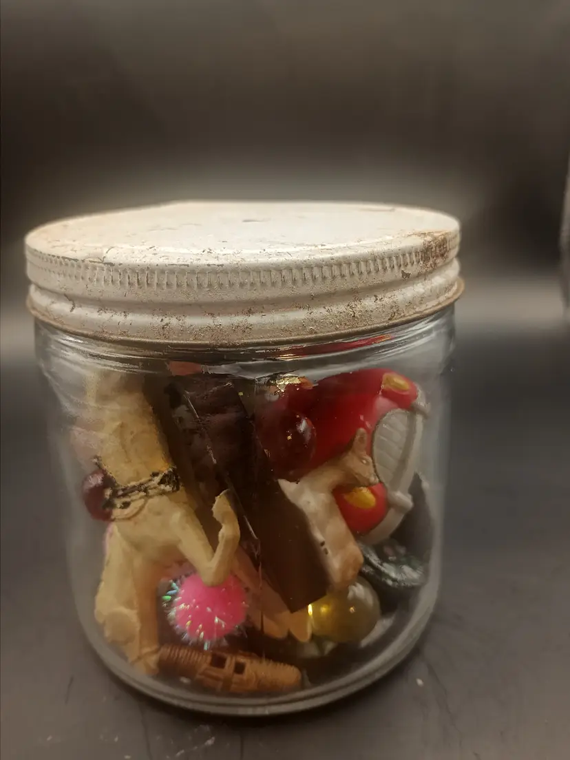Hi in this listing you will receive 1 vintage jar full of trinkets/miniatures perfect for your trinket shelf. You will receive the exact jar pictured. The picture with the trinkets out of the jar are examples of what you might get. Inventory changes often. You will receive approximately 25 items. You may receive items like vintage porcelain animals, wade whimsies, vintage metal toys, vintage plastic toys, vintage glowy marbles, vintage resin plates, vintage buttons, vintage glass dice, vintage cameos,vintage pendants, pins, and broaches, vintage game pieces, vintage carved animals, and much more. I have more of these jars coming. Please let me know if you have any questions