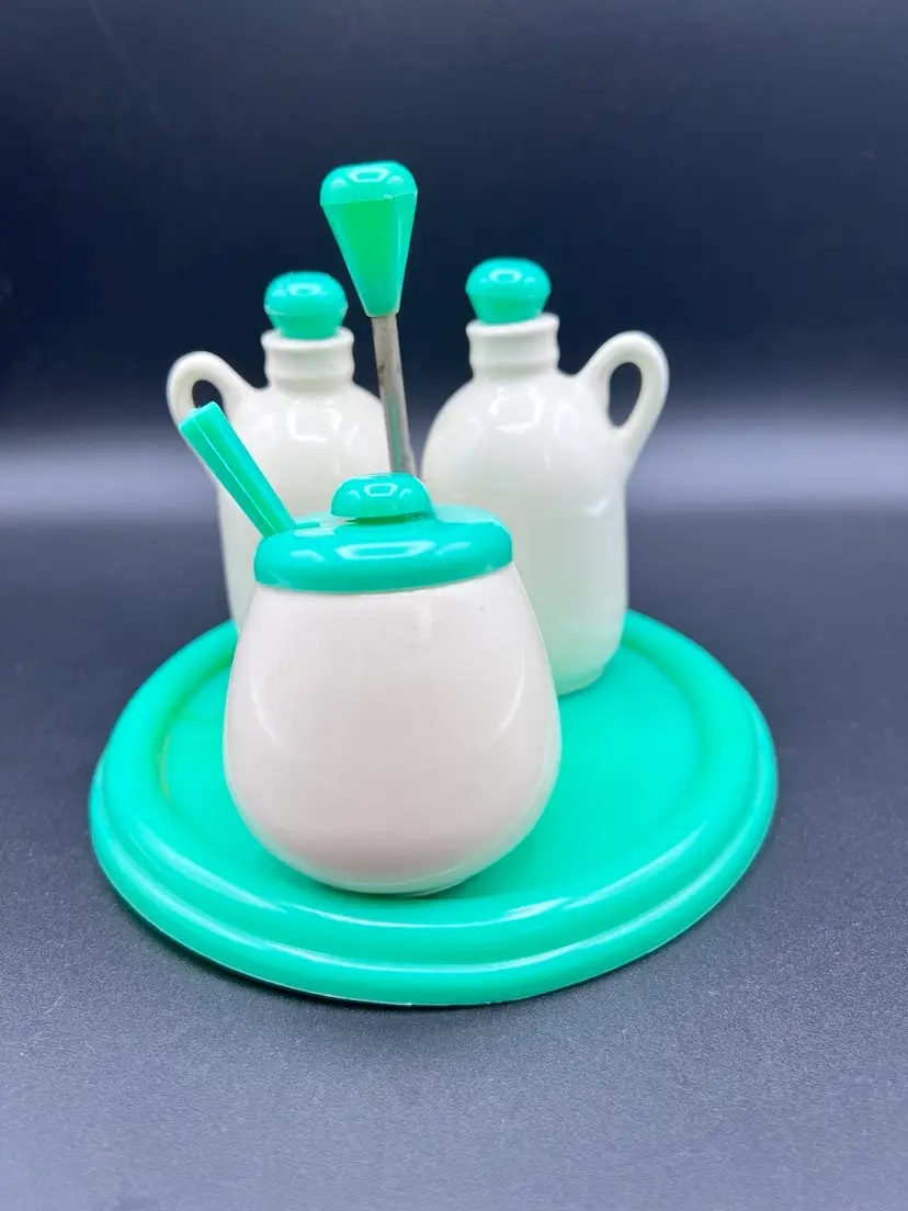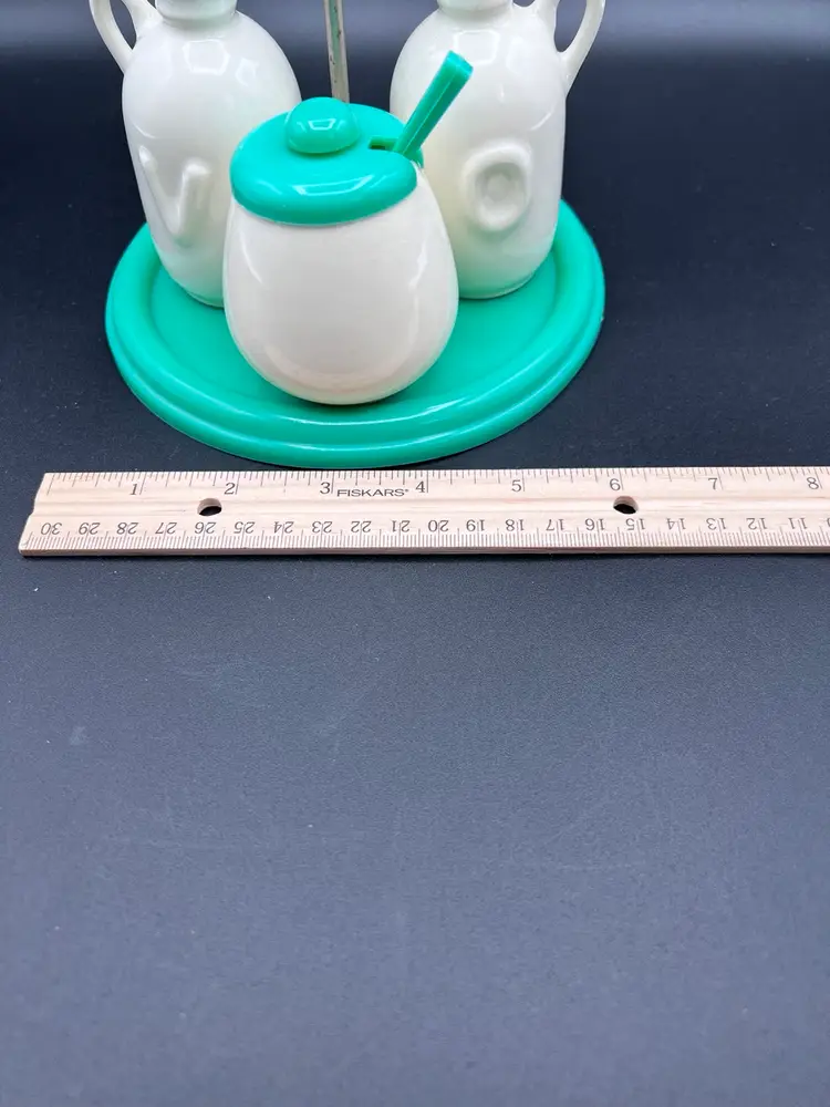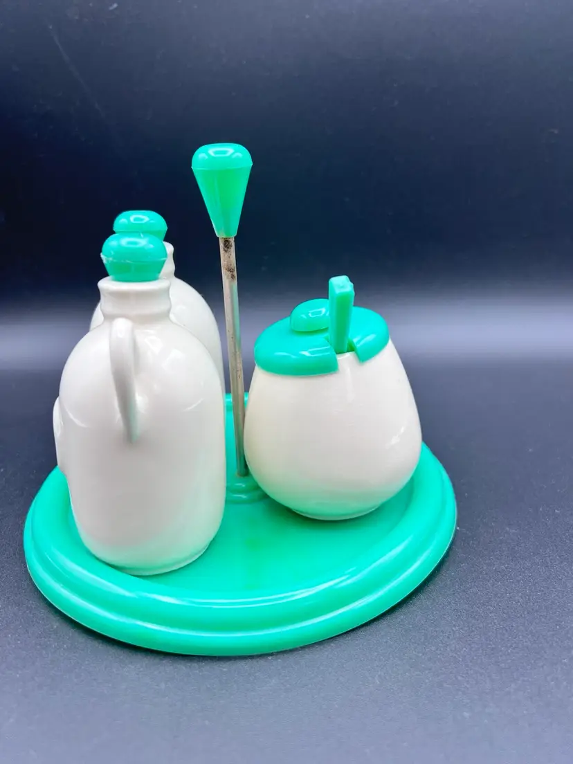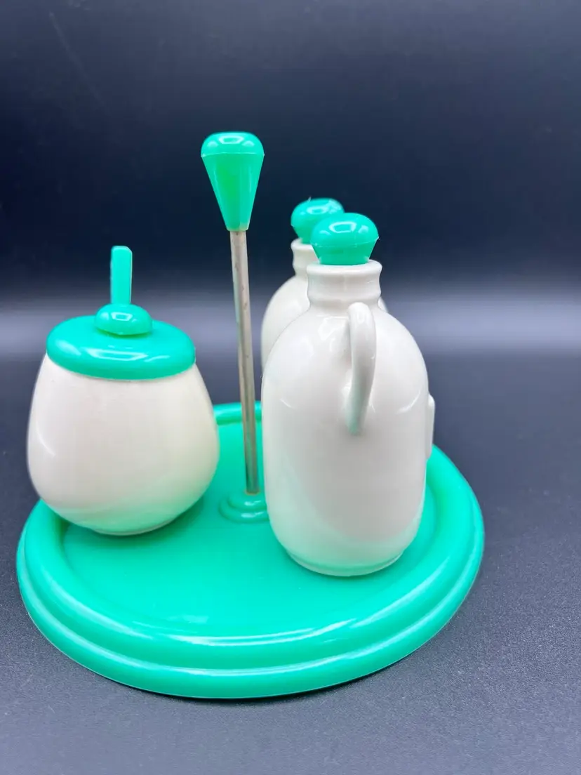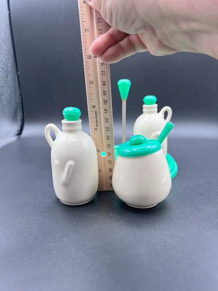 Cute vintage condiment set with carrier made by Najeeb Inc. in the USA. Creamy white ceramic jugs with a V and O for vinegar and oil, and a small condiment jar with lid and scoop. Comes with its own plastic carrier with handle to move from kitchen to table as needed. Lids, tray and scoop are made of plastic in an oh so 70’s shade of green/blue. In very good vintage condition. One spot of staining on the tray Tray is 6 1/4” in diameter and handle stands just under 5”. Jars are about 4” with lids, pot is about 3” tall