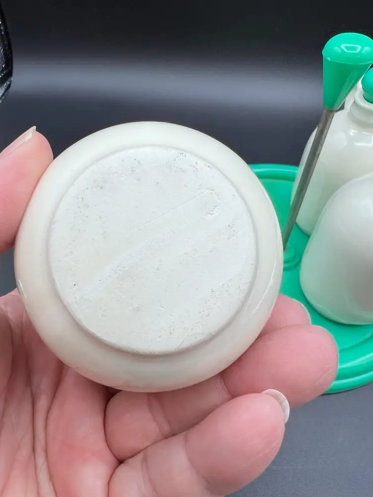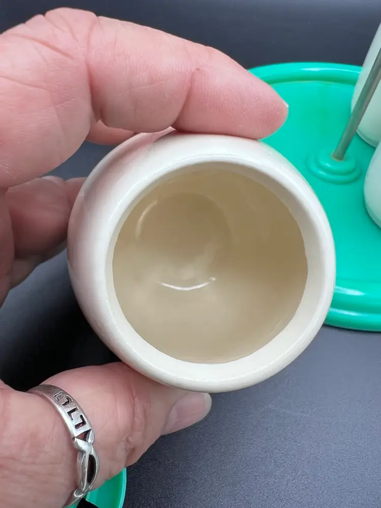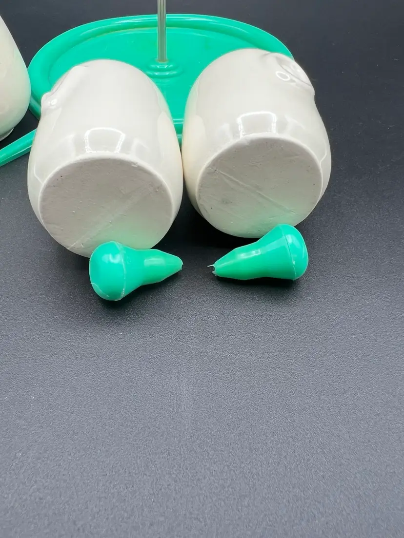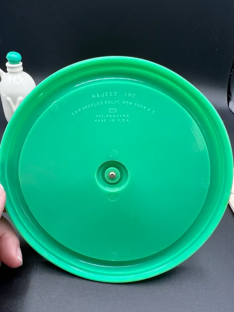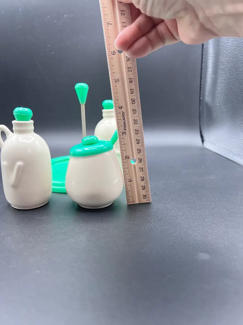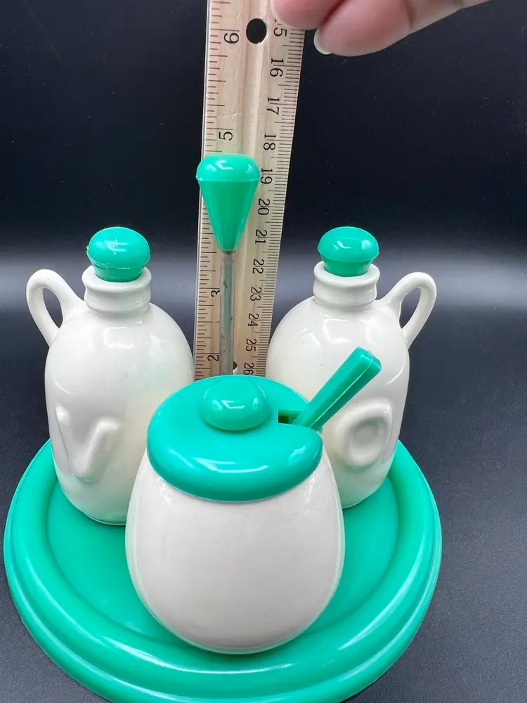 Cute vintage condiment set with carrier made by Najeeb Inc. in the USA. Creamy white ceramic jugs with a V and O for vinegar and oil, and a small condiment jar with lid and scoop. Comes with its own plastic carrier with handle to move from kitchen to table as needed. Lids, tray and scoop are made of plastic in an oh so 70’s shade of green/blue. In very good vintage condition. One spot of staining on the tray Tray is 6 1/4” in diameter and handle stands just under 5”. Jars are about 4” with lids, pot is about 3” tall