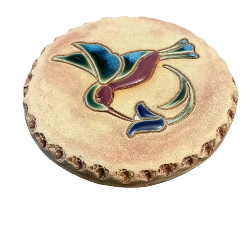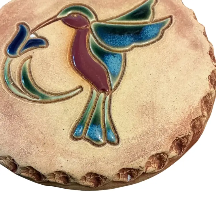 Beautiful Red River New Mexico hummingbird glazed ceramic inlay on stoneware tile. Can be hung or used as a traditional bread warmer. 5 1/2” diameter. Note tiny nick on edge shown in last picture.
