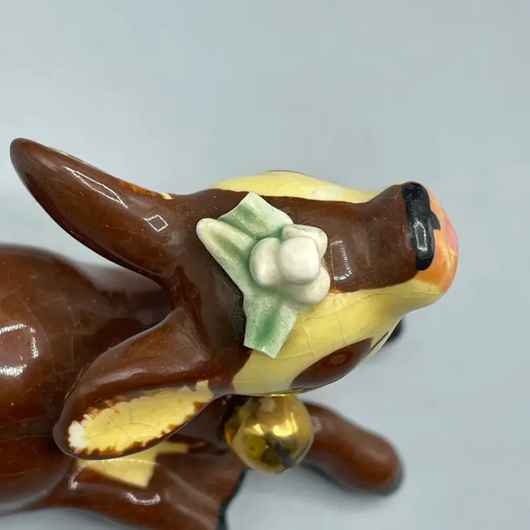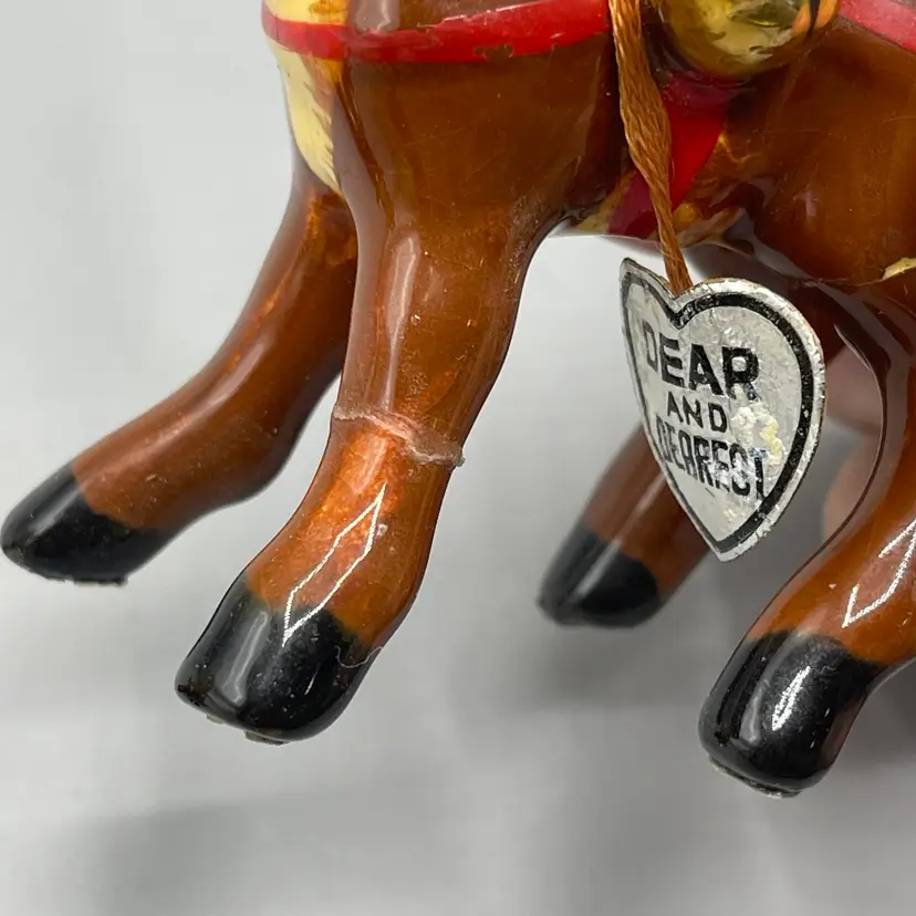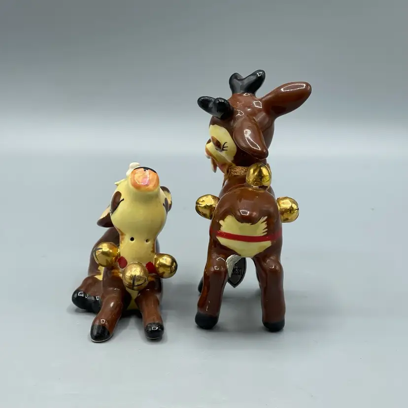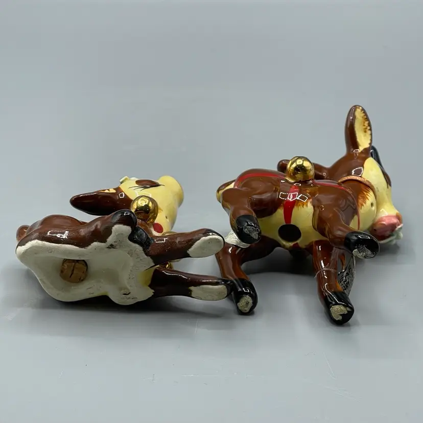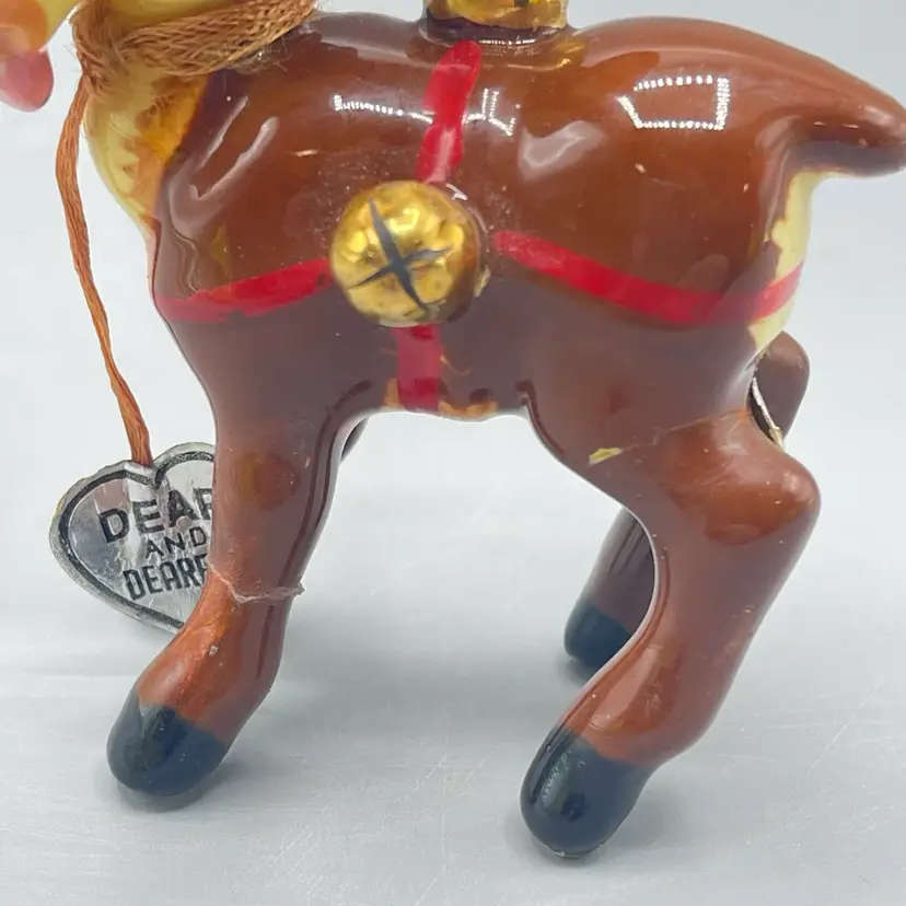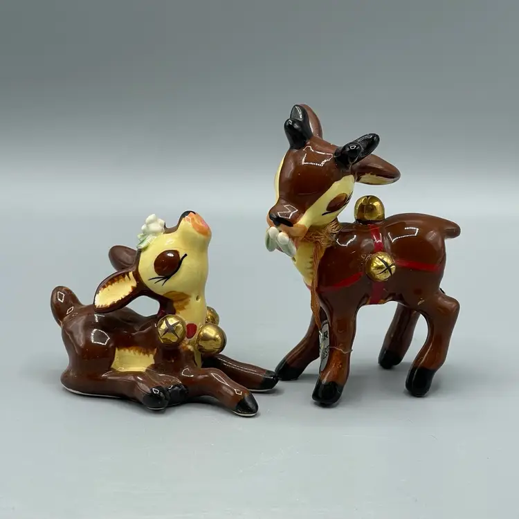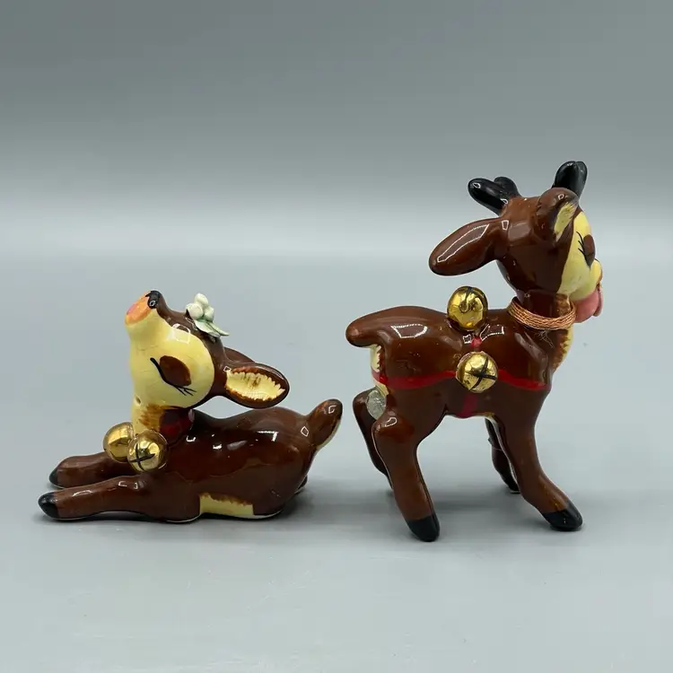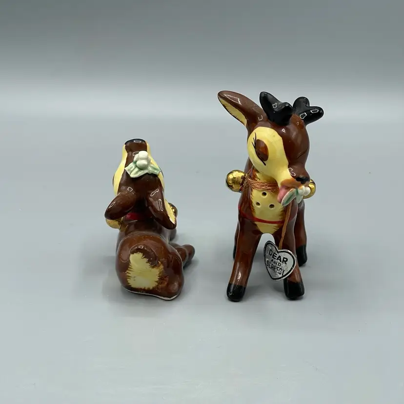 These festive deer shakers are decked out in sleigh bells and holly. The standing deer has the original foil label as well as a foil heart tag that reads “Dear & Dearest”. The standing deer is about 4 inches tall. There are chips on the leaves of the holly and two legs on the standing deer had been repaired at some point. That doesn’t detract from their charm and they would make a great addition to any holiday display or collection.