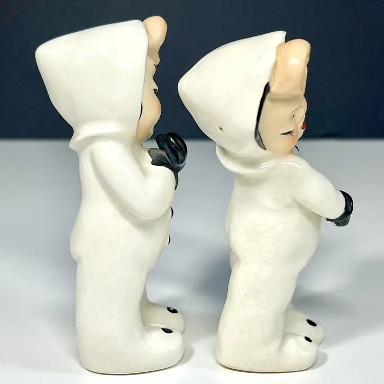 This measure about 4 3/8" high x 2 1/2" long x 1 1/2" wide and are in good but vintage condition. They do have some crazing, especially the girl with her hands over her head. She also has a very small little chip that I am showing in one picture, some black spots on her face and hood. Some minor paint wear. Please see all pictures for condition. Overall, a cute set of vintage Christmas figurines that are hard to find and would make a wonderful addition to any Christmas décor or make a wonderful gift.