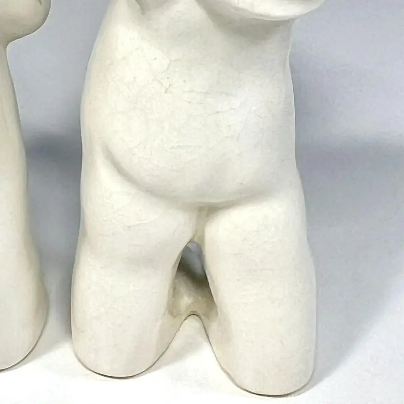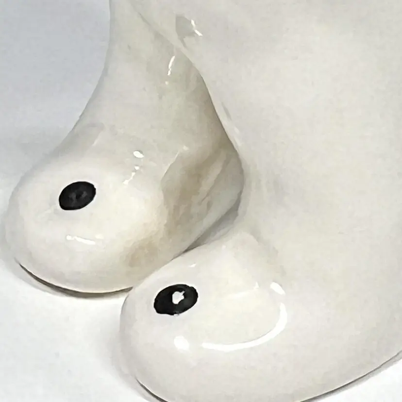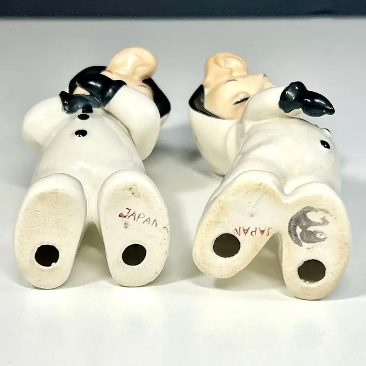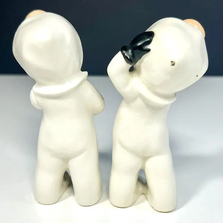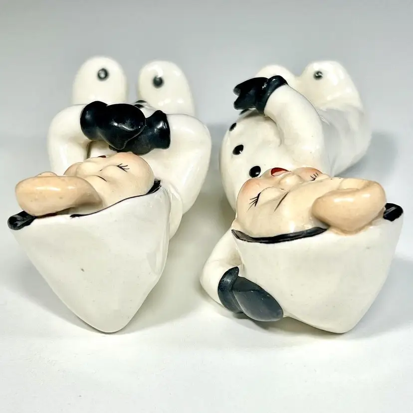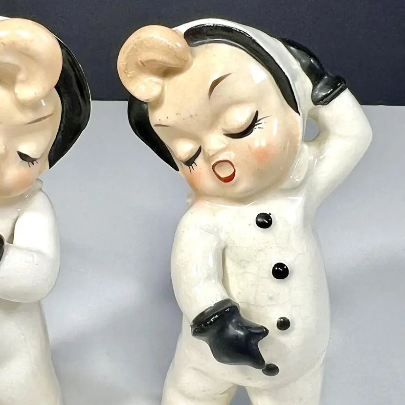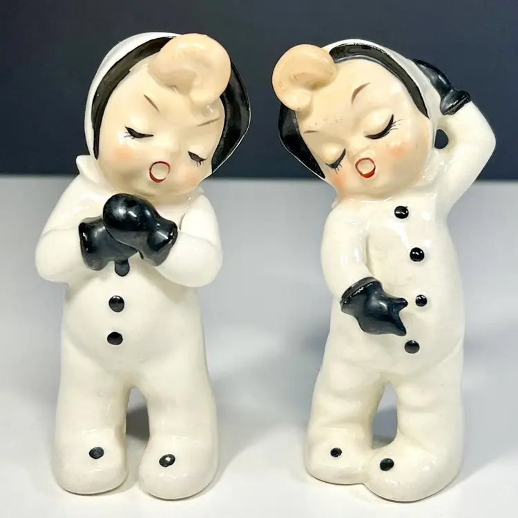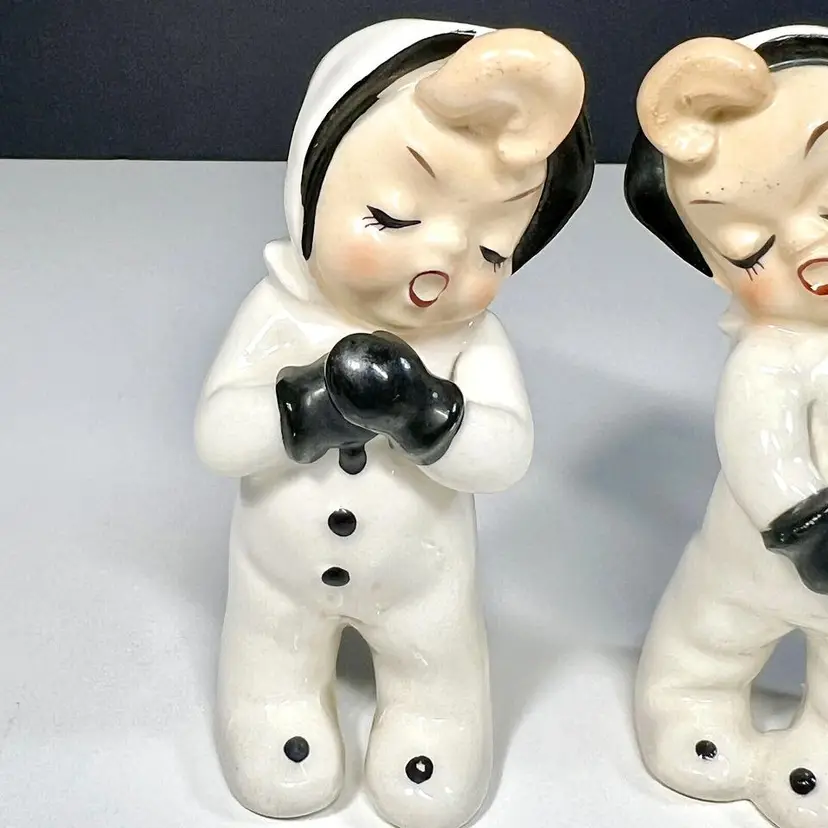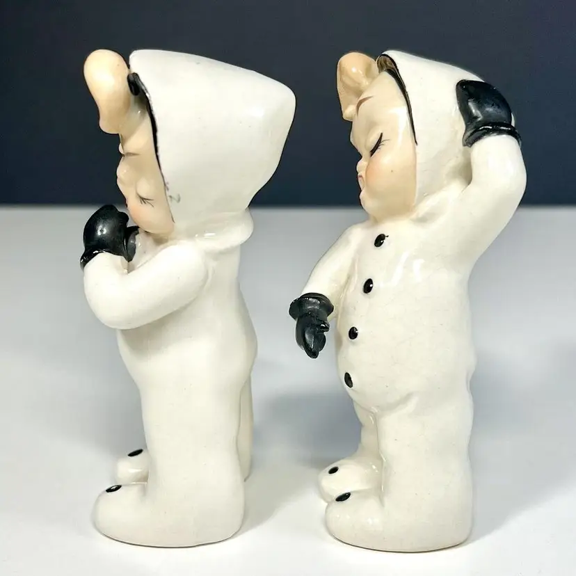 Vintage Set of 2 Napco Christmas Snow Girl Baby Figurines. Made in 1956 by Napco, these girls are adorable in their white snow suits with black trim and black gloves with both of them yawning. Marked on the bottom Japan.