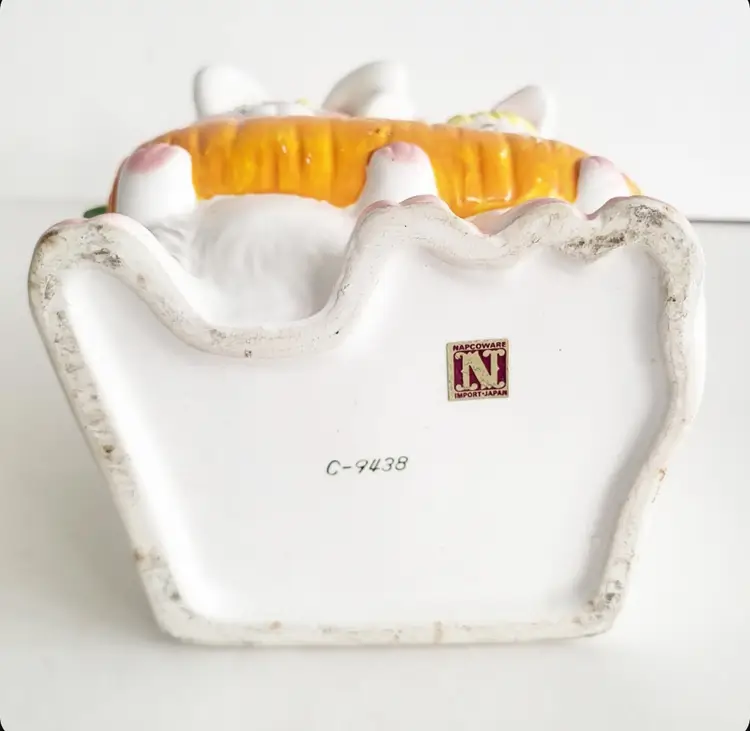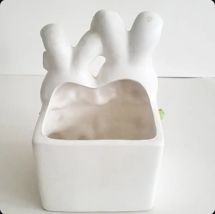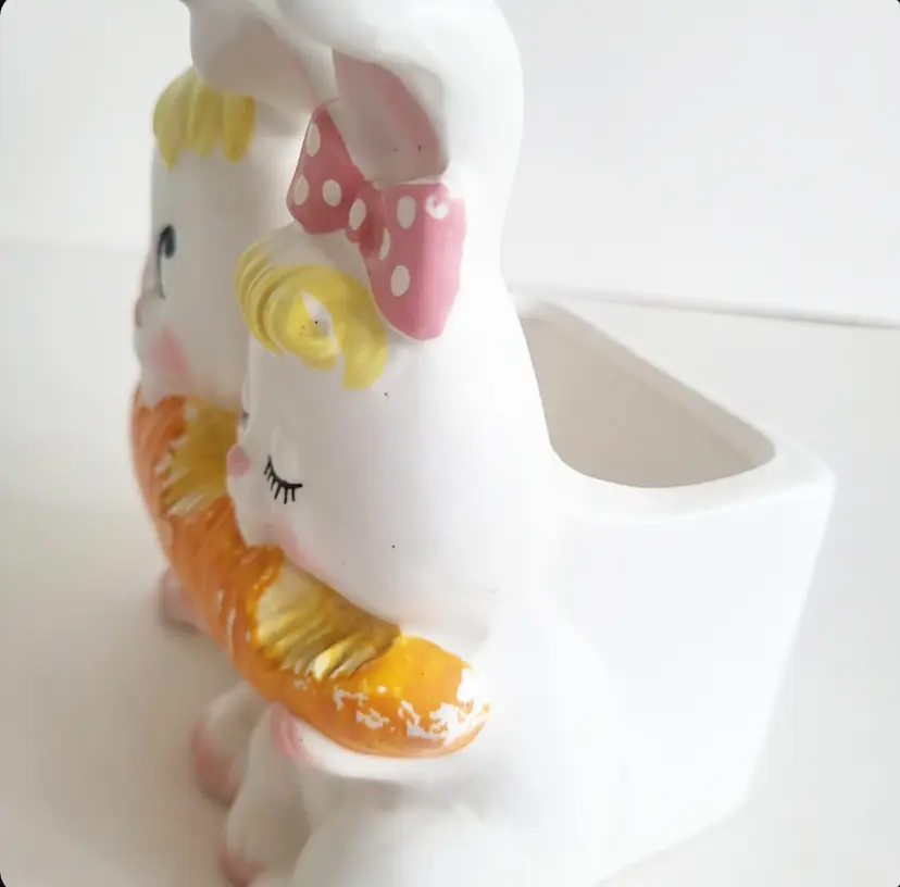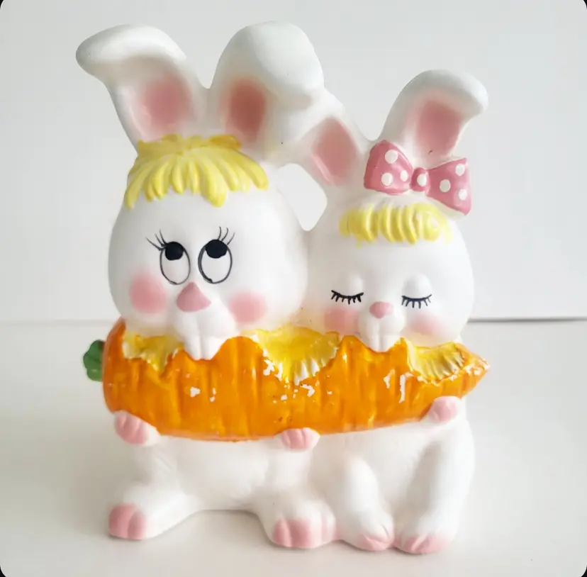 π₯ Vintage Napco Easter Bunnies eating on a carrot planter SWIPE FOR DETAILS π° There is some scratching to the coldpaint, a couple tiny fleabites on the end of the carrot stem, rim of planter and a glaze rub on the back of one ear. Napco foil sticker on bottom. Measures 5.5 in x 6.5 in x 4 in π₯