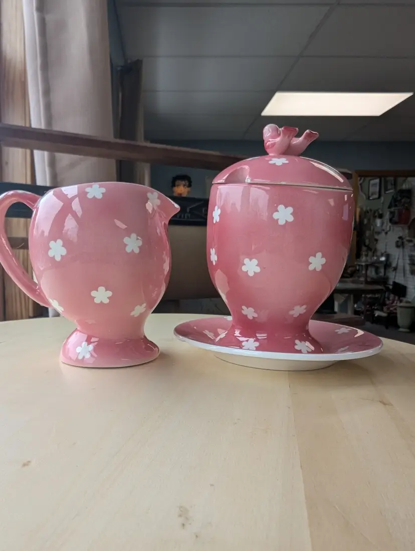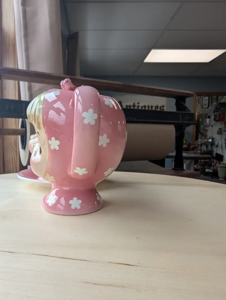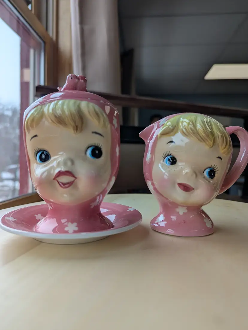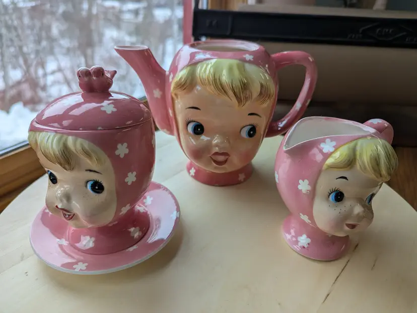 Vintage Napco Japan tea set featuring the highly sought after Miss Cutie-Pie. Finding this as a set is incredibly difficult so this is a great gift for any collector. Comes with the teapot (no lid) and the cream and sugar (sugar has lid, no spoon). Each piece is marked.