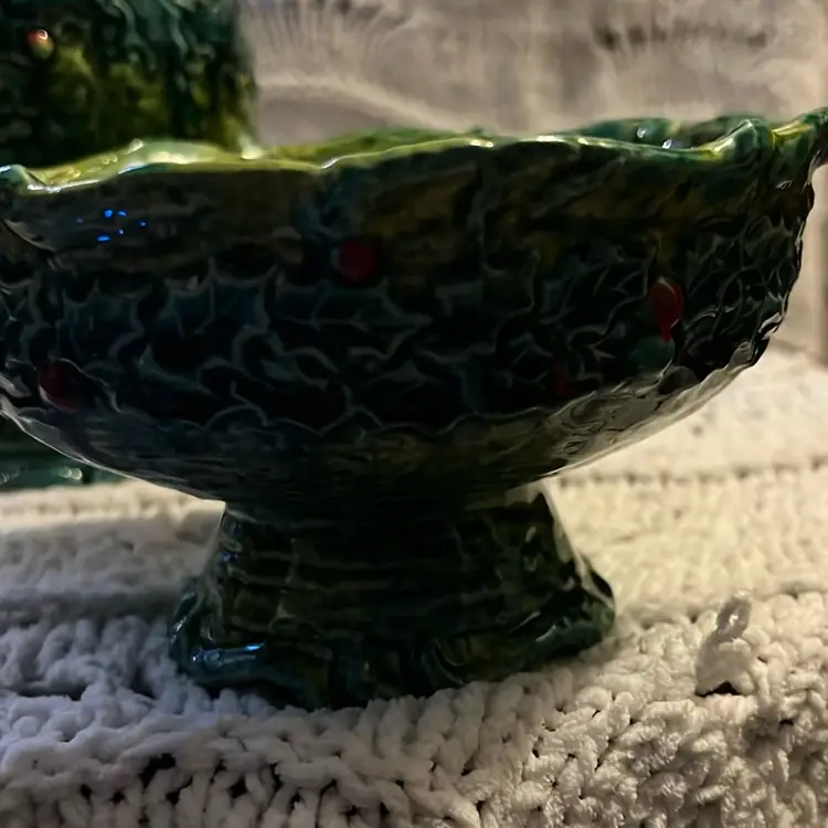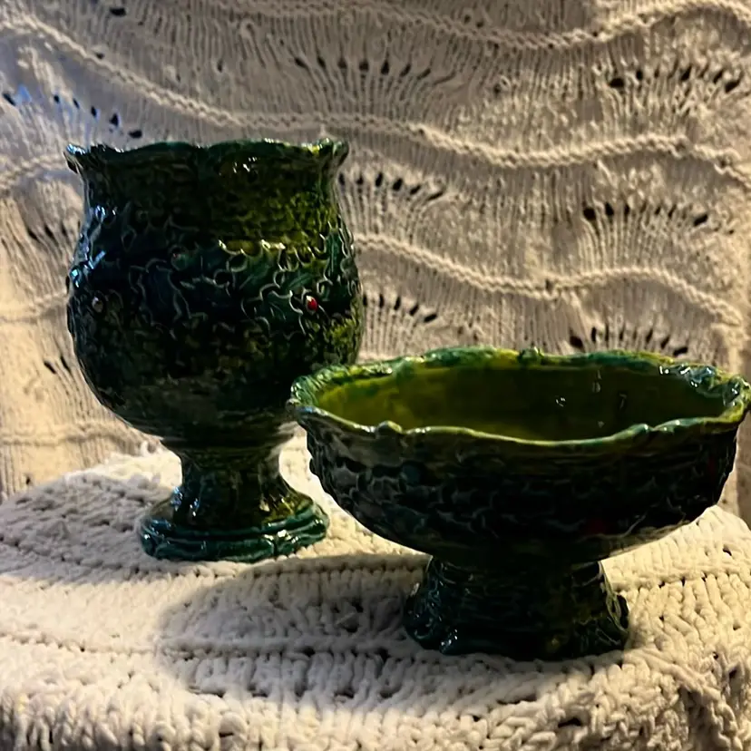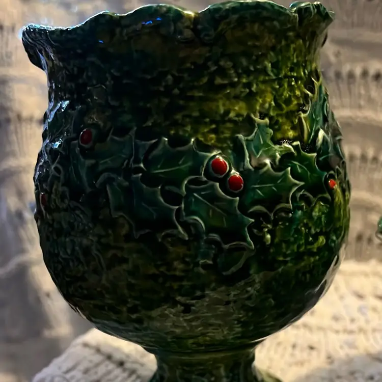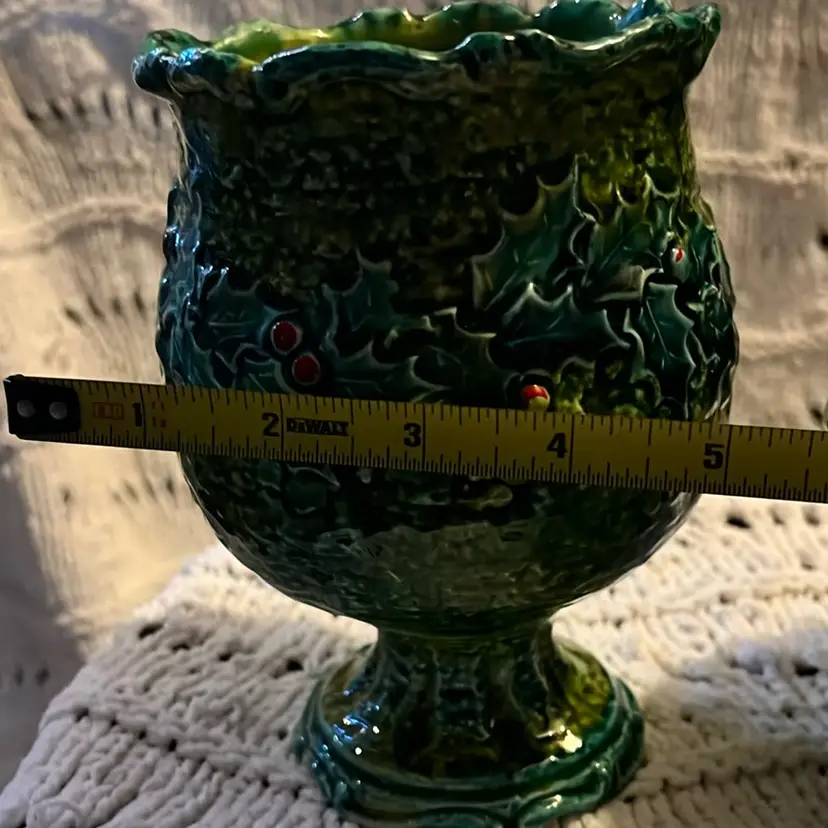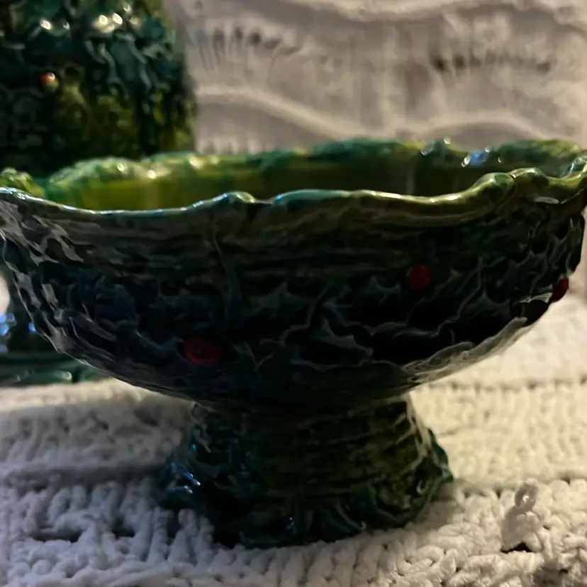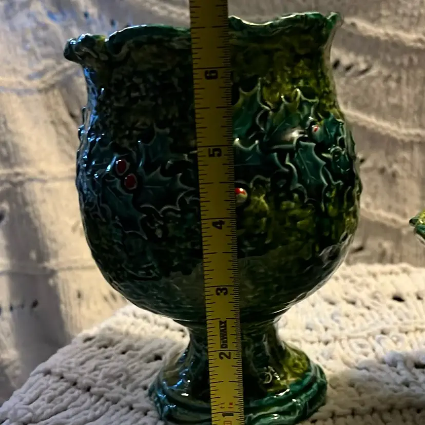 Vintage Napcoware ceramic Christmas planter and candle holder with Holly Berries for design. Green and red colors with a shiny glaze. The planter measures 7 inches tall and about 5.5 inches wide. The candle holder is 3 1/2 inches tall and about 6 inches wide.