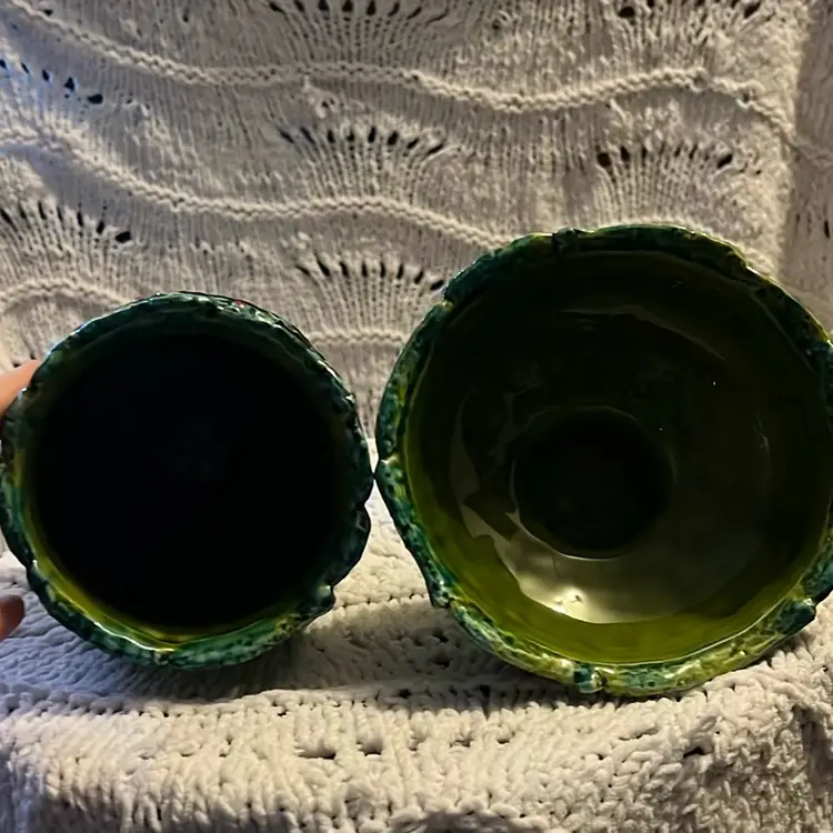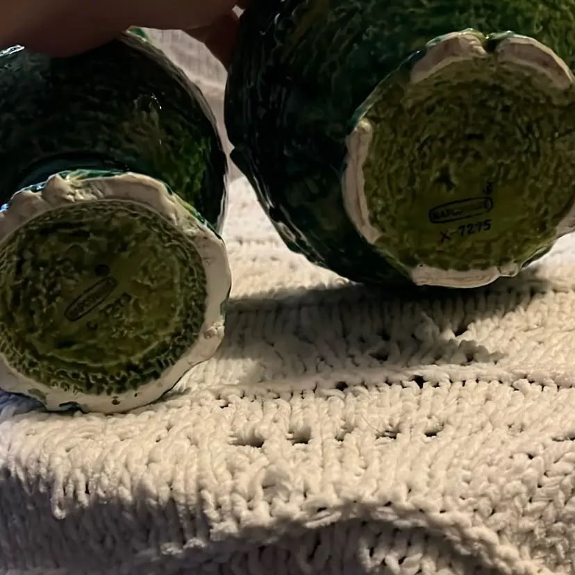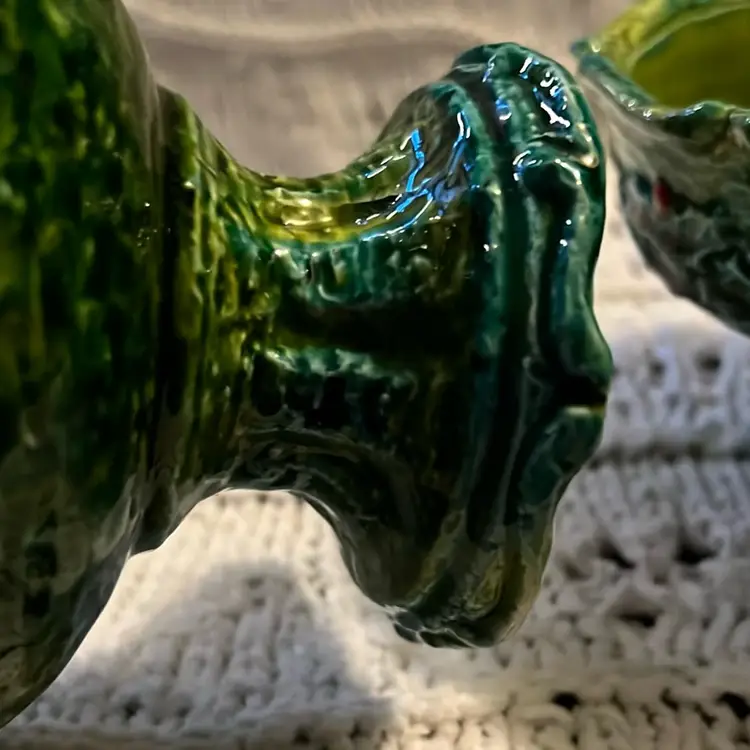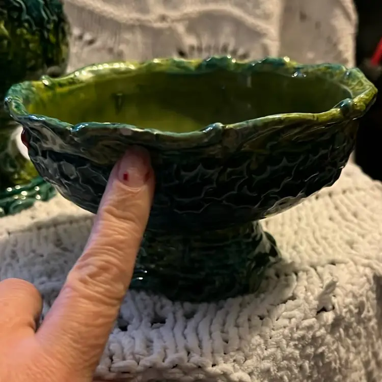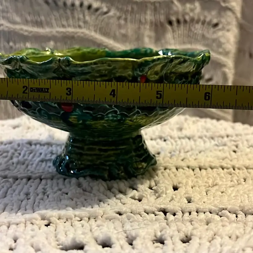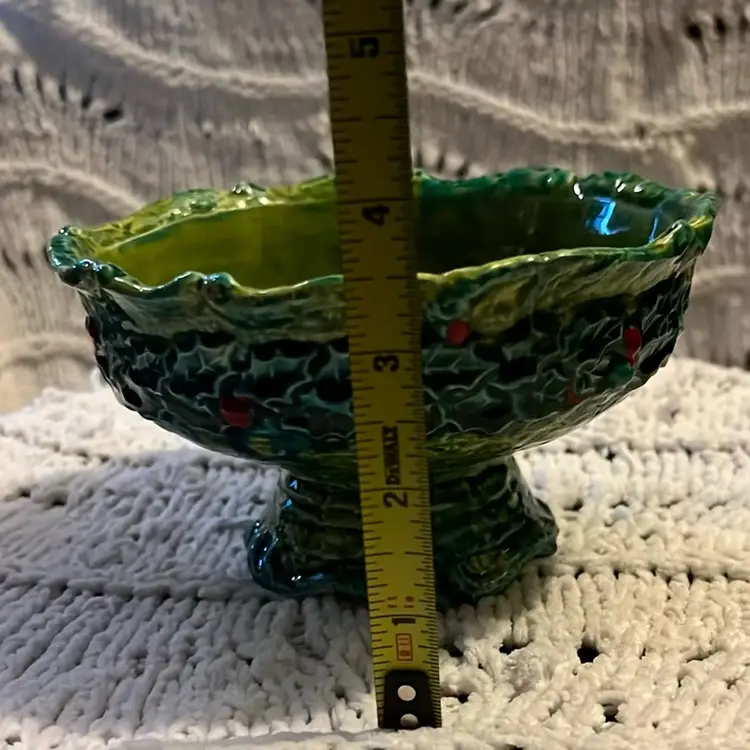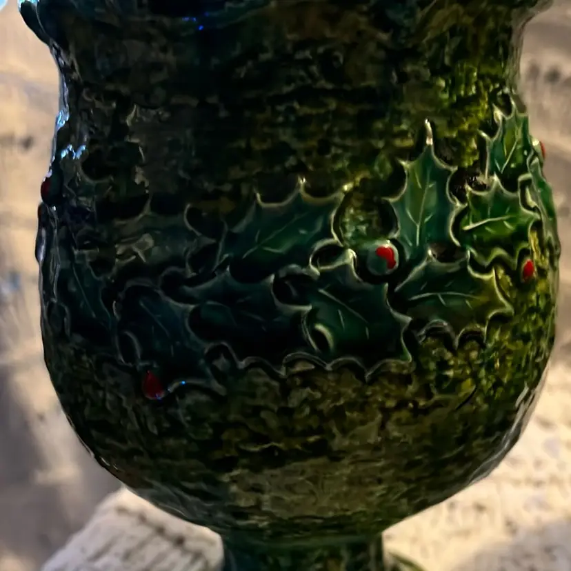 Vintage Napcoware ceramic Christmas planter and candle holder with Holly Berries for design. Green and red colors with a shiny glaze. The planter measures 7 inches tall and about 5.5 inches wide. The candle holder is 3 1/2 inches tall and about 6 inches wide.
