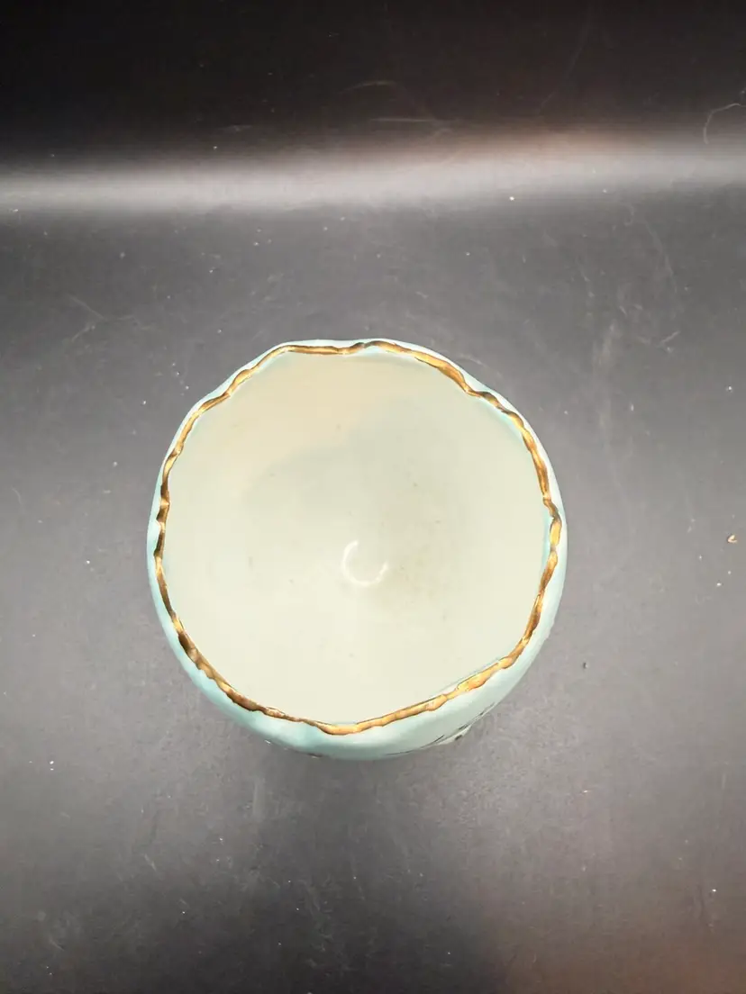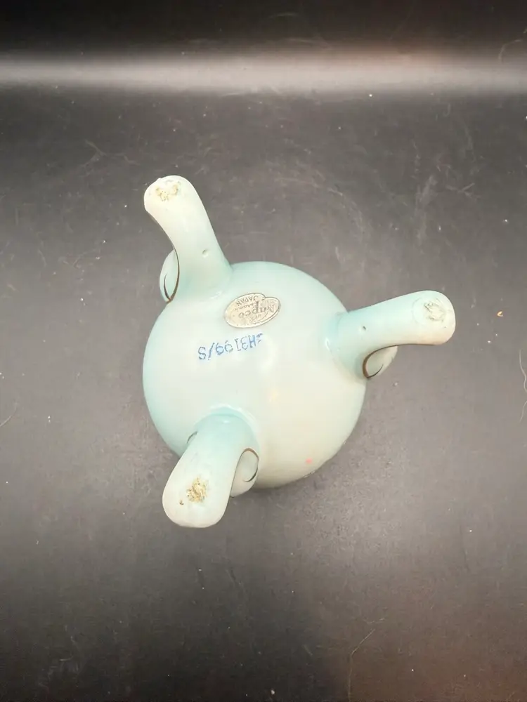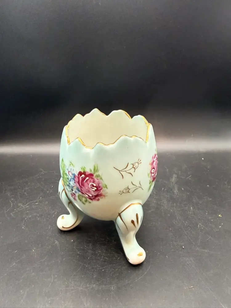 These items were popular for home decor and as gifts during the 1950s and 1960s. This "cracked egg" vase, with its distinctive shape and floral embellishments, is a representative example of Napcoware's output. The design, featuring a stylized egg form supported by three feet and decorated with hand-painted roses and gold trim, reflects the popular aesthetic of the mid-century period.