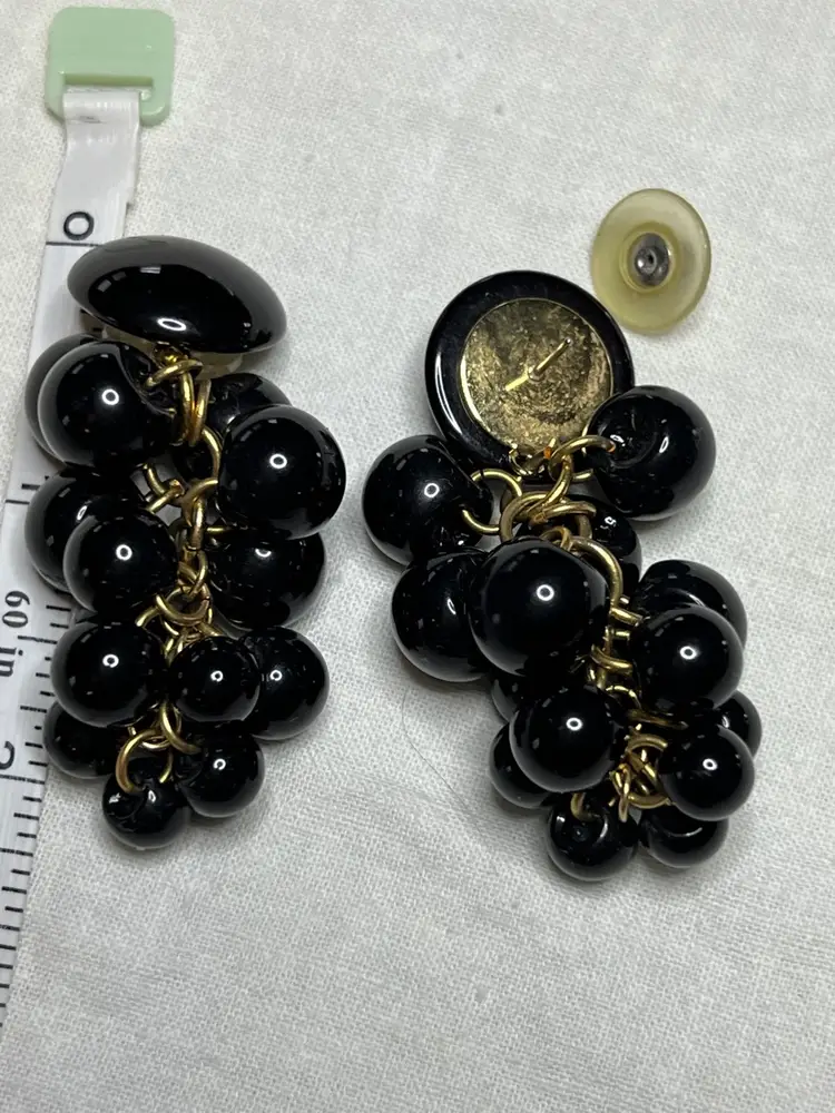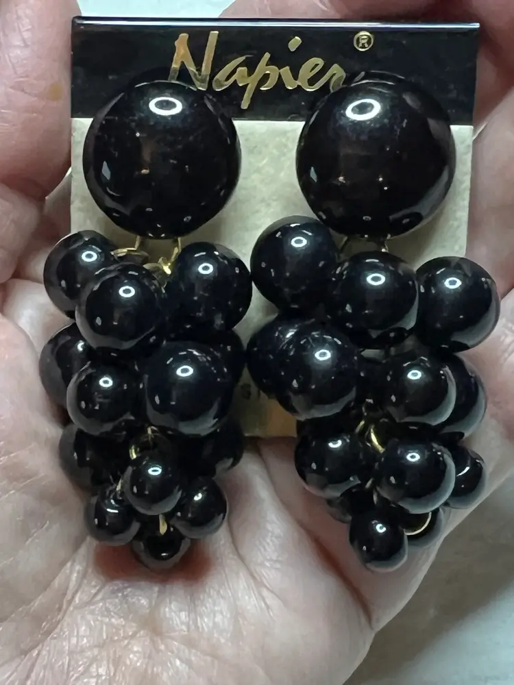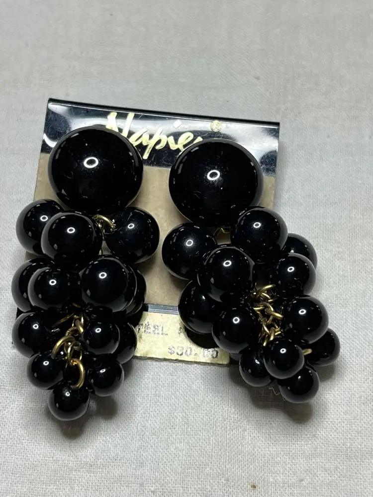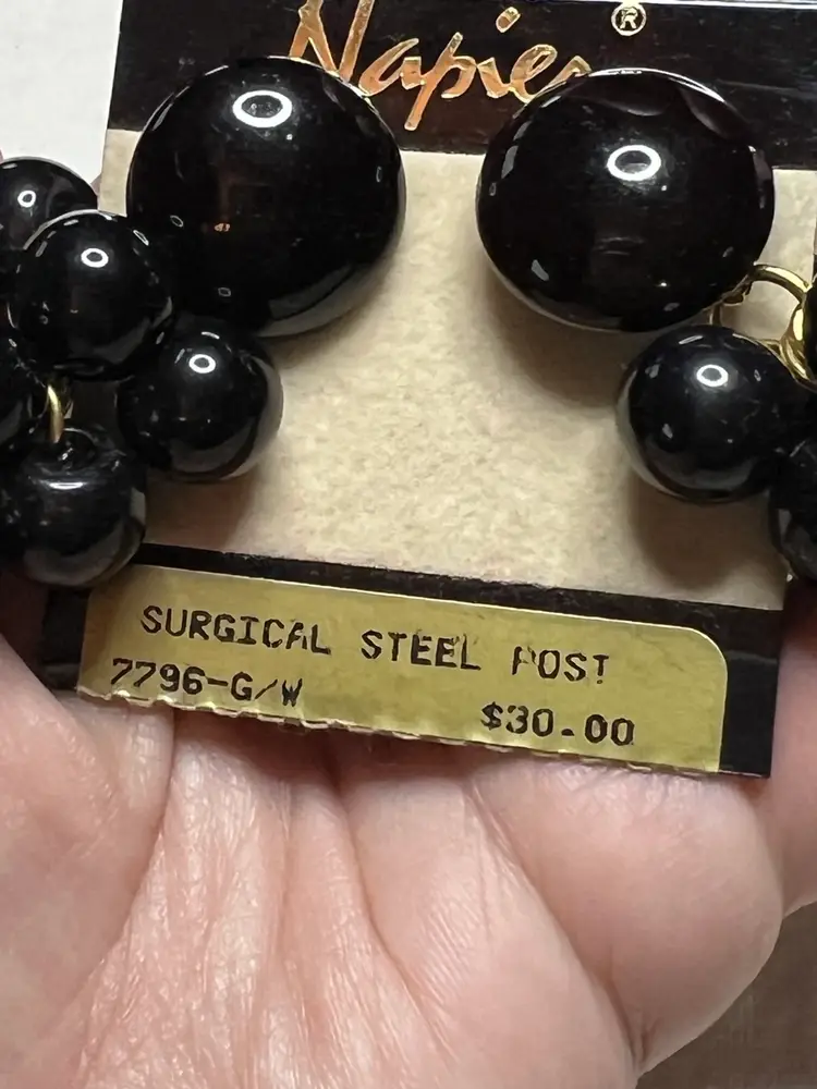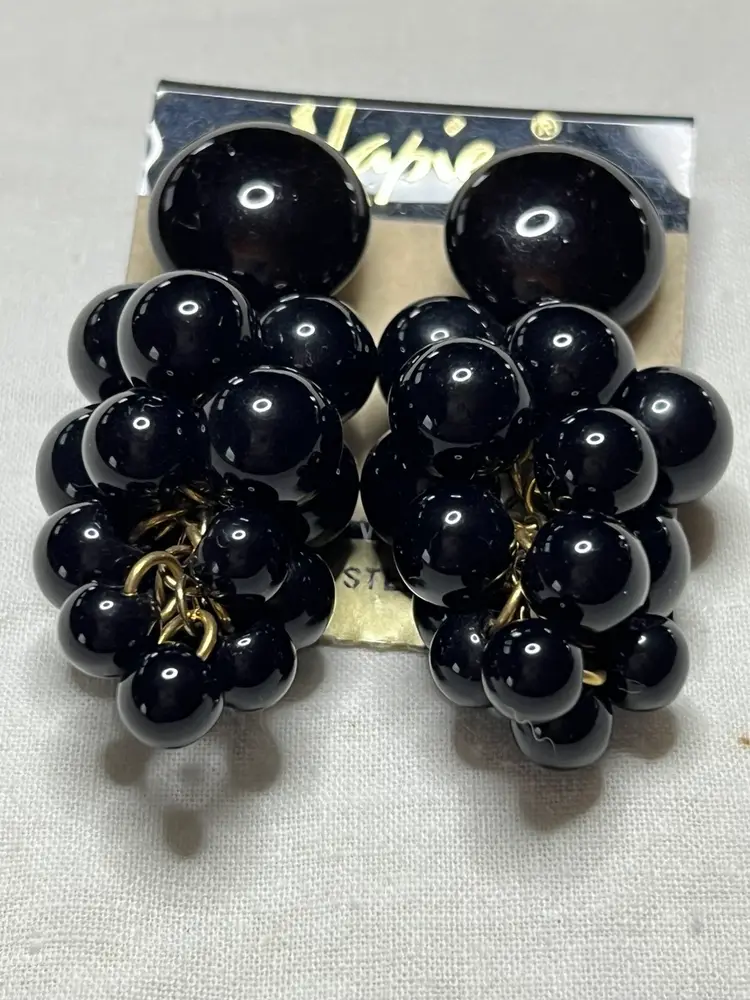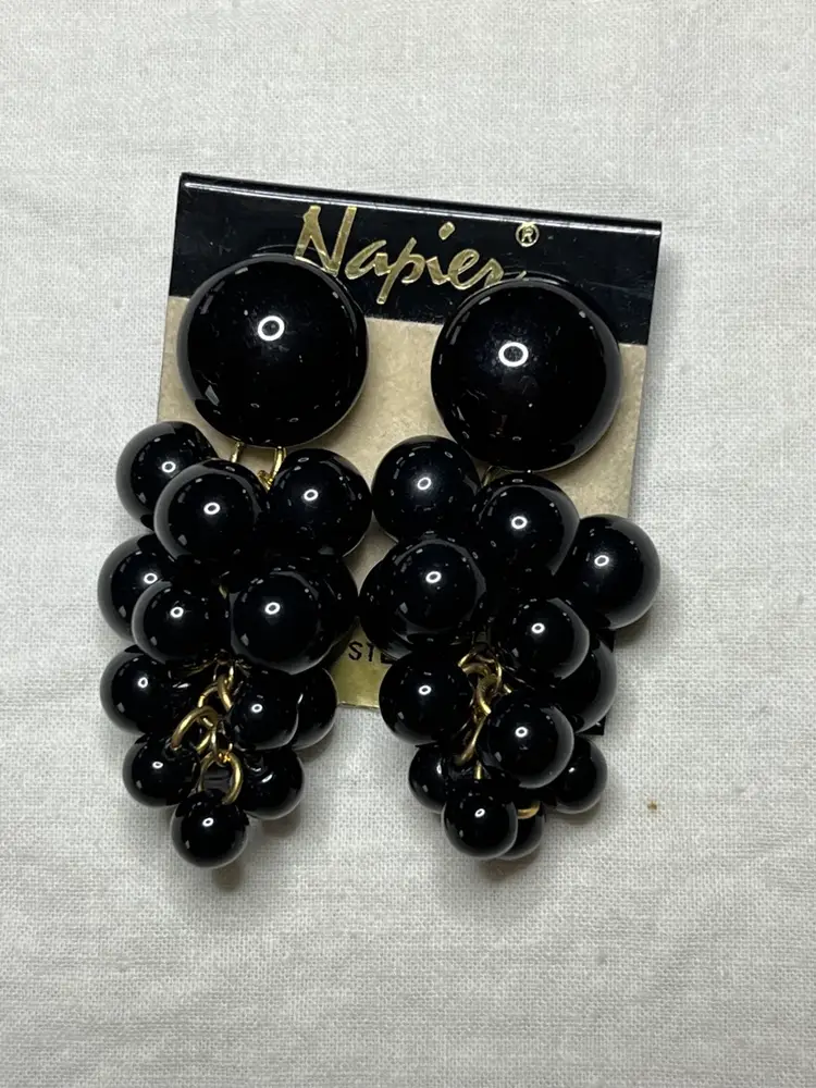 Add a touch of vintage glamour to your look with these stunning black dangle drop earrings from Napier. The grape cluster shape and synthetic bead stones give these earrings a unique and elegant style. These earrings have a surgical steel post and are suitable for pierced ears.