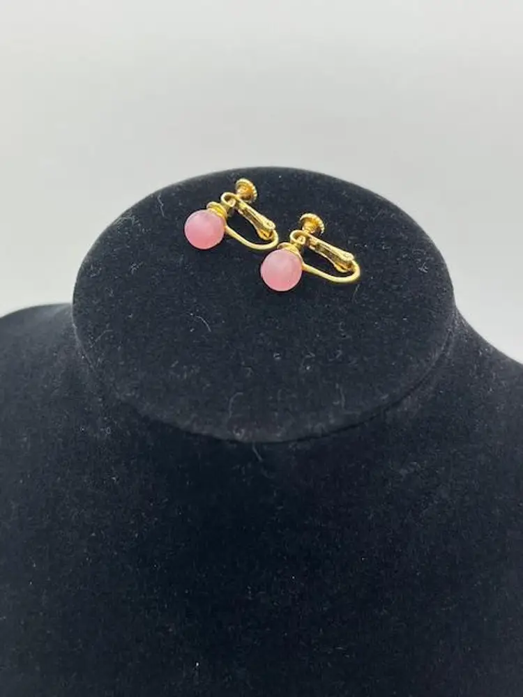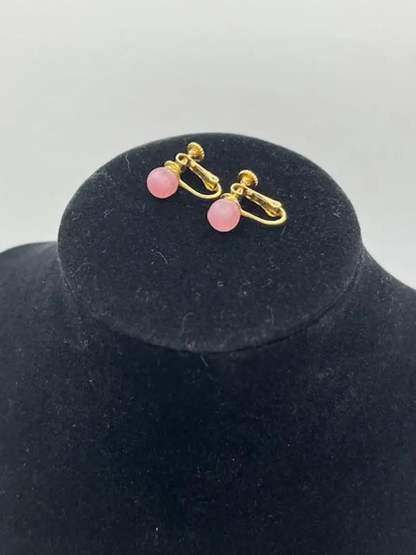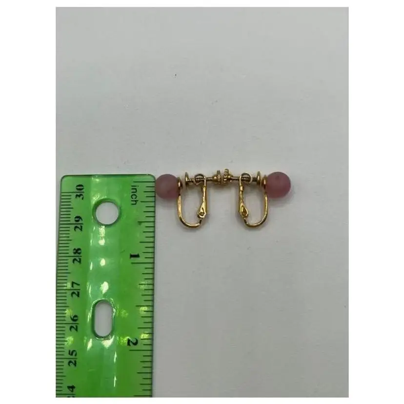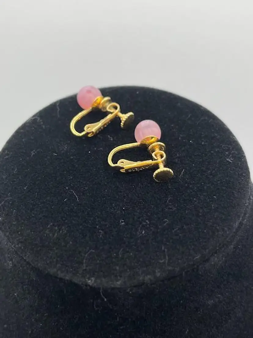 Add a touch of vintage elegance to your collection with these stunning Napier earrings. These earrings feature a beautiful gold tone with screw back closure for secure wear. The single frosted pink bead on each gives these earrings a unique and timeless appeal. The earrings are signed by the brand, Napier, and also is marked Pat No 3,176,475. These earrings are perfect for any fashion-forward woman who wants to add a touch of sophistication to her style. They measure 3/4" in length and are in excellent vintage condition.