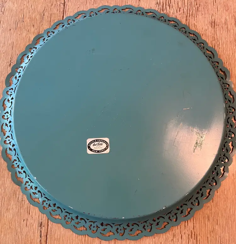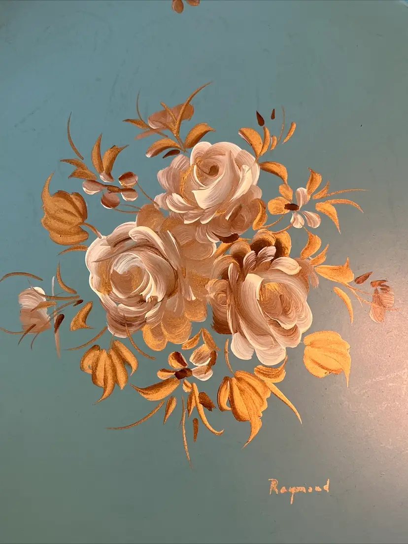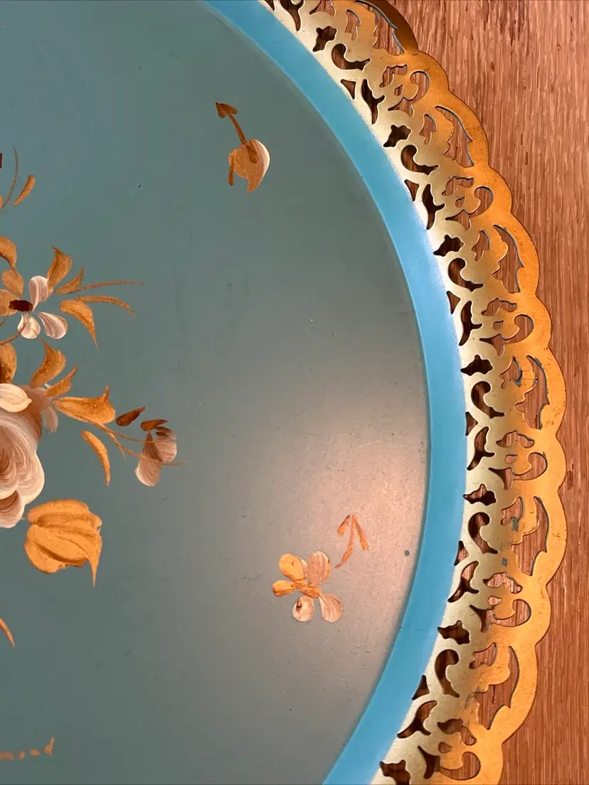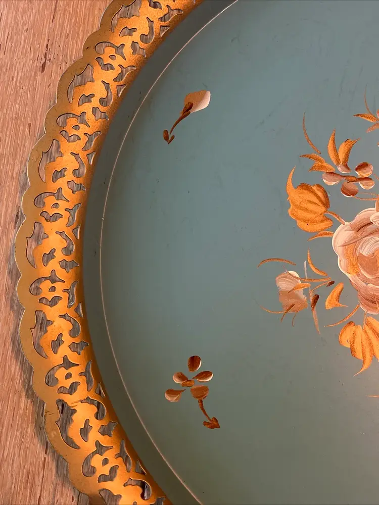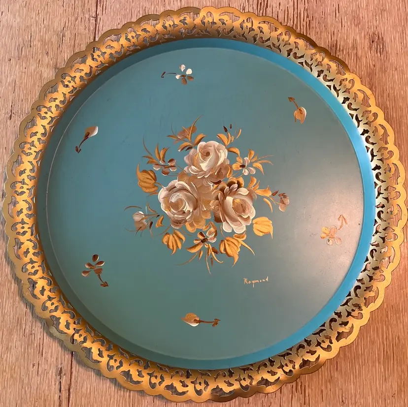 Vintage Nashco round, metal, turquoise blue, hand painted serving tray with flowers in the center and gold filigree rim. Signed "Raymond". Approximately 15" in diameter. Pre-owned and in vintage condition. Expect normal wear such as scuffs, scratches and minor bends. See photos and ask any questions prior to purchase.
