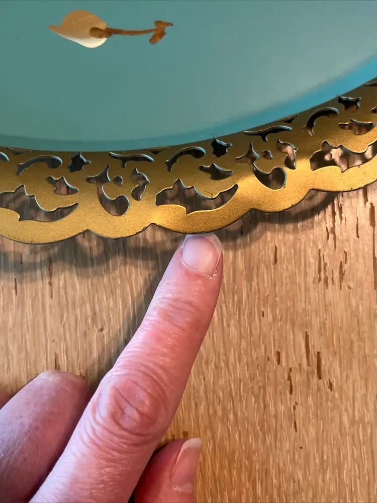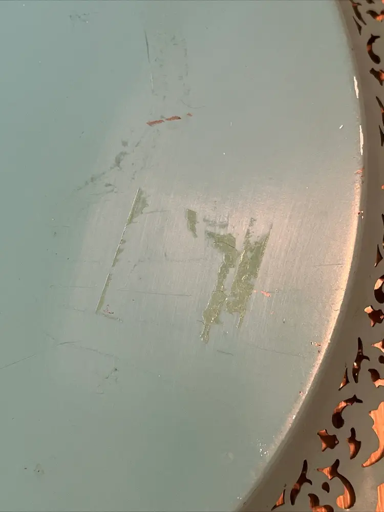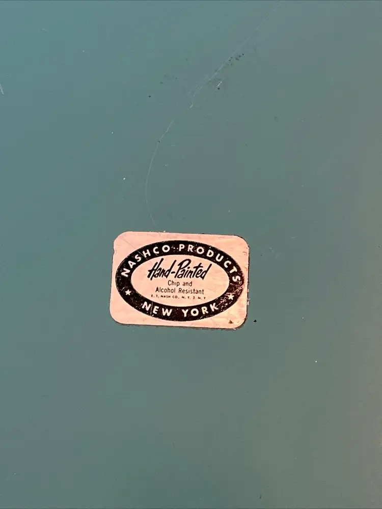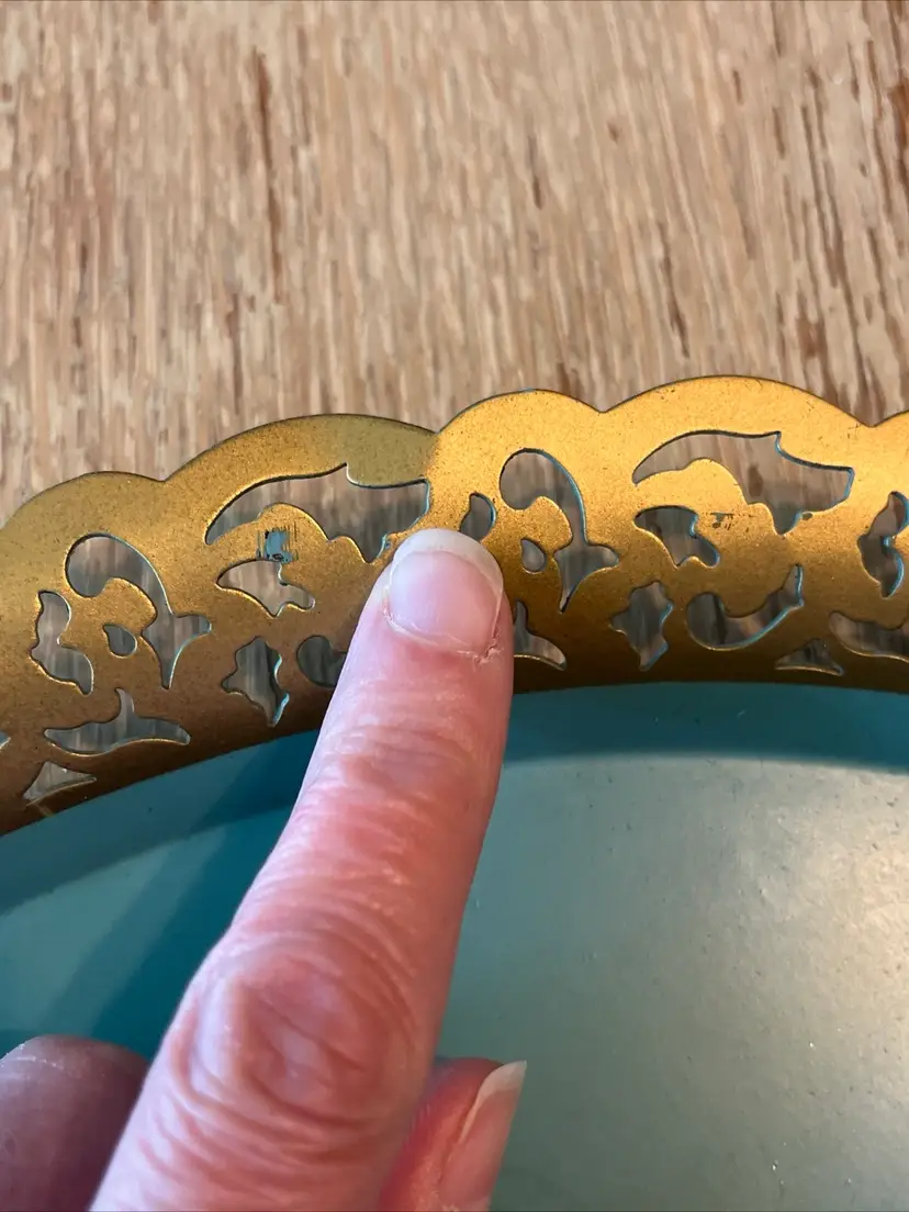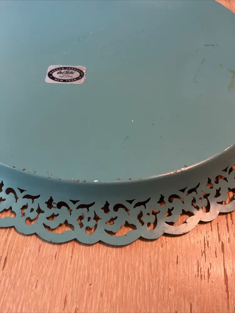 Vintage Nashco round, metal, turquoise blue, hand painted serving tray with flowers in the center and gold filigree rim. Signed "Raymond". Approximately 15" in diameter. Pre-owned and in vintage condition. Expect normal wear such as scuffs, scratches and minor bends. See photos and ask any questions prior to purchase.