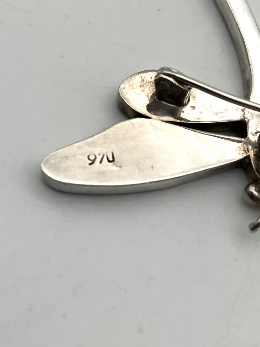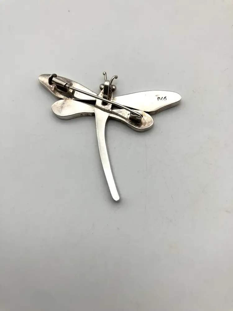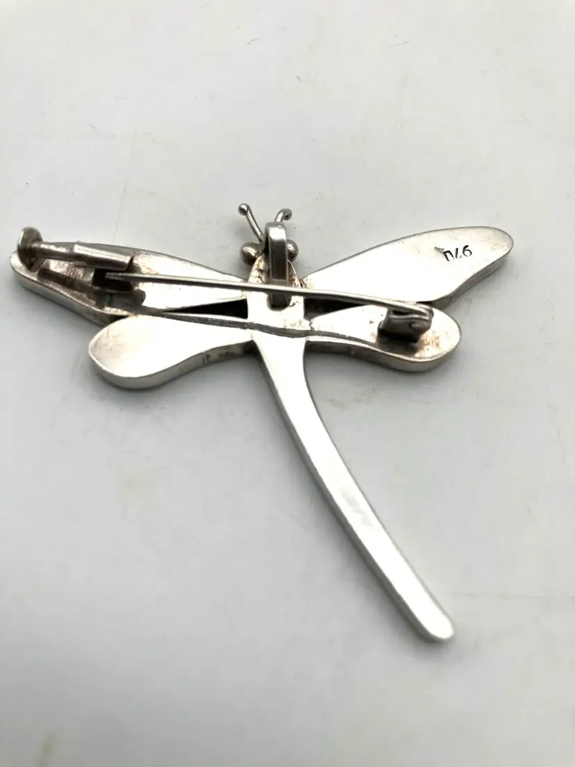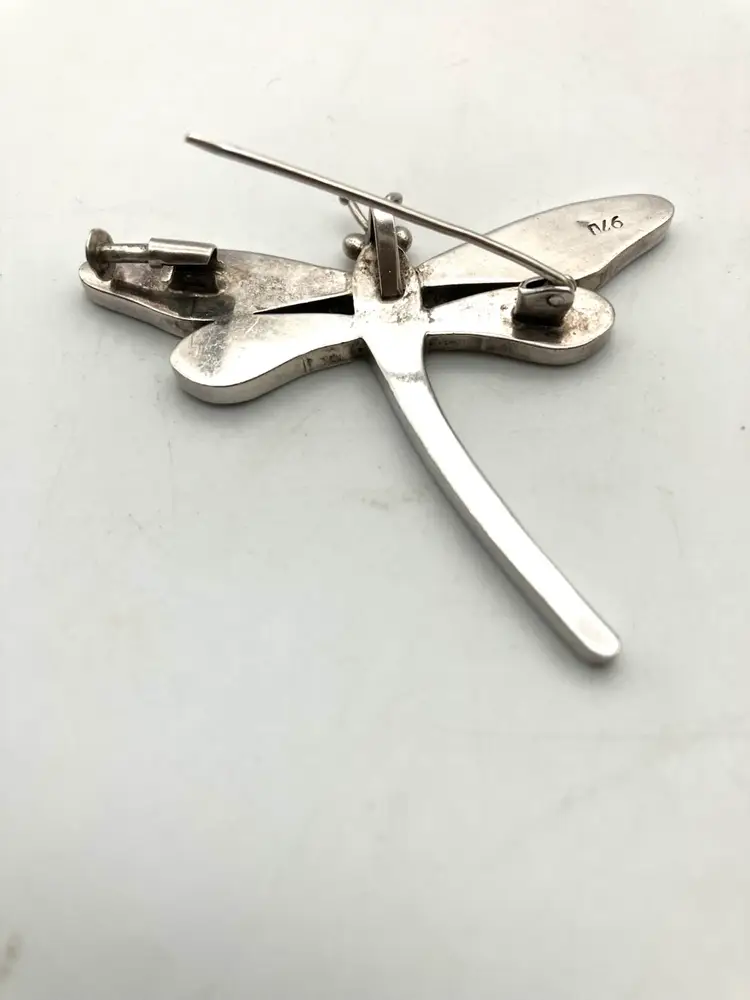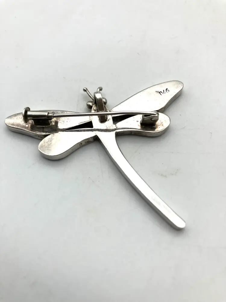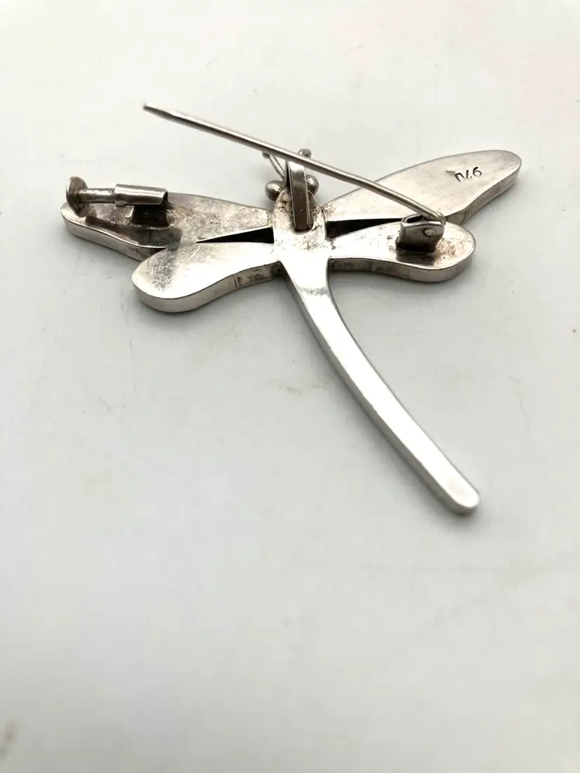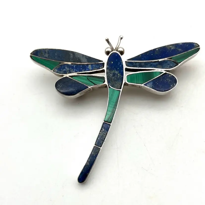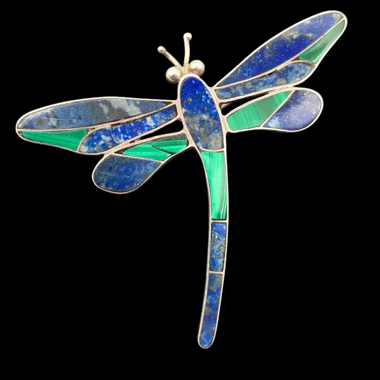This gorgeous dragonfly pin (also has loop to hang from a chain) is inlaid with blue lapis lazuli (identified by pyrite flakes and calcite inclusions) and malachite stones. The clasp is really cool and quality made. The pin is in great condition. Under the loupe there is a small scratch on the left upper wing that I can’t see with my naked eye. Pin measures 2.25” x 2”.