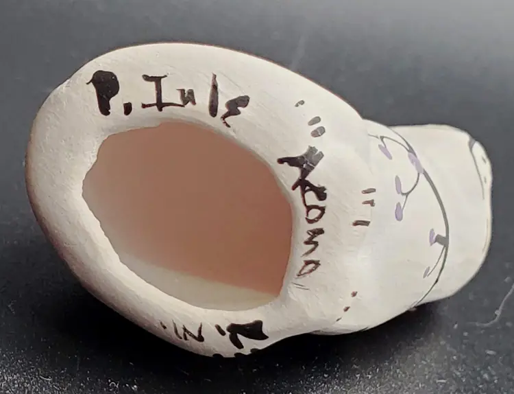 Signed P. Iule Acoma NM, this figurine is decorated with Iule's distinctive style in black and purple markings.
