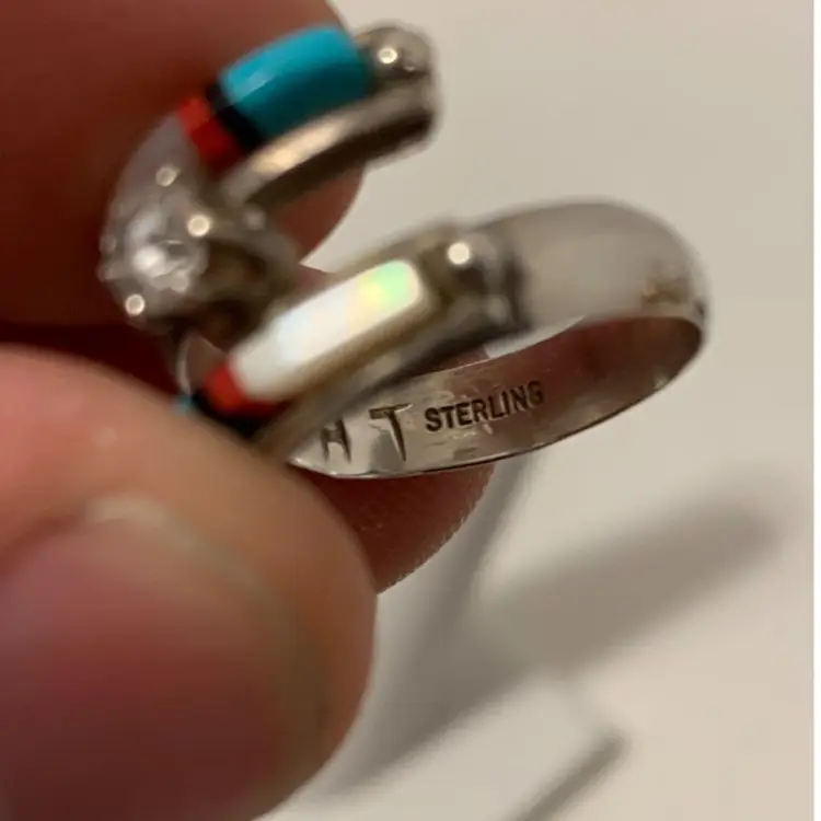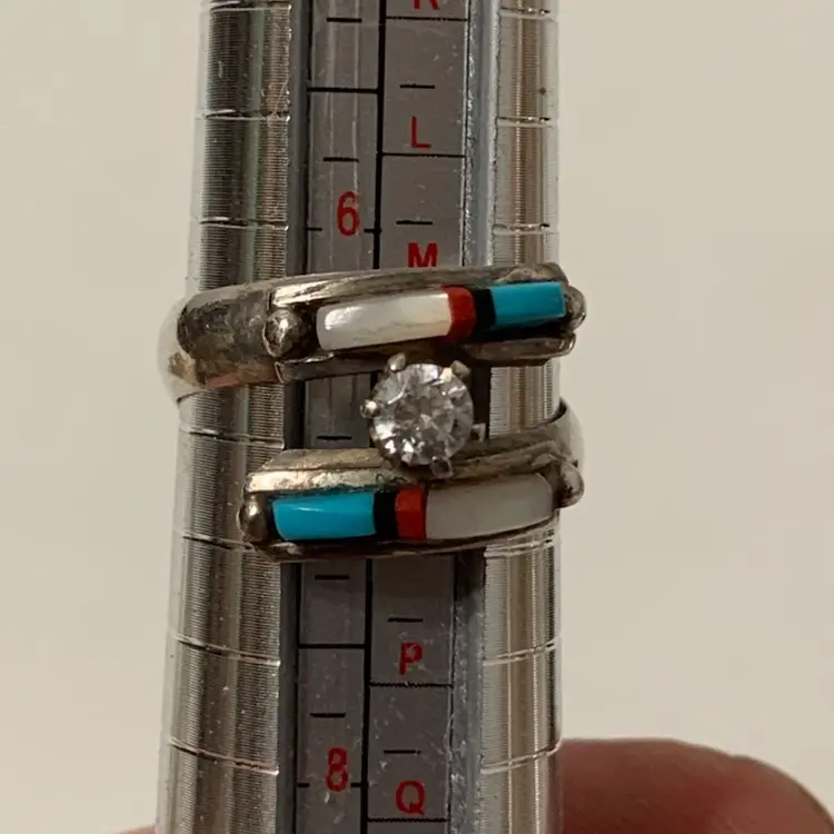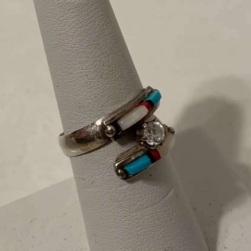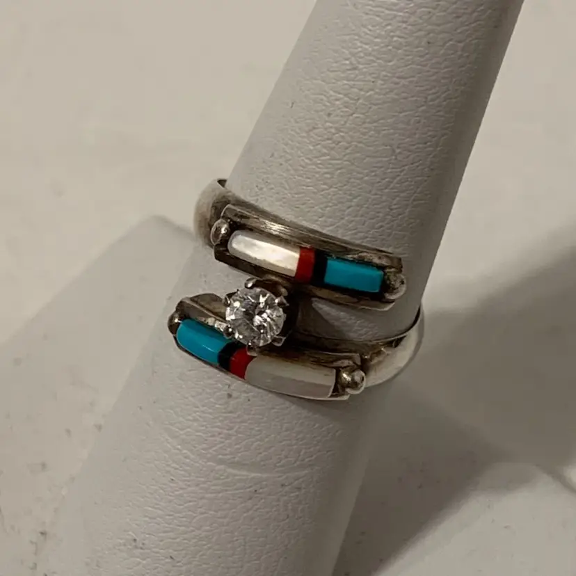 Lovely ring in great condition! CZ center stone. Multi stone turquoise, coral, onyx, and mother of pearl accents. Size 6.5. Sold as is!