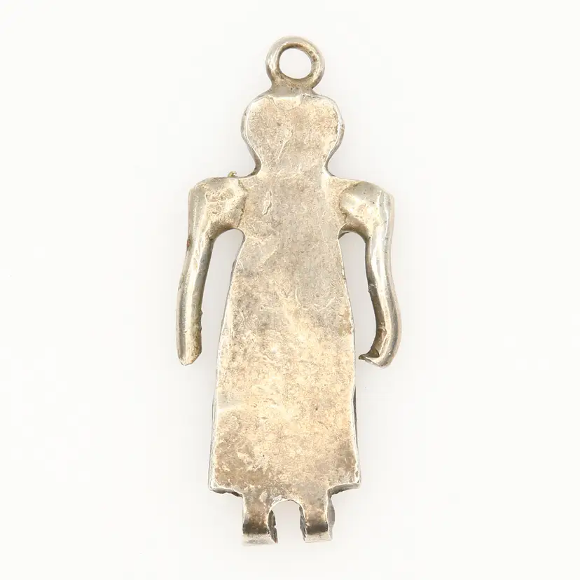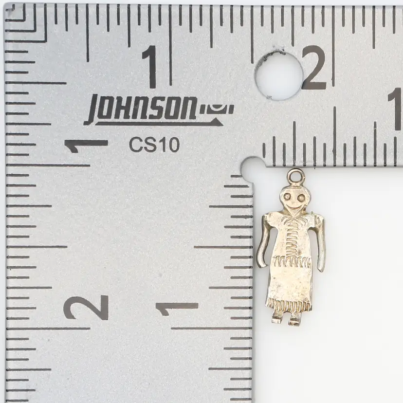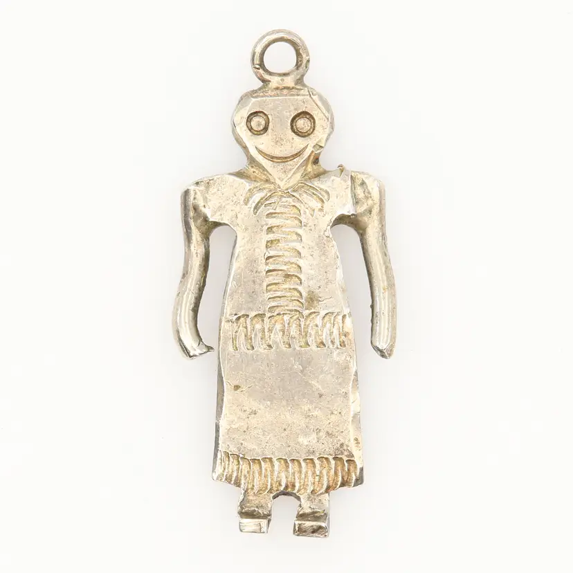 This charming vintage silver Native American or Southwestern-inspired charm, crafted in the 1950s, features a stylized human figure. The figure is wearing a fringed traditional dress or robe with moccasins and has a simple, smiling face with large circular eyes. Cute and unique, this delightful charm adds a touch of fun to your day. This silver smiling human charm is perfect for brightening your jewelry collection or as a standout addition to any vintage charm or Southwestern jewelry collection!