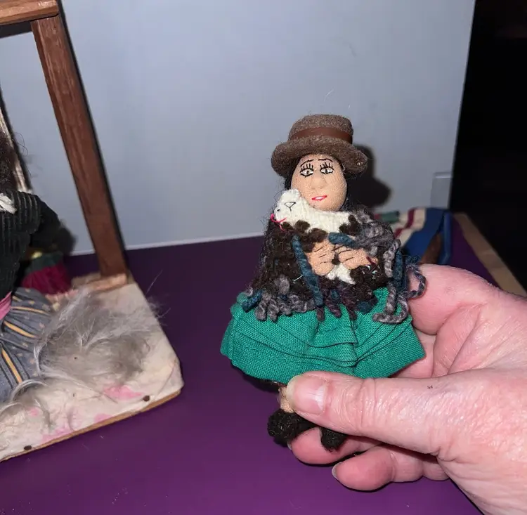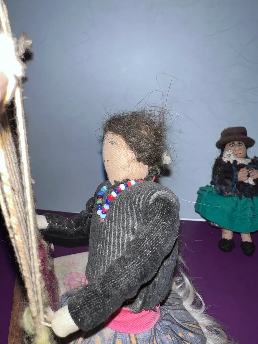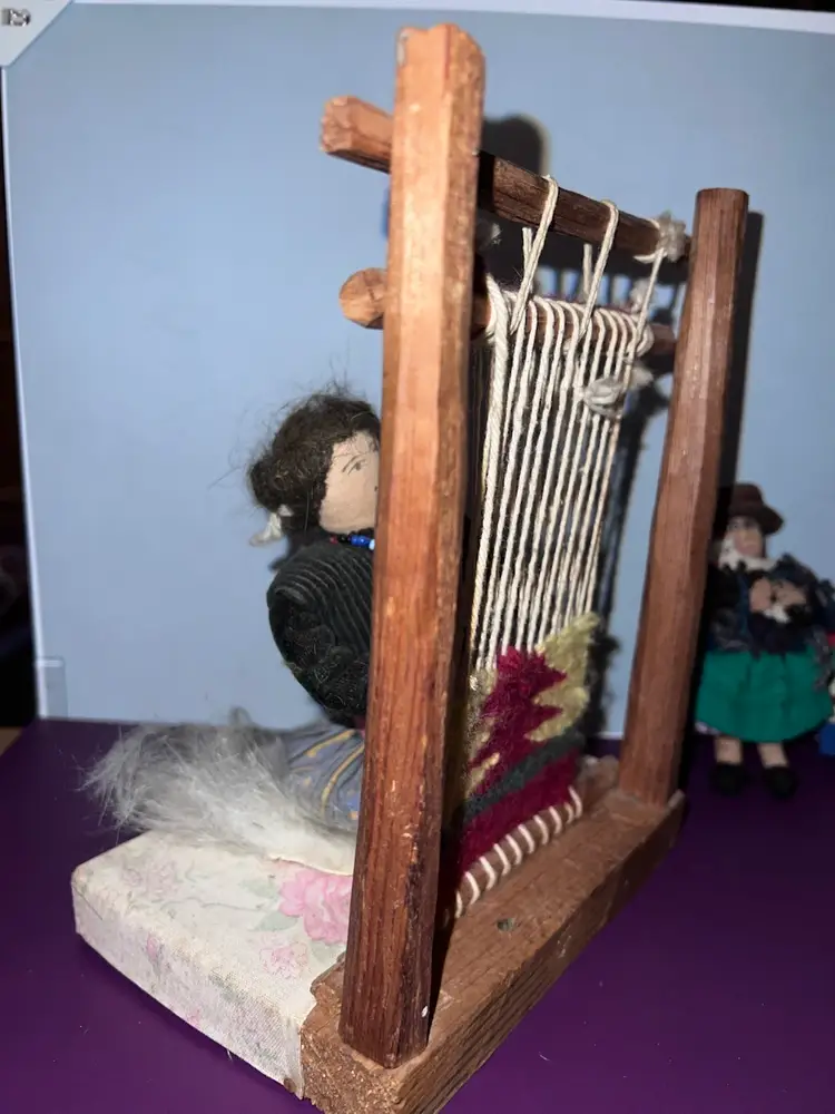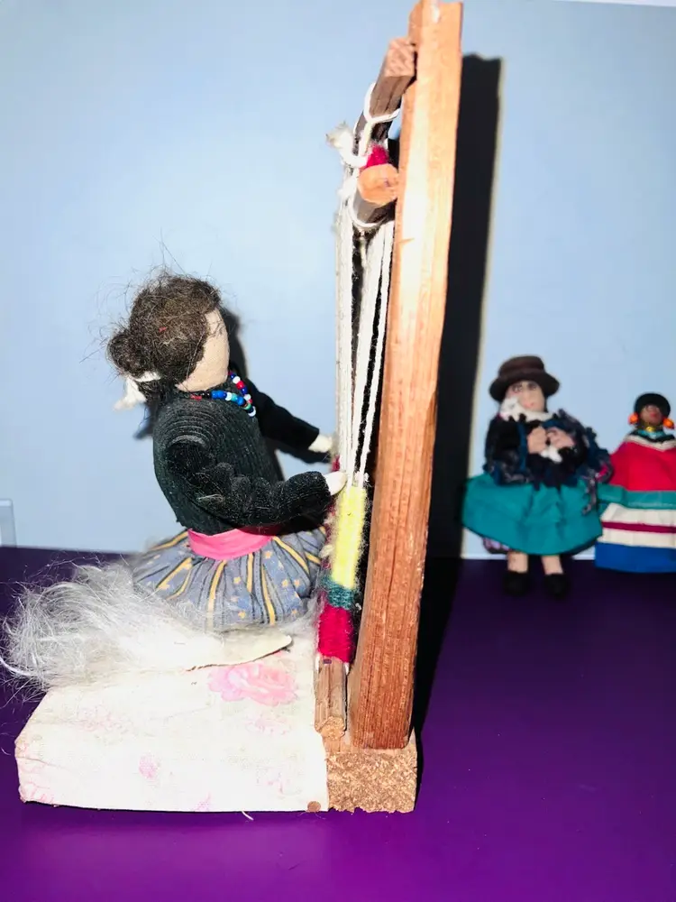 Cloth Native American woman at loom weaving a rug. 8”by 6”.