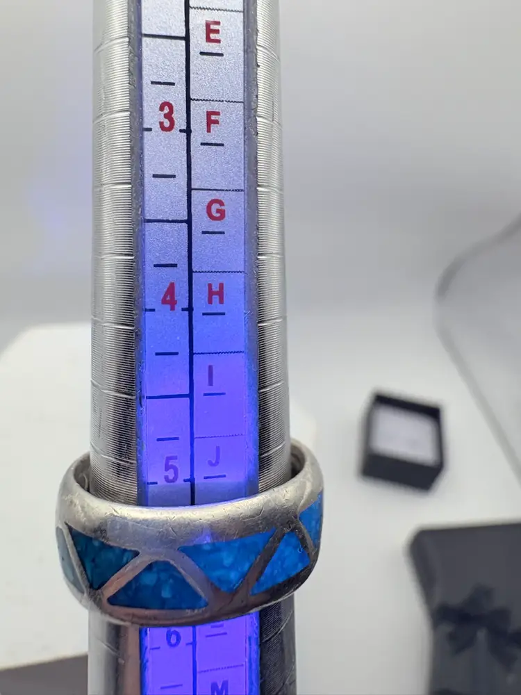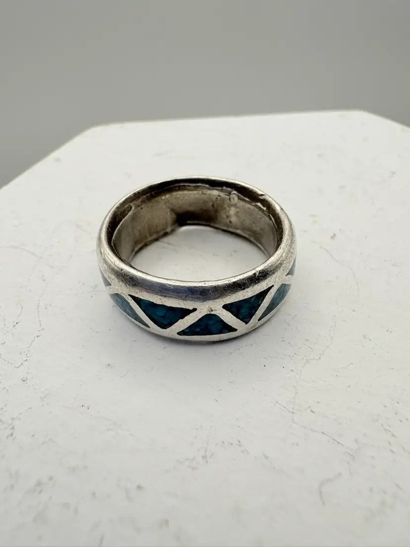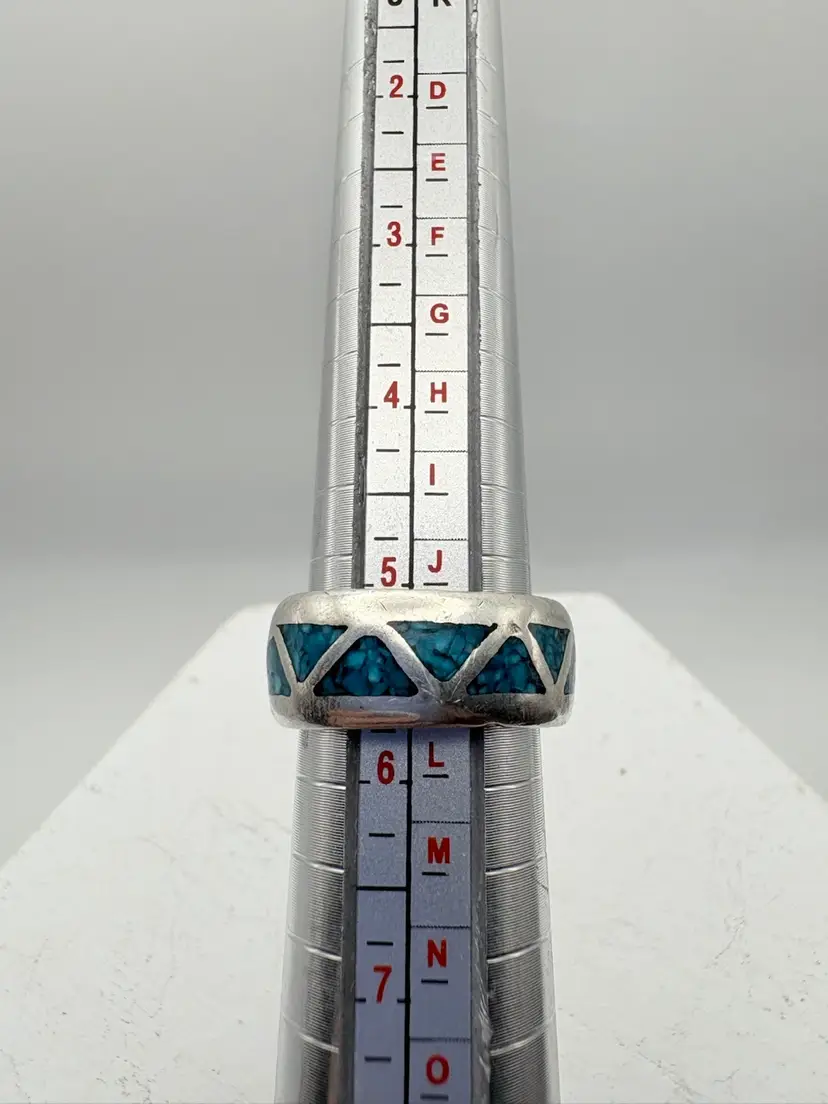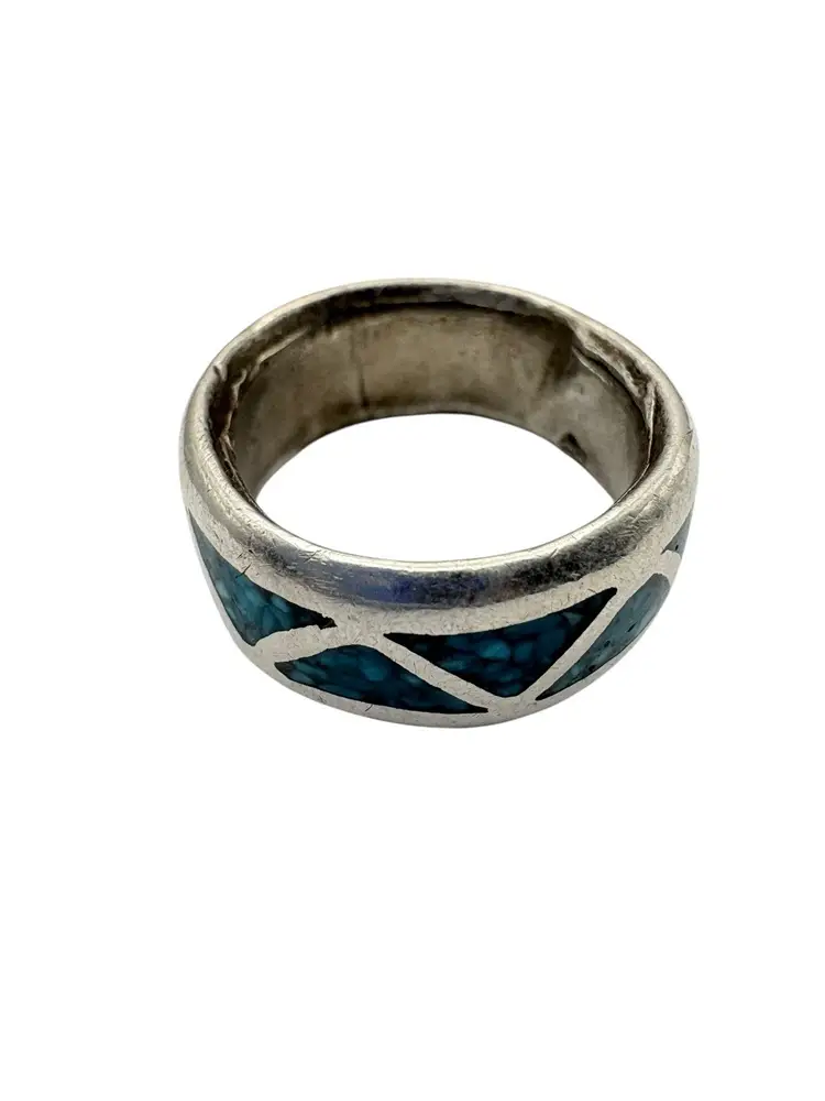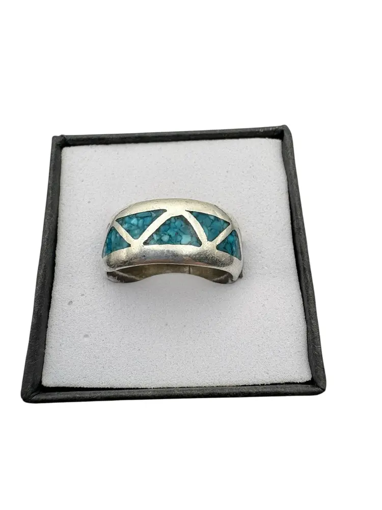 Vintage Native style sterling silver turquoise chip inlay ring. • Size: approx. 3.5 to 3.75 US • Distinctive turquoise chip inlay design with geometric pattern • Old pawn style band, traditional Native design influence • Sterling silver, tested • Small size – possibly a youth, pinky, or “baby” ring
