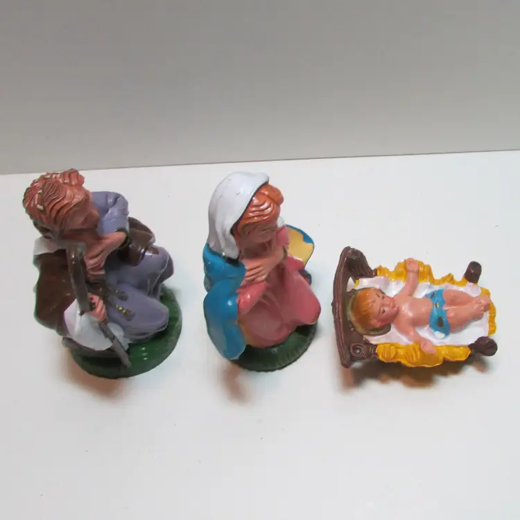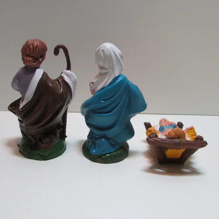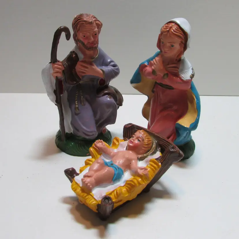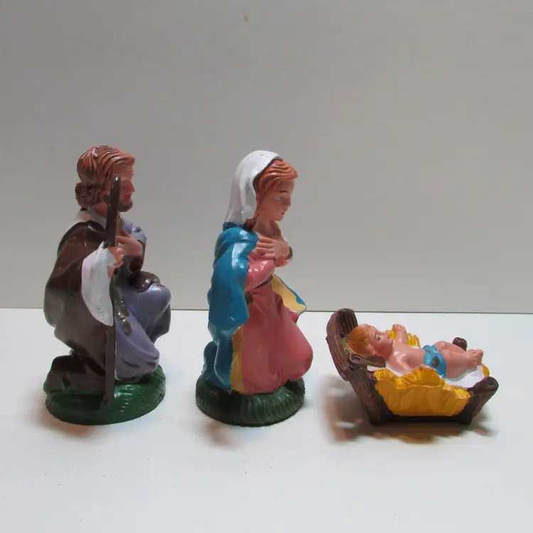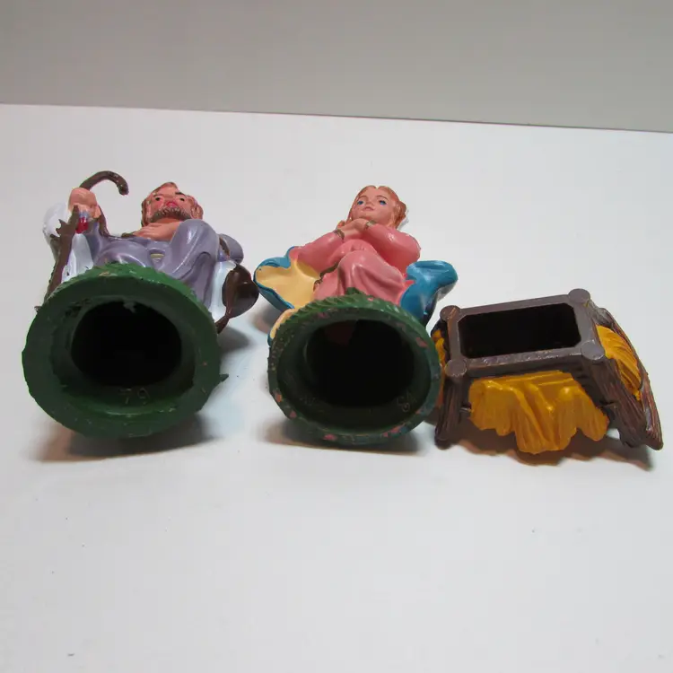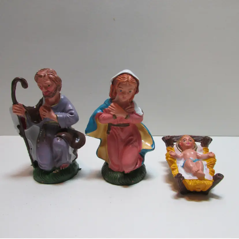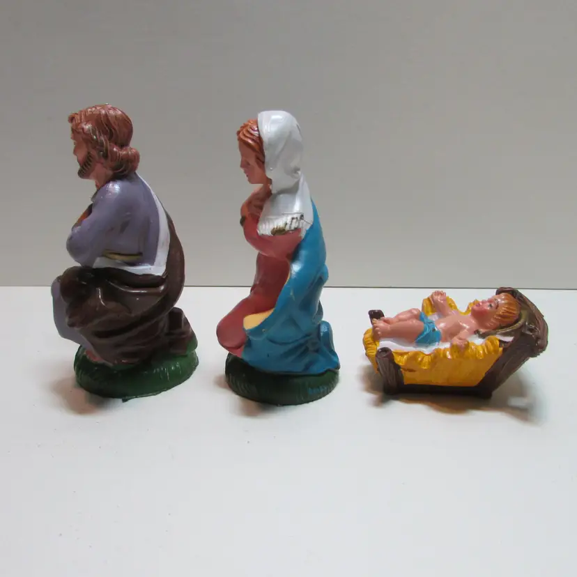 This lovely set has some wear, but still a beautiful set to display. Joseph is about 4" x 2 1/2" x 2" and the baby Jesus is about 1" x 2 1/2" x 1 3/4". This is shipped from a smoke free home. Thanks for looking! locfb14