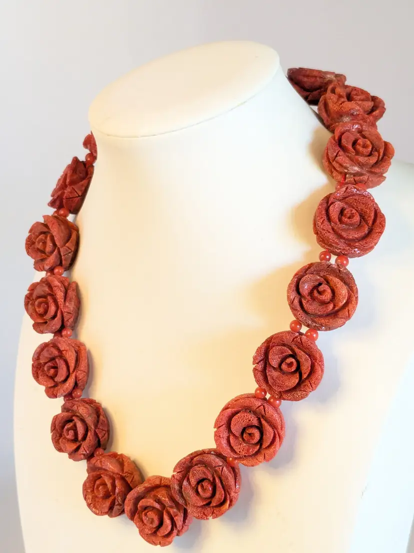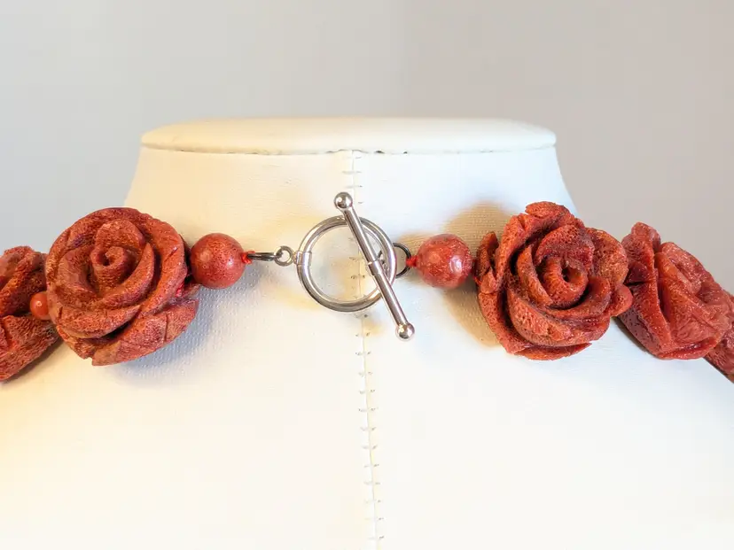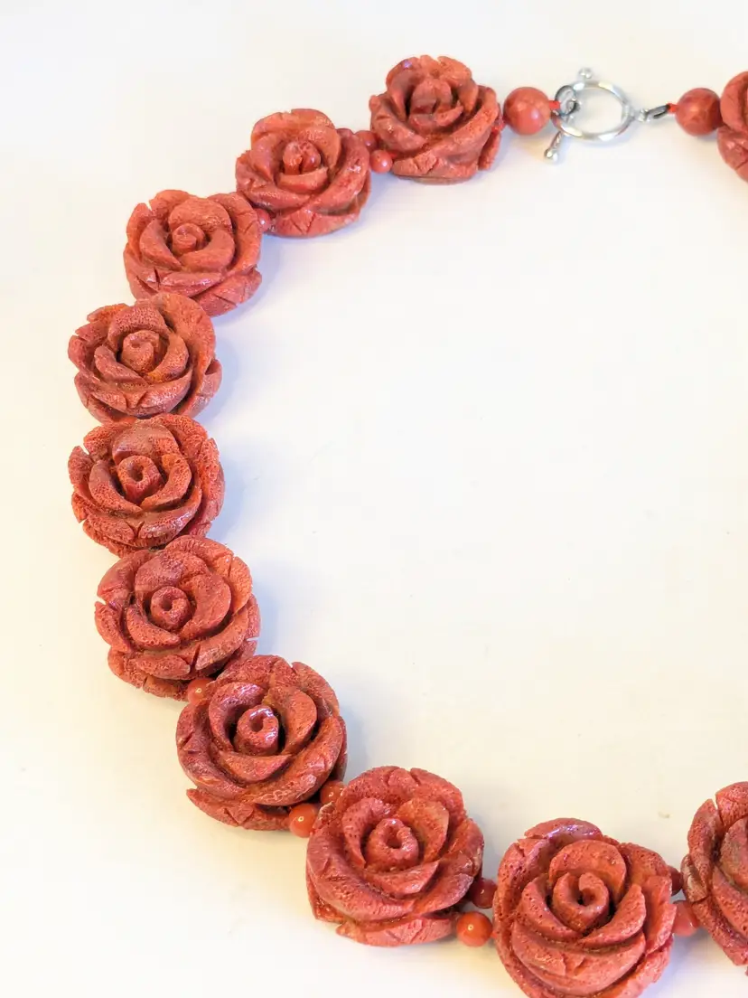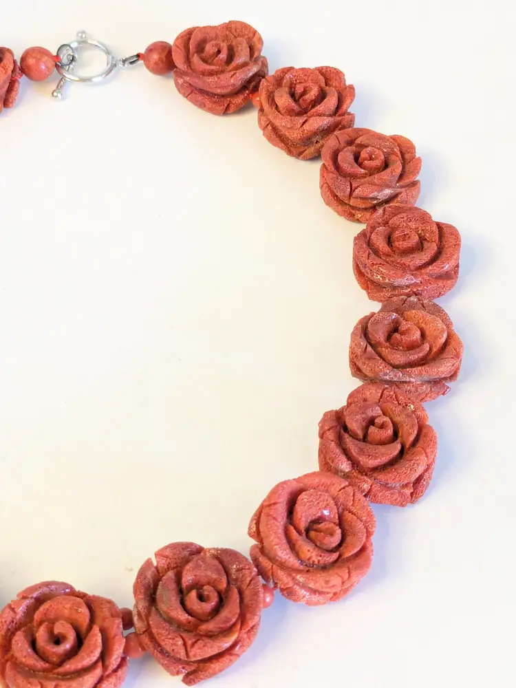 Absolutely fabulous! Good condition. Carved sponge coral red rose necklace with a silver tone toggle clasp. Measures 16". Roses are 7/8" x 7/8". wen