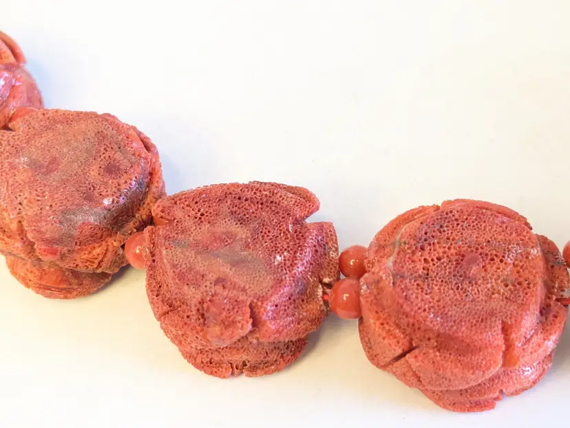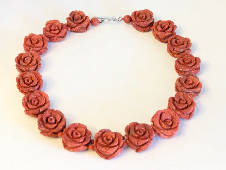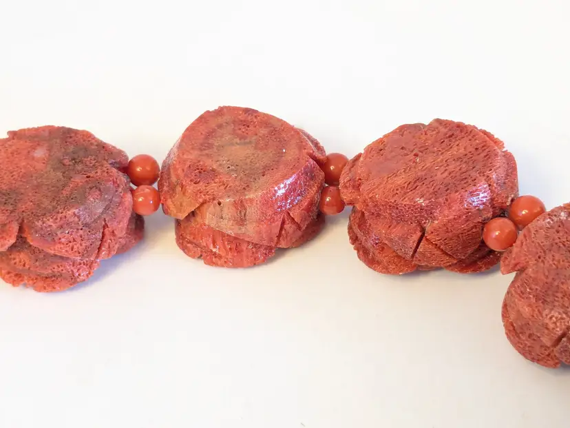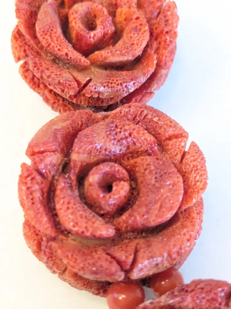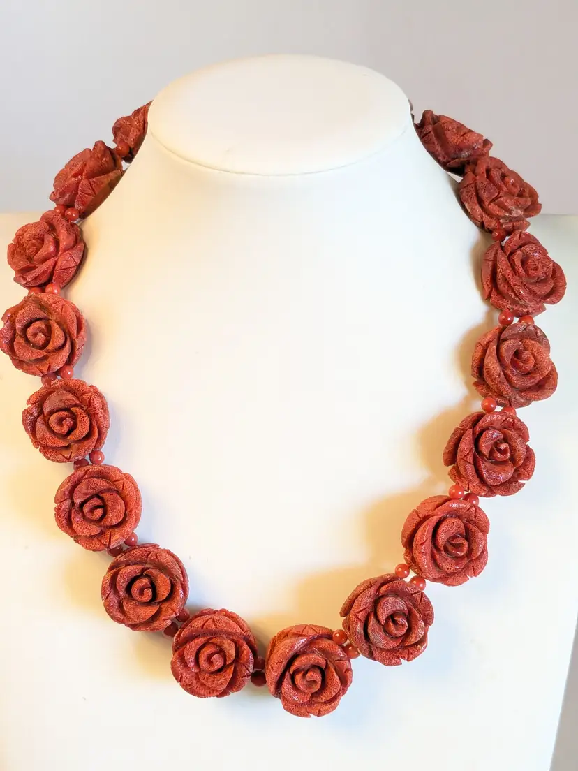 Absolutely fabulous! Good condition. Carved sponge coral red rose necklace with a silver tone toggle clasp. Measures 16". Roses are 7/8" x 7/8". wen