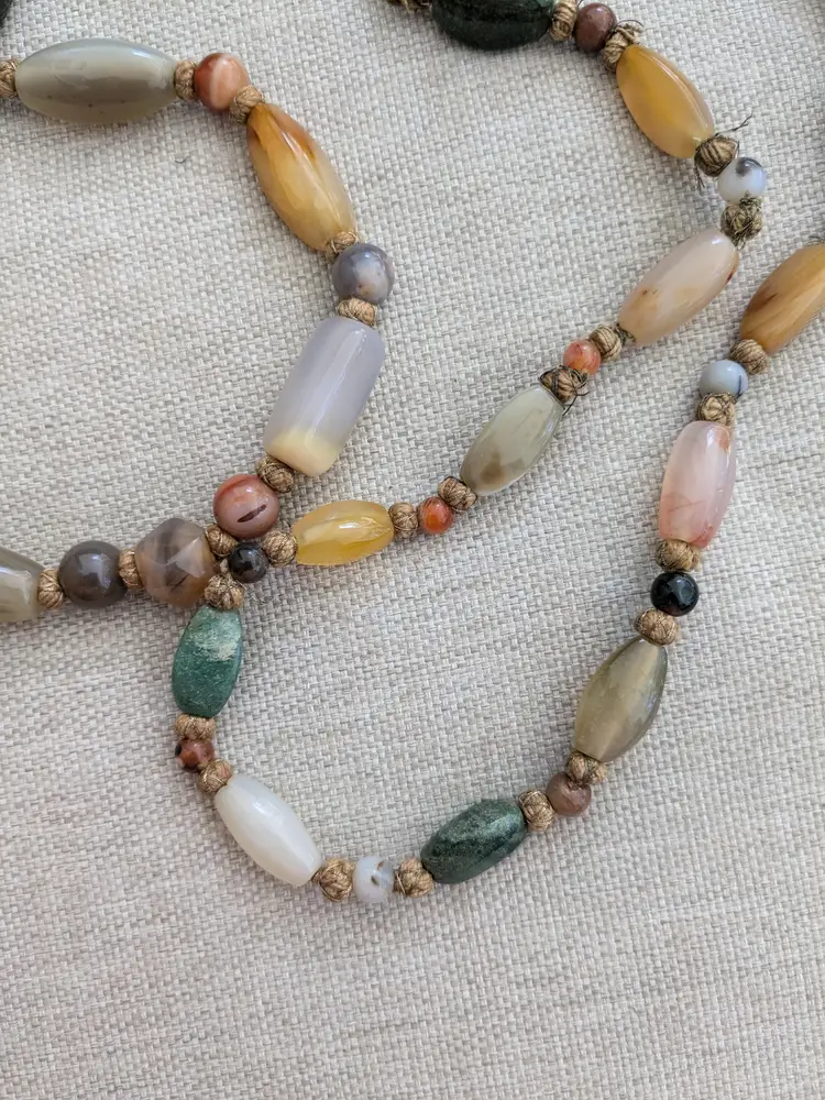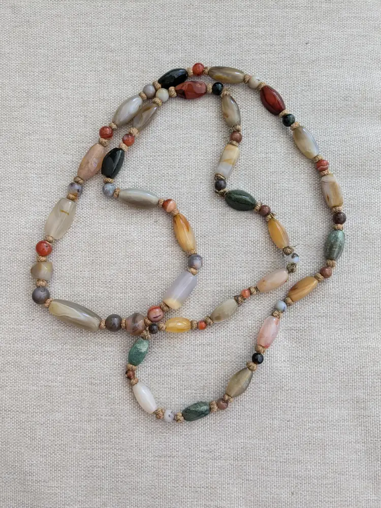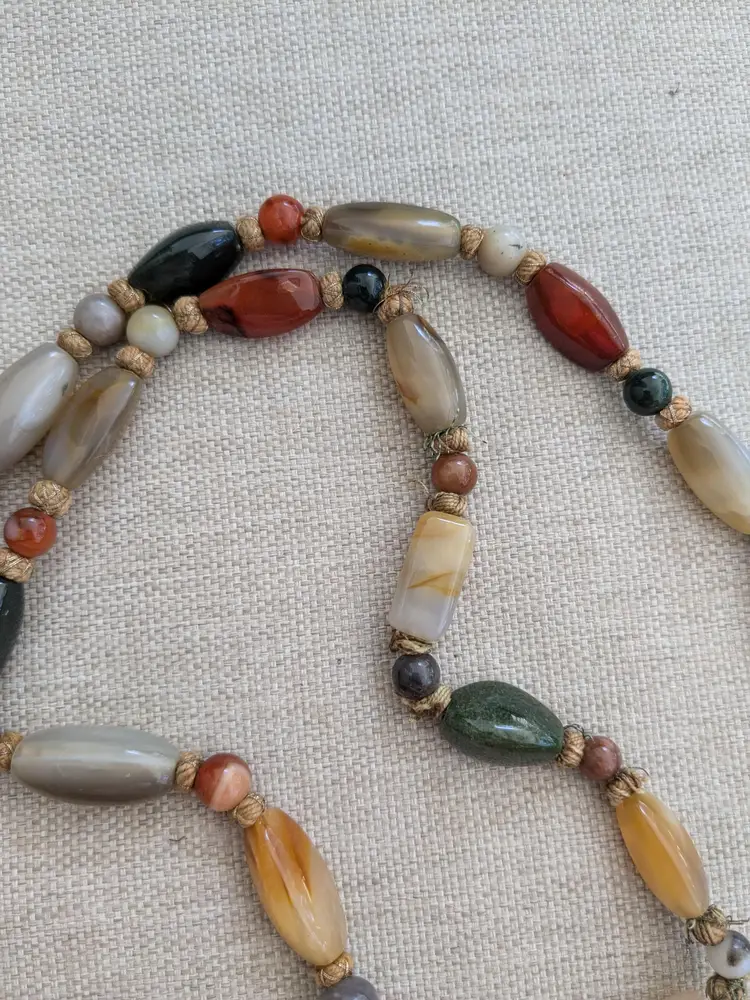 46" long. Agate, quartz, carnelian, and jasper. Excellent condition, unmarked