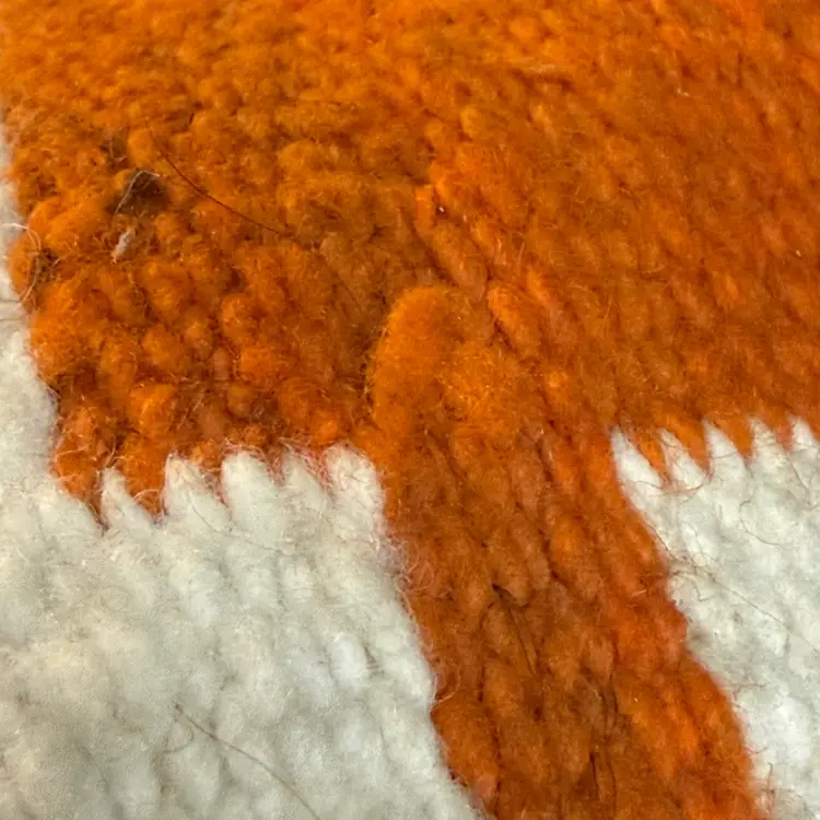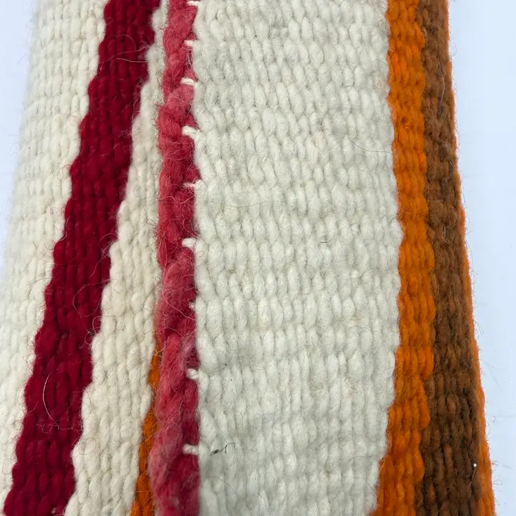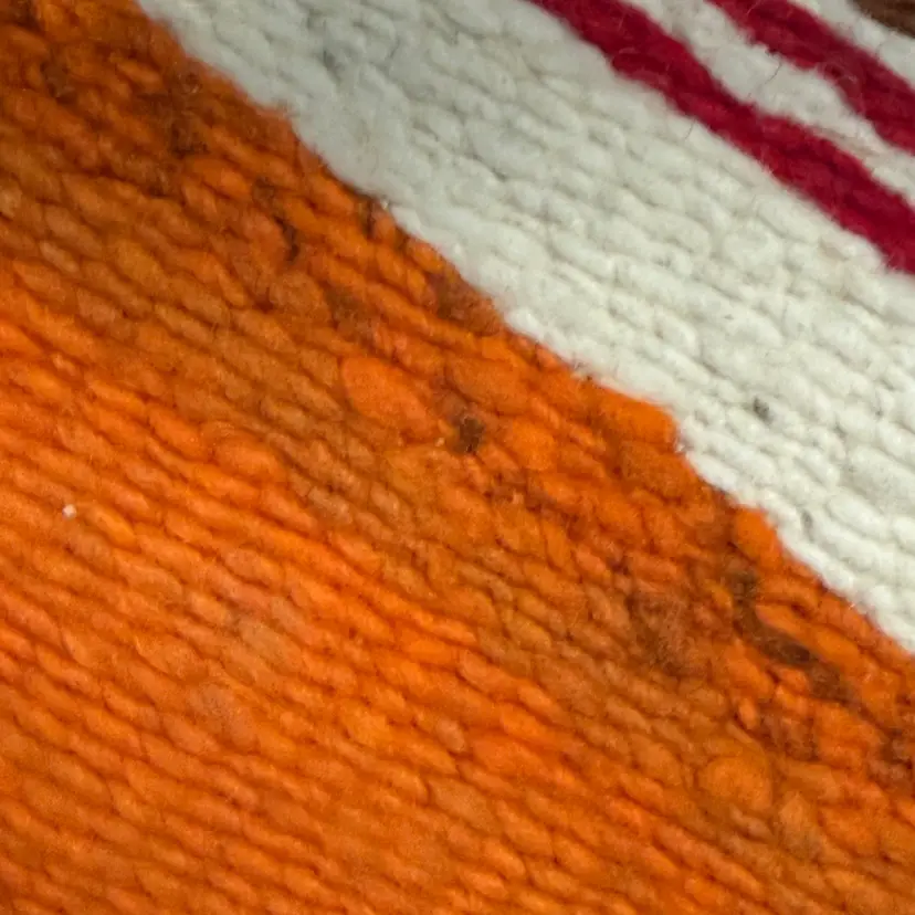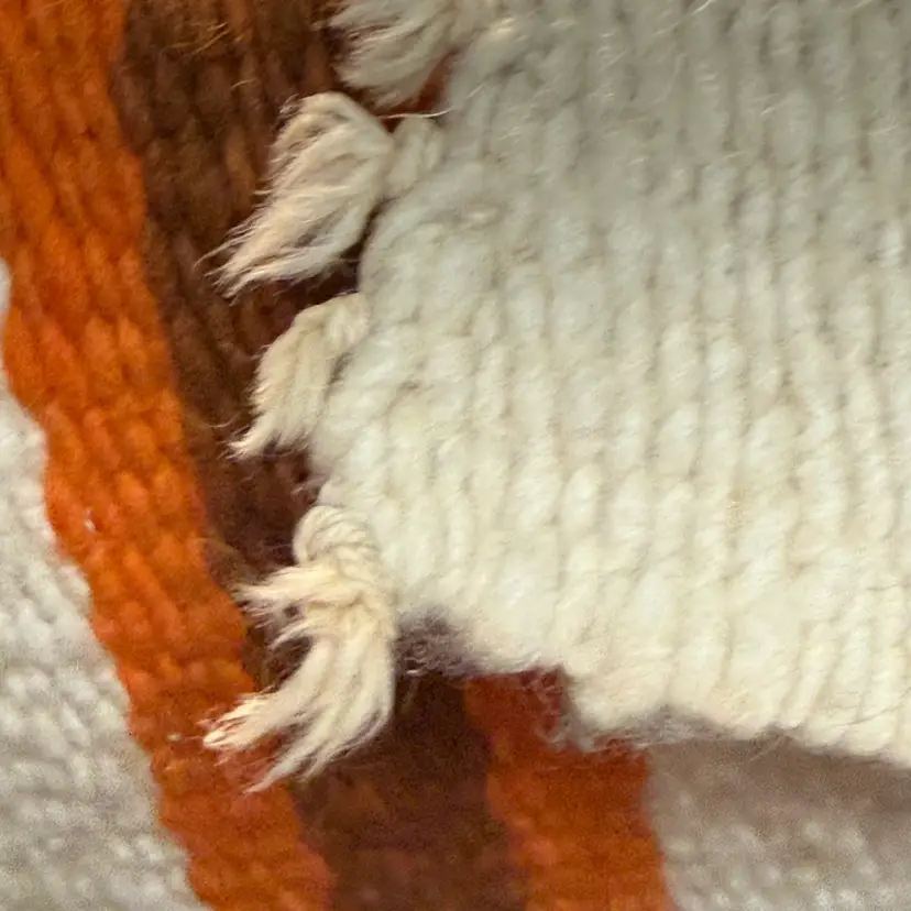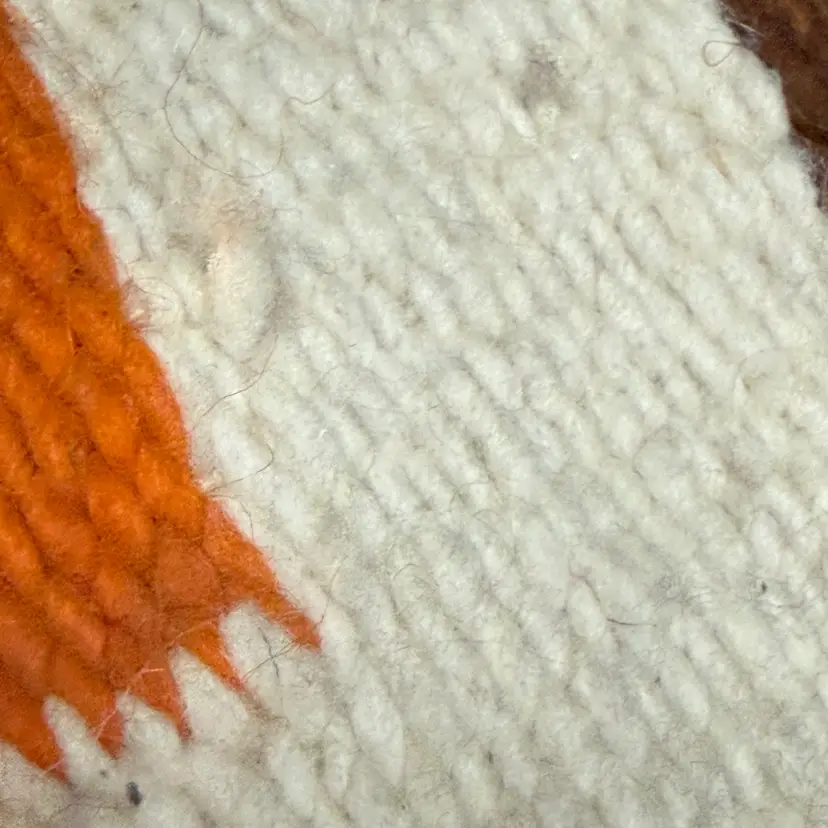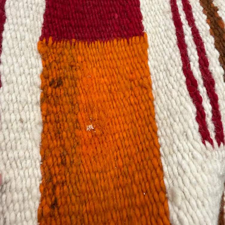 In overall good condition. There is slight discoloration in spots on the rug and some pilling. Does not have any rips or tears. Rug will need some care and cleaning. Measure 17 inches tall and 30 inches long.