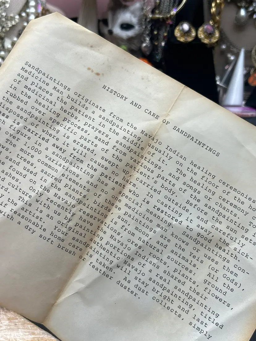 Sand painting is an ancient Navajo art form rooted in healing ceremonies, where symbolic designs were created with colored sands to invoke spiritual protection and harmony. Modern adaptations like this piece carry forward those traditions as collectible wall art.