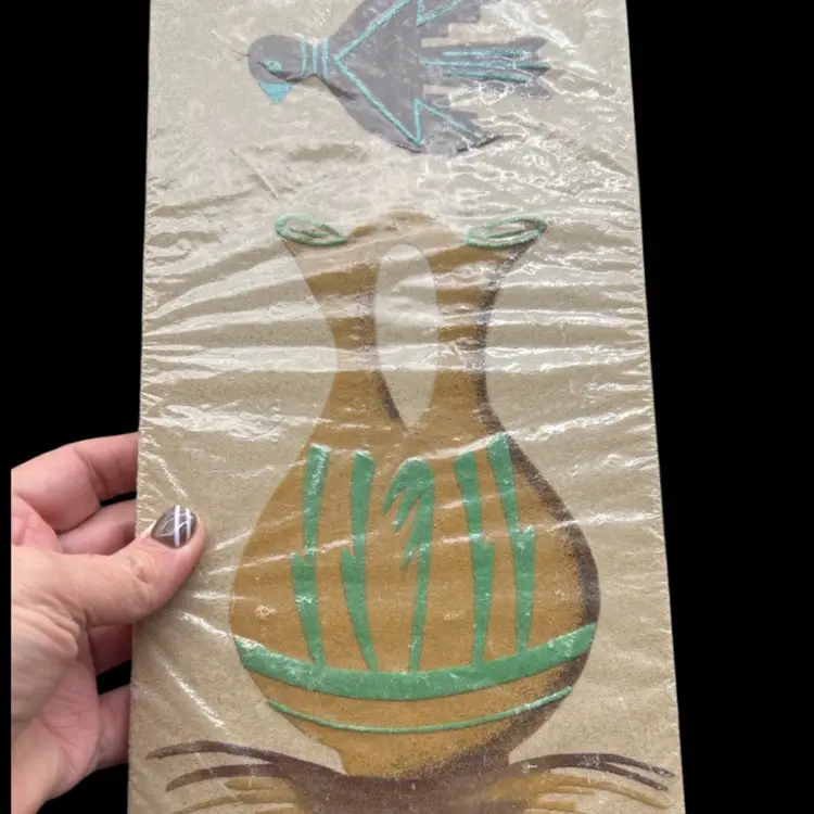 🔎 Notable Details • Authentic Navajo sand painting • Signed by artist J. Garcia on the reverse • Depicts bird and wedding vase imagery in turquoise, brown, and earth tones • Size: 12” tall x 6” wide • Includes typed history/care sheet • Wrapped in plastic for preservation