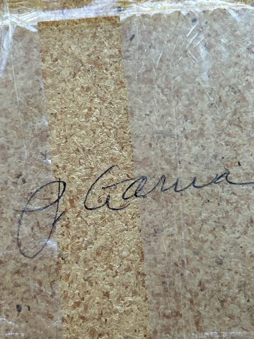 This striking Navajo sand painting is a traditional Southwest Native American artwork, measuring 12” x 6” and signed by the artist J. Garcia. Created using hand-colored sand, the piece depicts a double-spout wedding vase and bird motif, symbolic in Navajo culture of unity, balance, and blessings.
