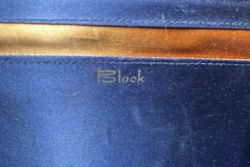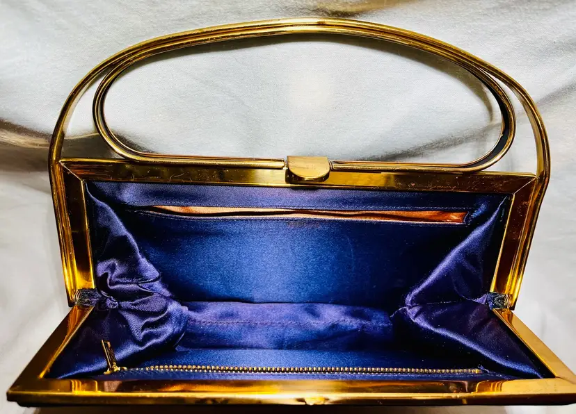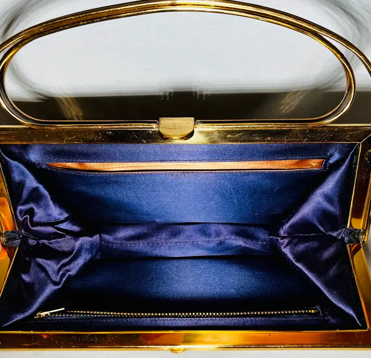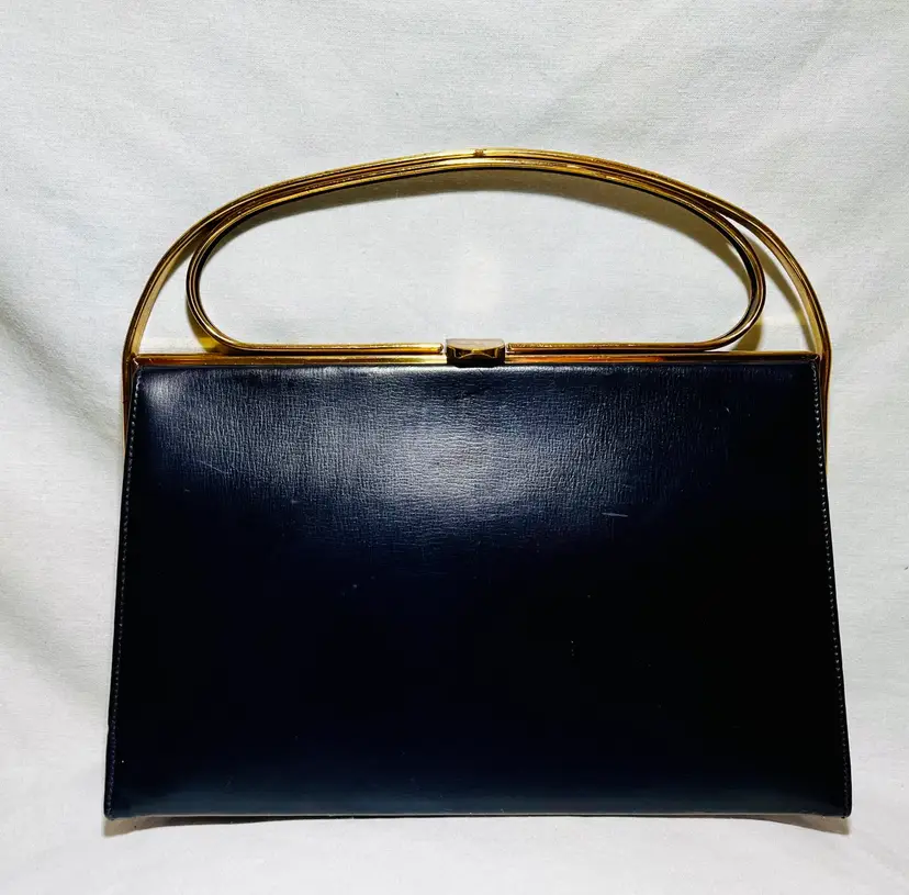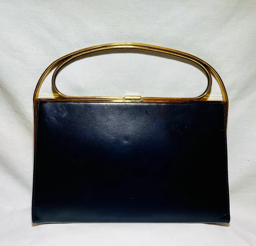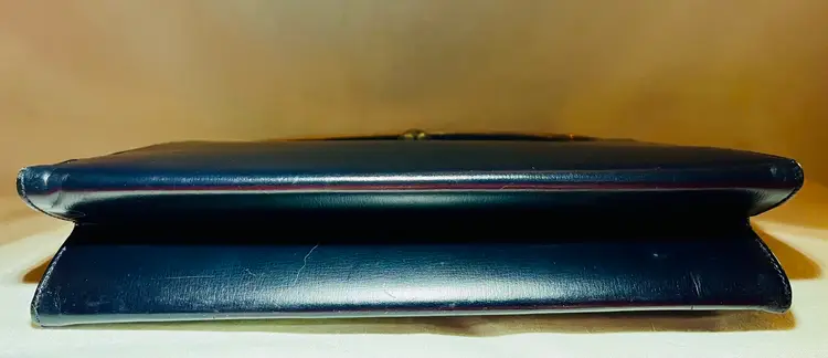 Sleek navy blue leather structured clutch handbag with gold tone metal and navy enamel handle! Made by Block. Very little sign of use. Handle appears to be very slightly misshaped. Hard to tell. About 9” tall with handle (6” without) and base is 9 1/2” x 3” when open. Will be well packed for shipping by an experienced seller.