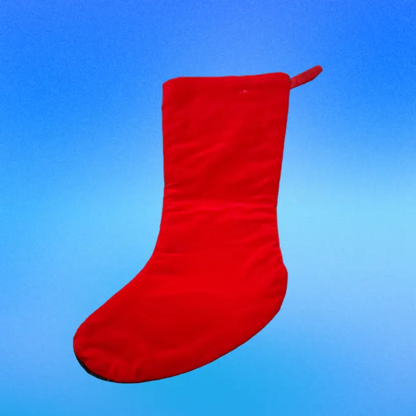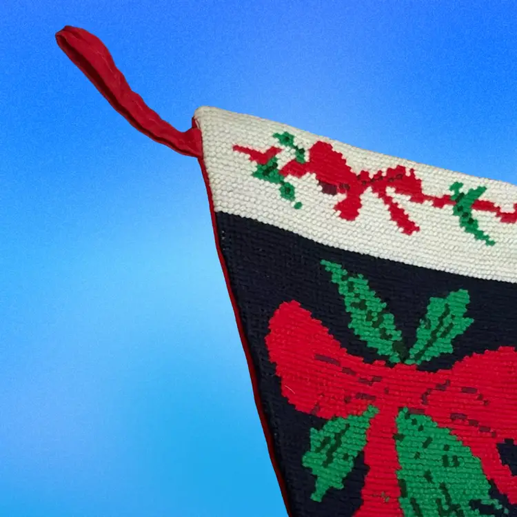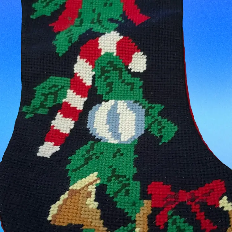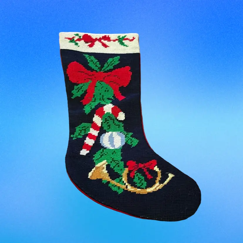 Navy blue background with greenery, candy cane, ornament & horn. Back is red velveteen. Measures approximately 19” x 5.5”. In great condition!