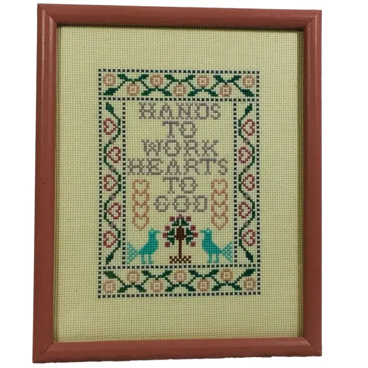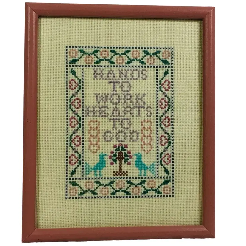 Framed 10.5” by 8.5” completed needlepoint crewel picture of watermelon and alphabet. In a beautiful pink wooden frame, which has some nicks and scratches. Definitely shows its age but in a good way. The back of the frame shows minor tears from being moved around for so long. It adds character and is typical wear of items of this age. Please review photographs as they are part of the description. Sold as is. Looks very cottage 80s decor.