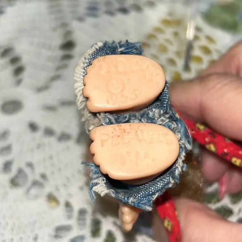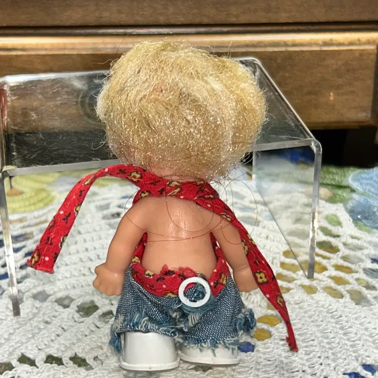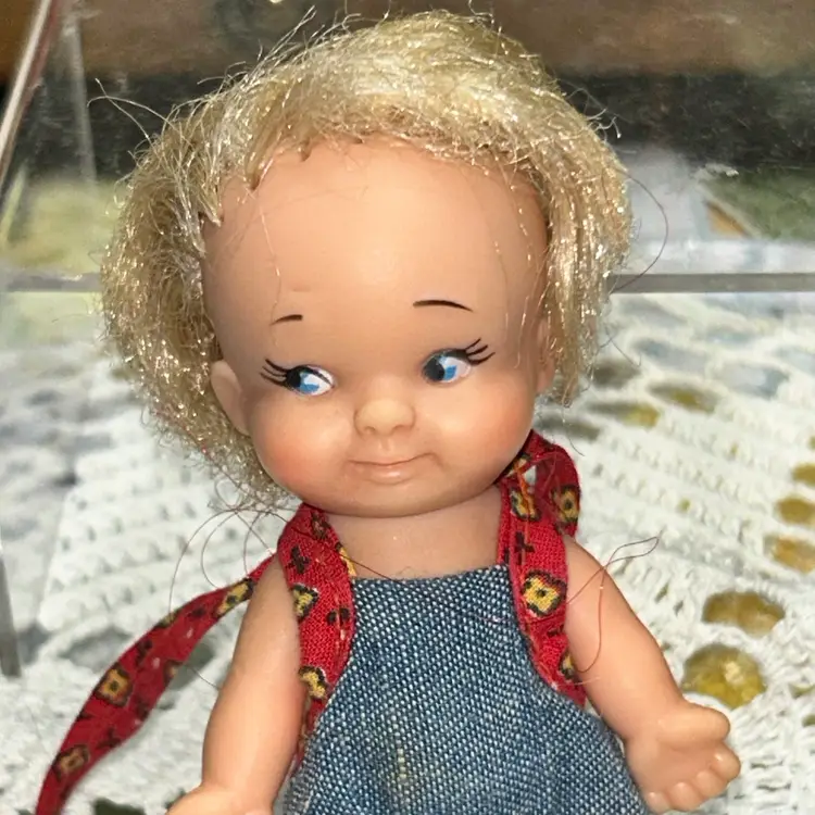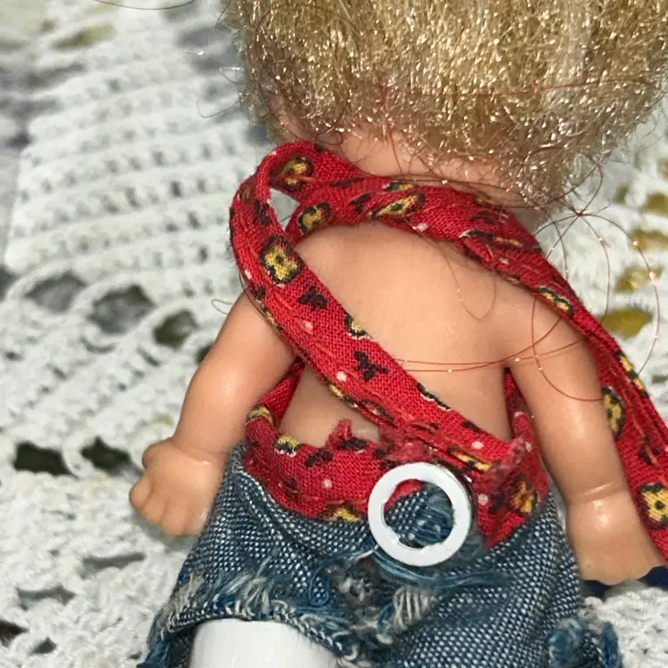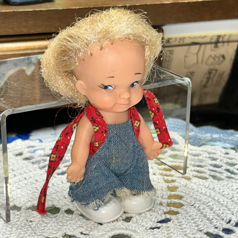 3.25” tall. Country, overall clothes. Suspenders are halter-type that tie at neck Very clean, without any marks. Manufacturing information, including date is on the bottom of the feet. See photos. 1965
